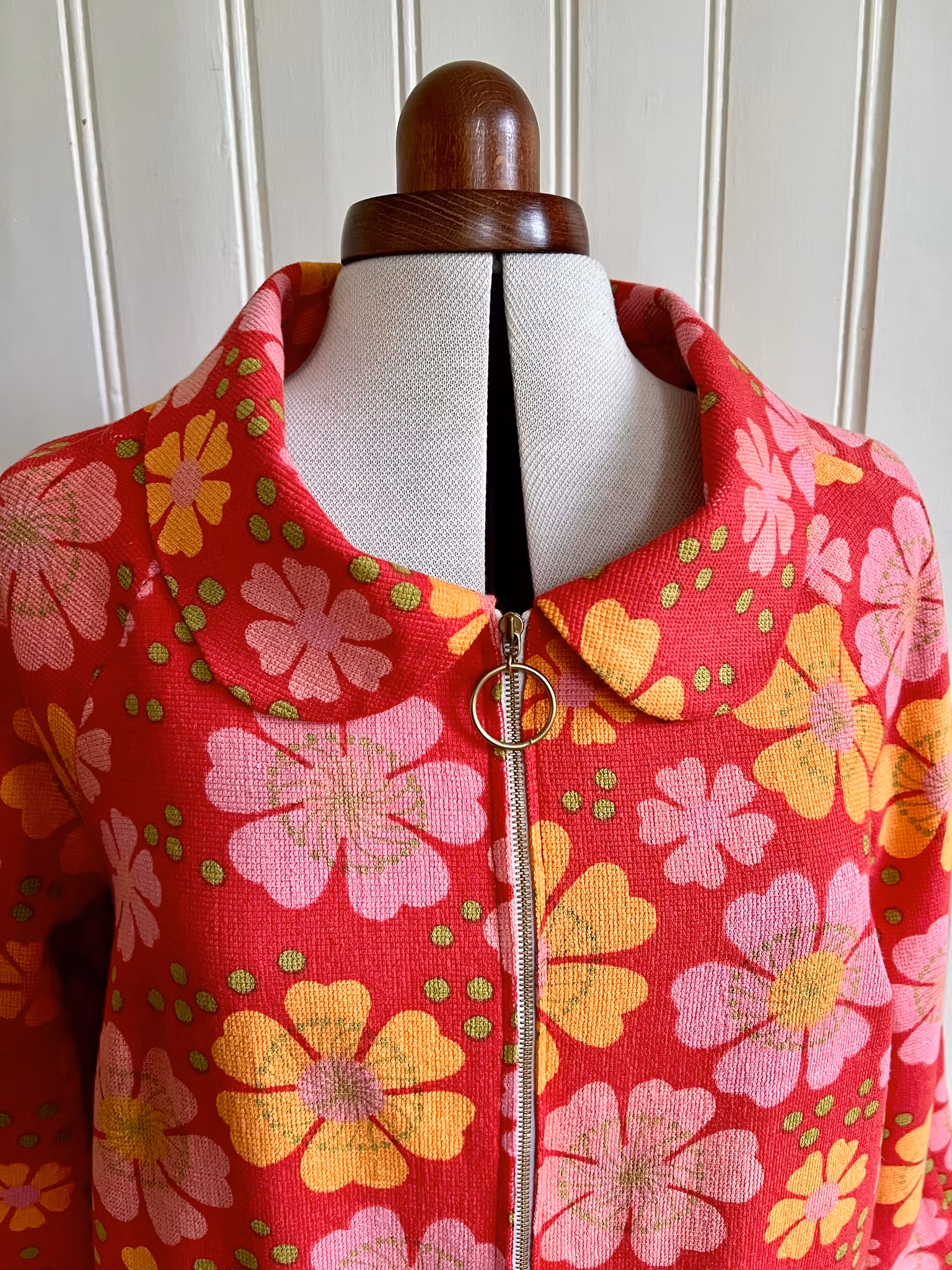 Klänningen har en härlig rundad krage, lite större än på modell Mirjam. Den har också en ringdragkedja i metall framtill, även den äkta retro.