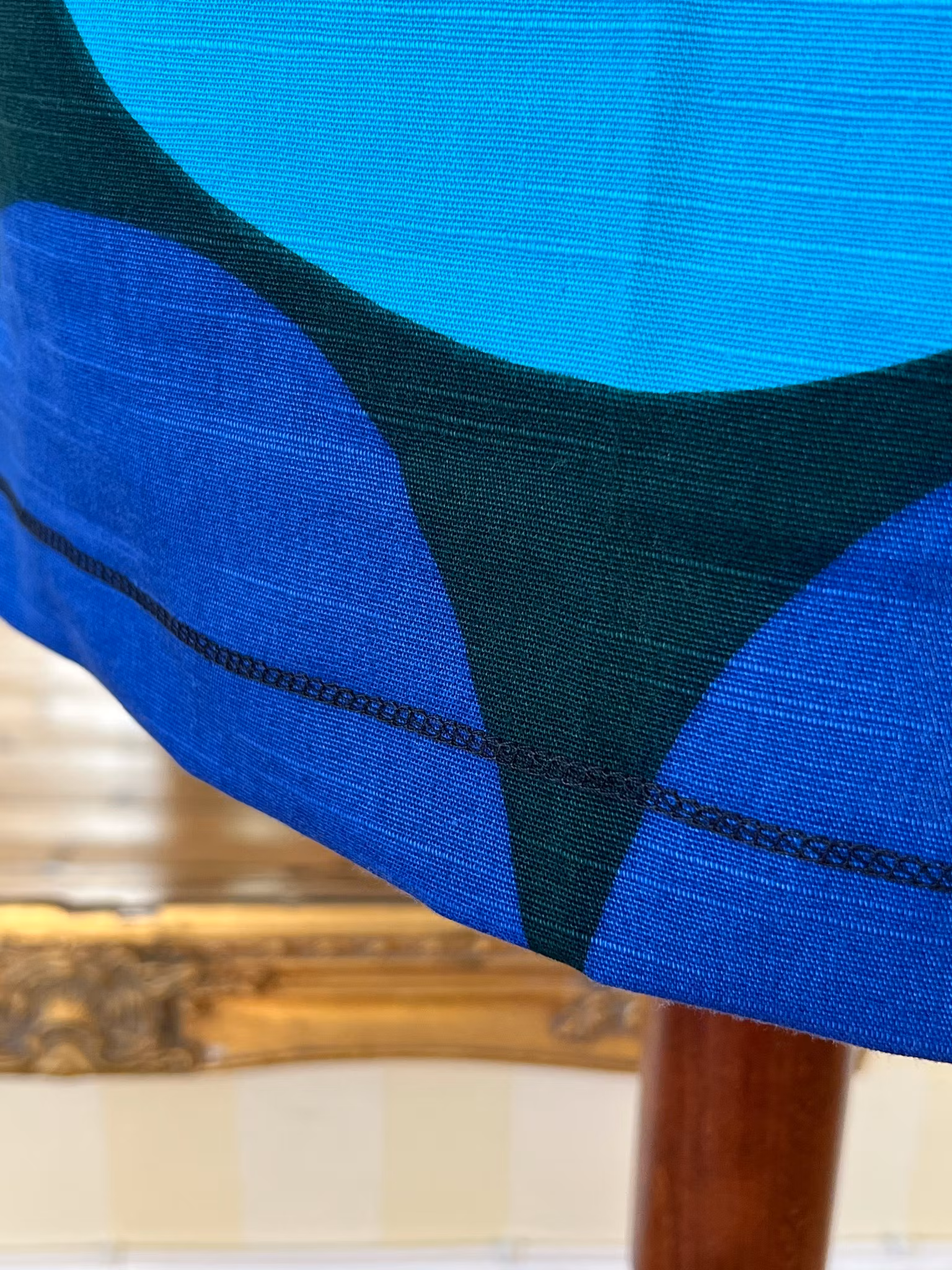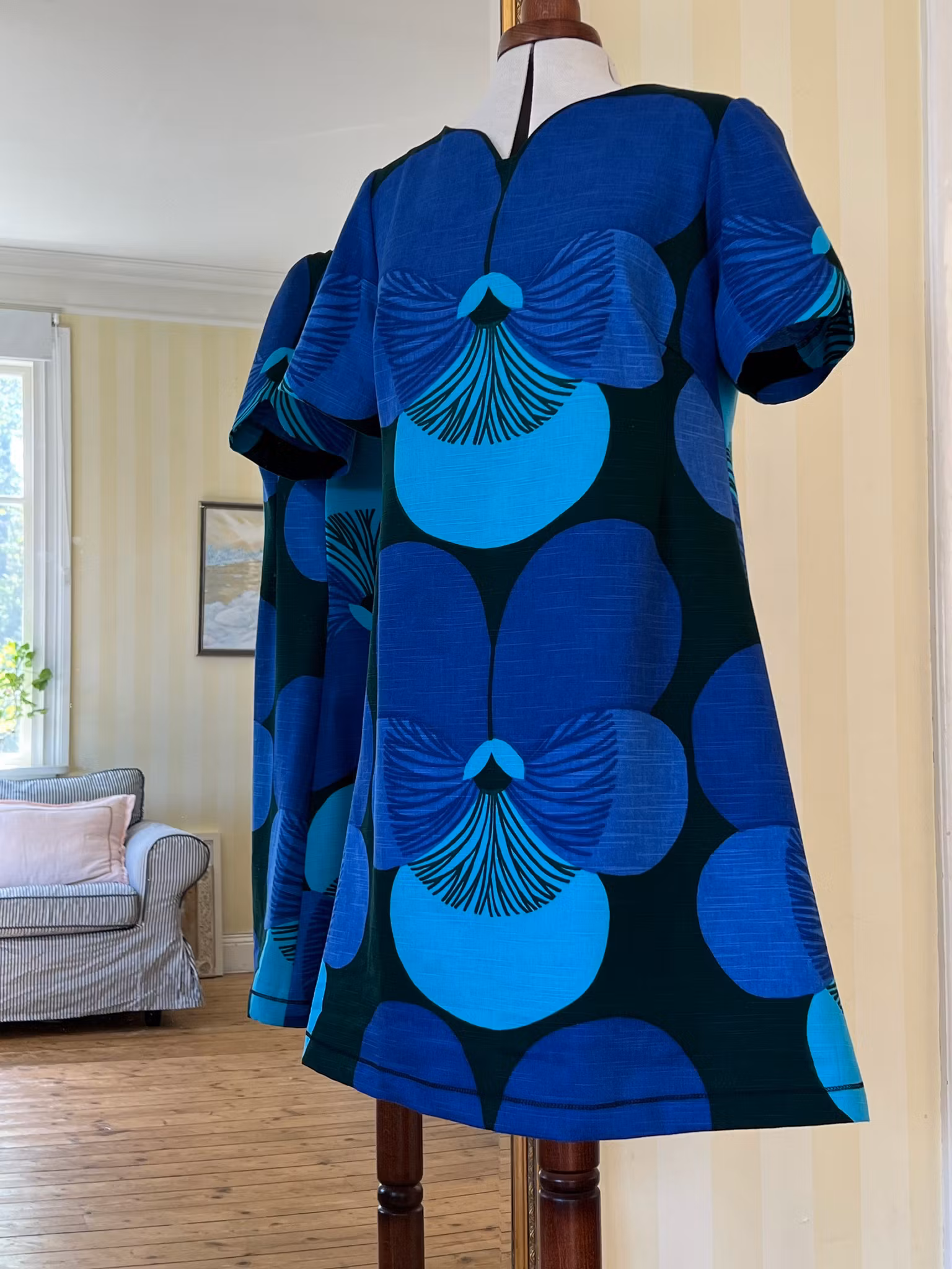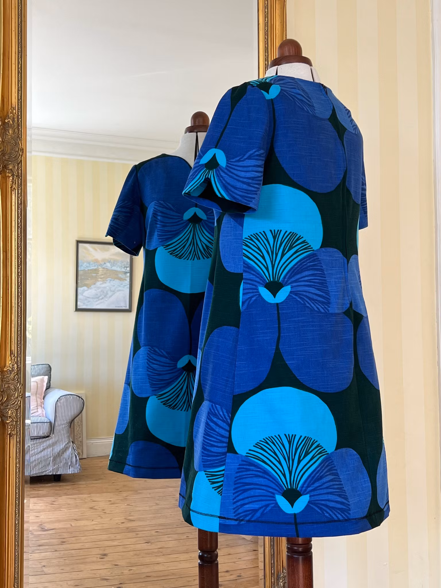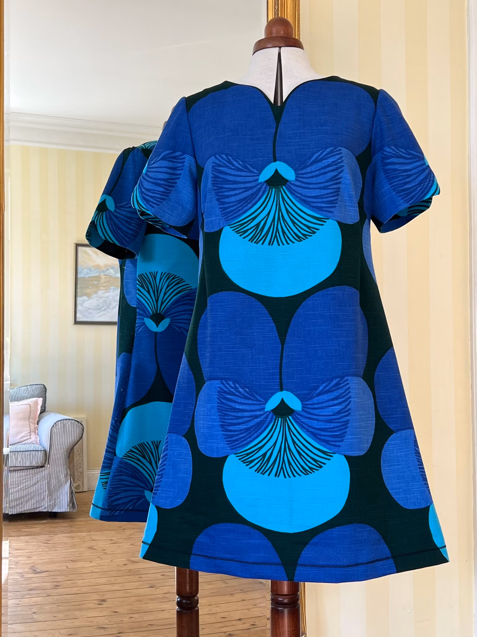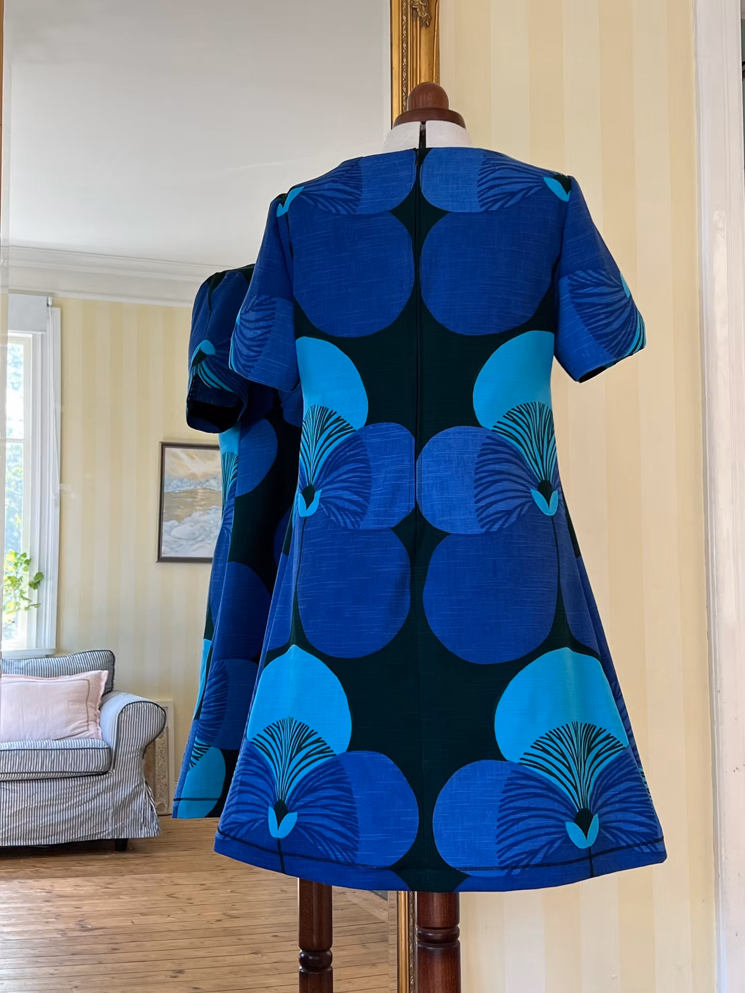 Klänning sydd i ett unikt retrotyg i vävd bomull från 1960- eller 70-talet.