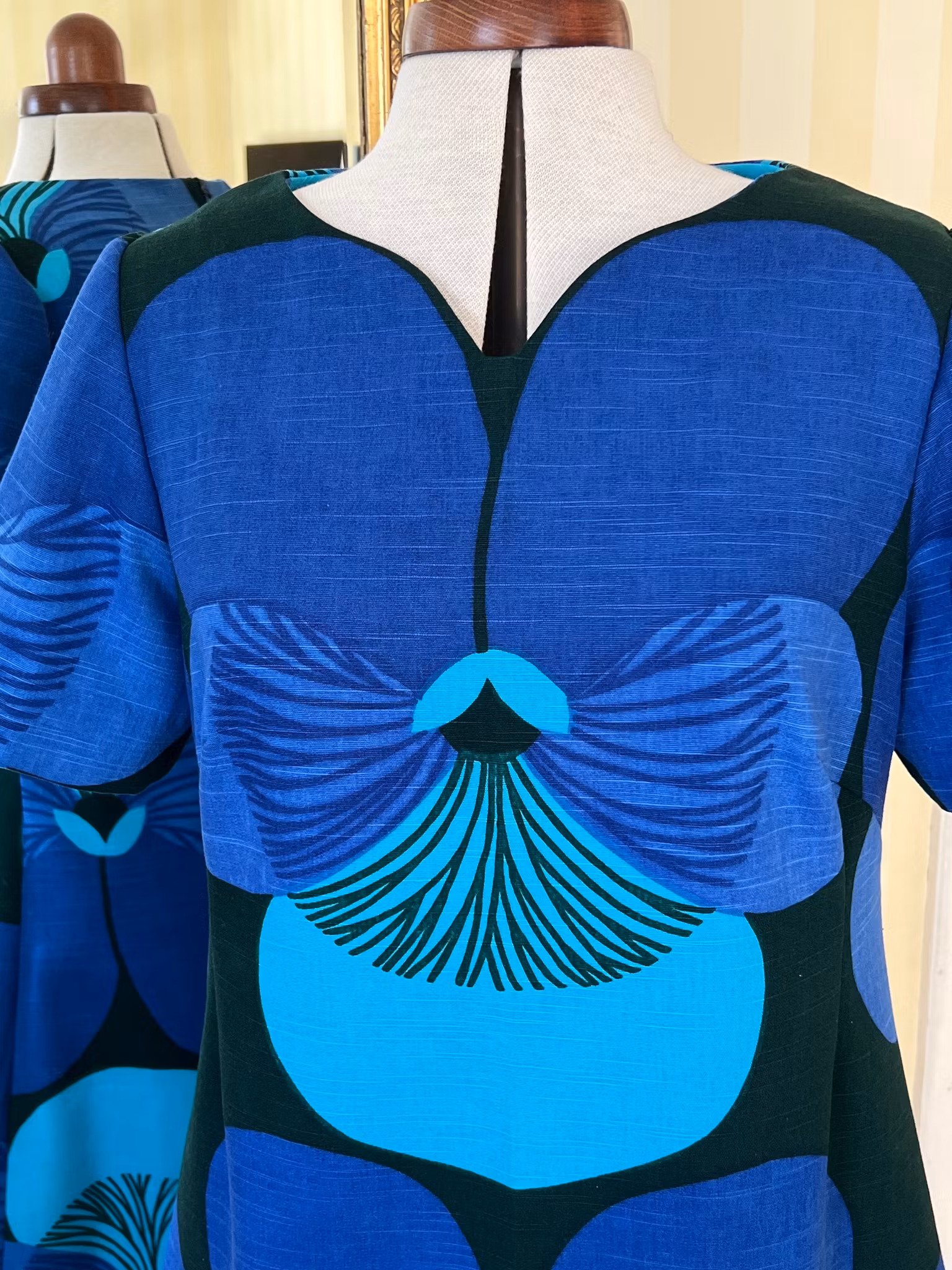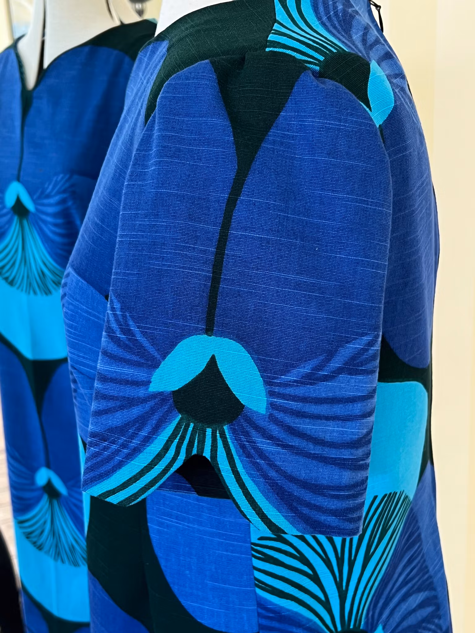 A-linjemodell som går in något i midjan, med små insnitt. Omsorg om detaljerna, där ringningen i hals och ärmslut följer blommans välvda form. Dold handsydd fåll i ärmslutet. Fållad med coverlock nertill.