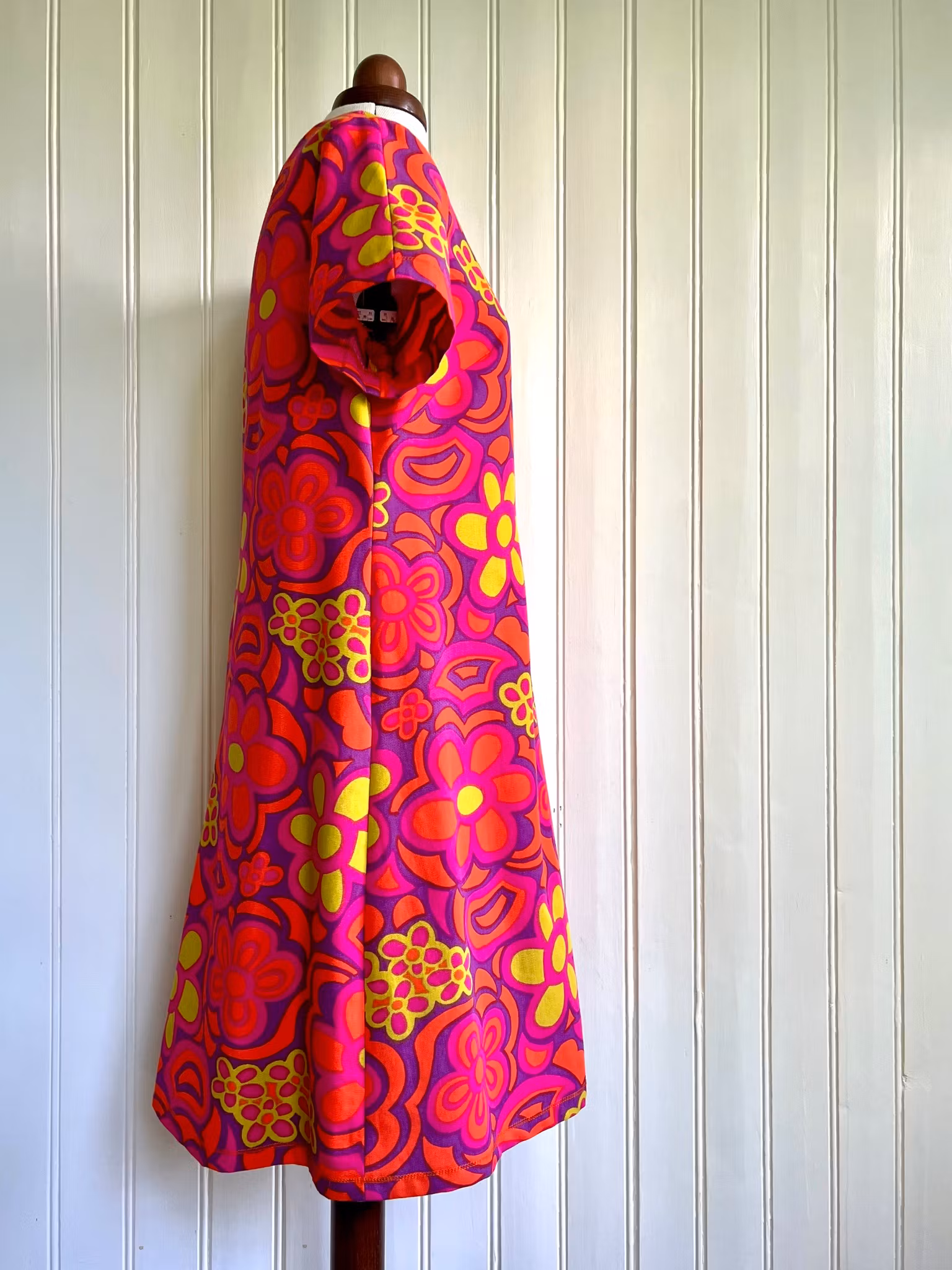 Klänning i A-linjemodell, sydd i ett äkta retrotyg från 1960- eller 70-talet. Klänningen har en ringdragkedja framtill, kort ärm och lite djupare ringning. Tyget formligen lyser av färg och är i ett mycket fint skick - troligtvis oanvänt. Materialet är mellankraftig vävd bomull med en stadga som ger fin form åt modellen.