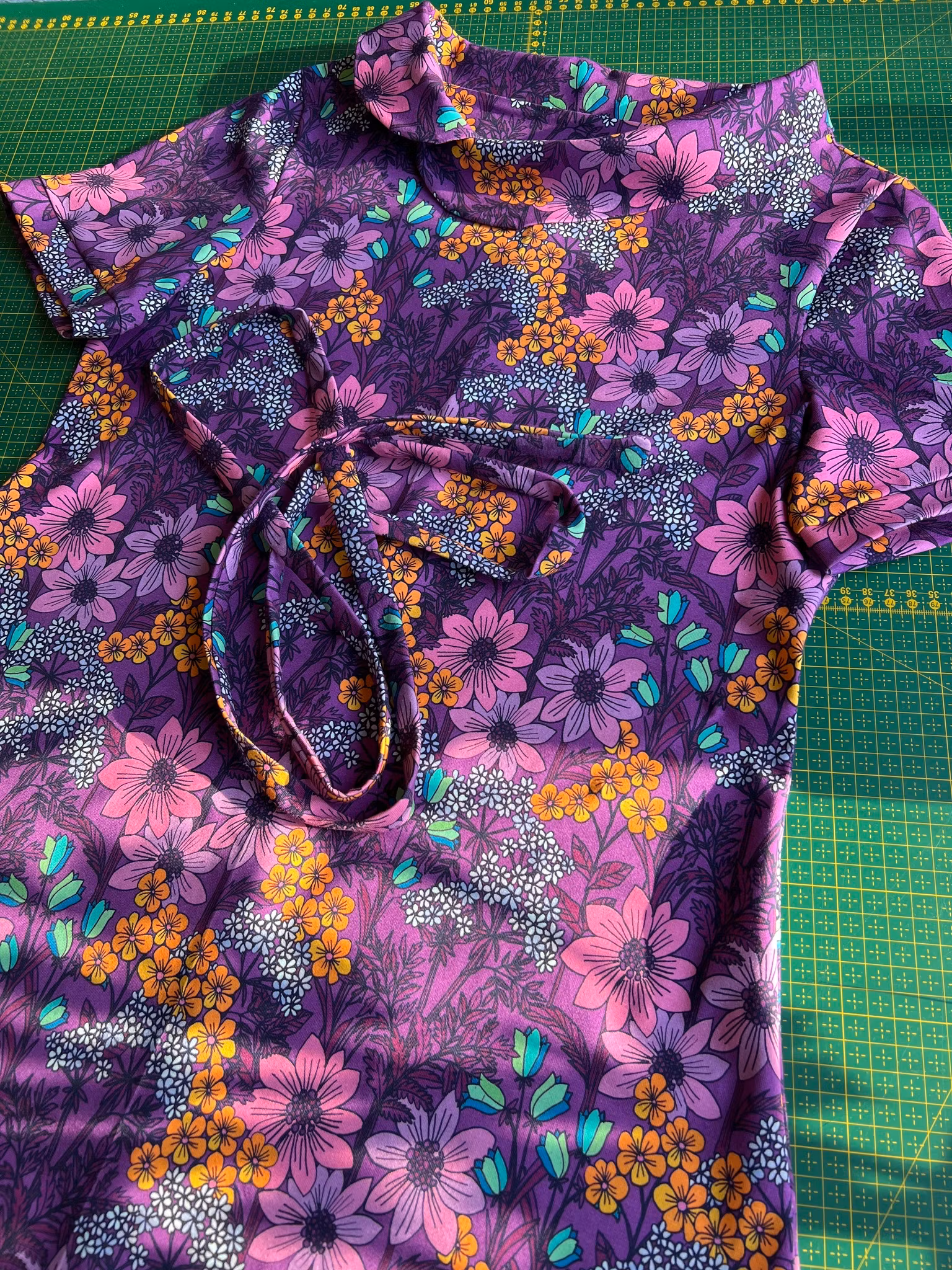 Klänning sydd i mjuk härlig bomullsjersey, i A-linjemodell. Den har en krage som går omlott och ett löst tillhörande skärp.