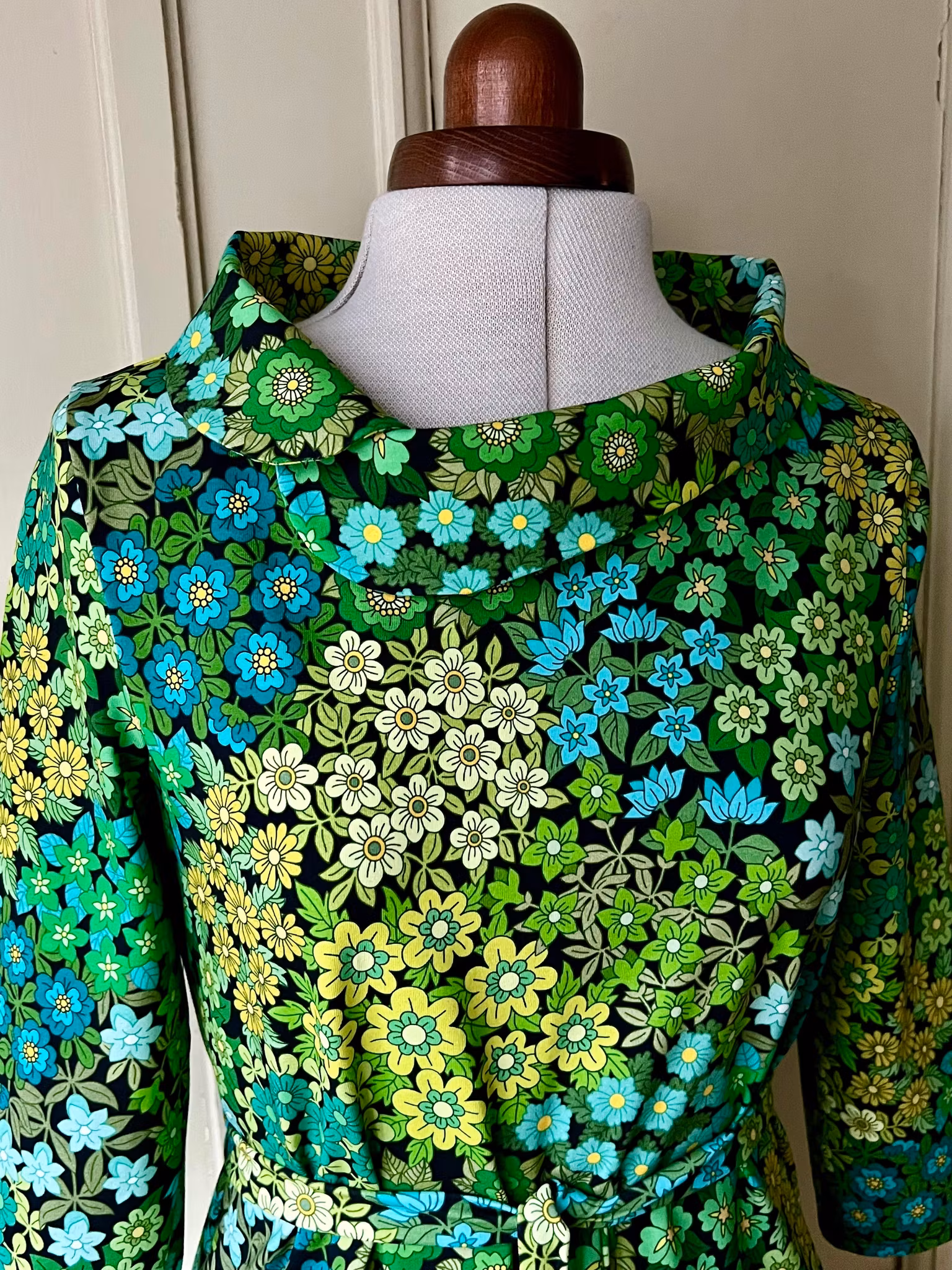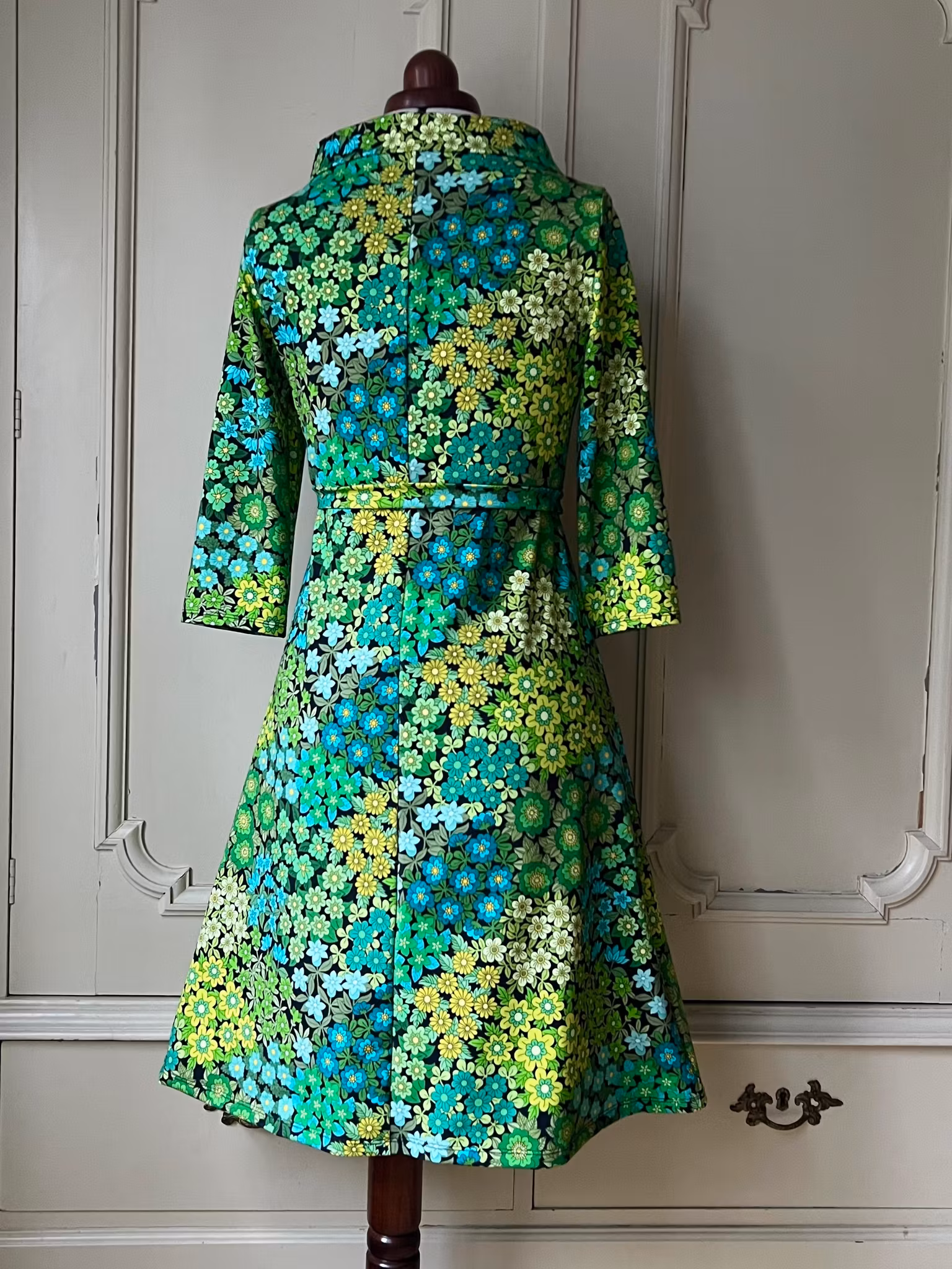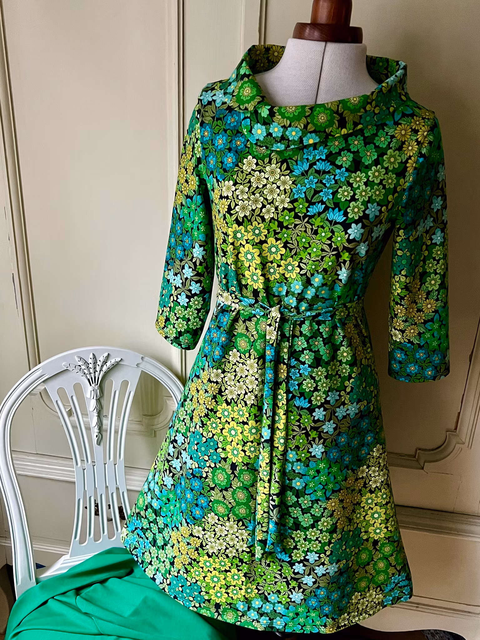 Klänning i A-linjemodell sydd i mjuk härlig bomullsjersey. Den har en krage i lite djupare ringning som går omlott och som är stärkt för att hålla fin form. Klänningen har en 3/4 lång ärm och ett tillhörande skärp.