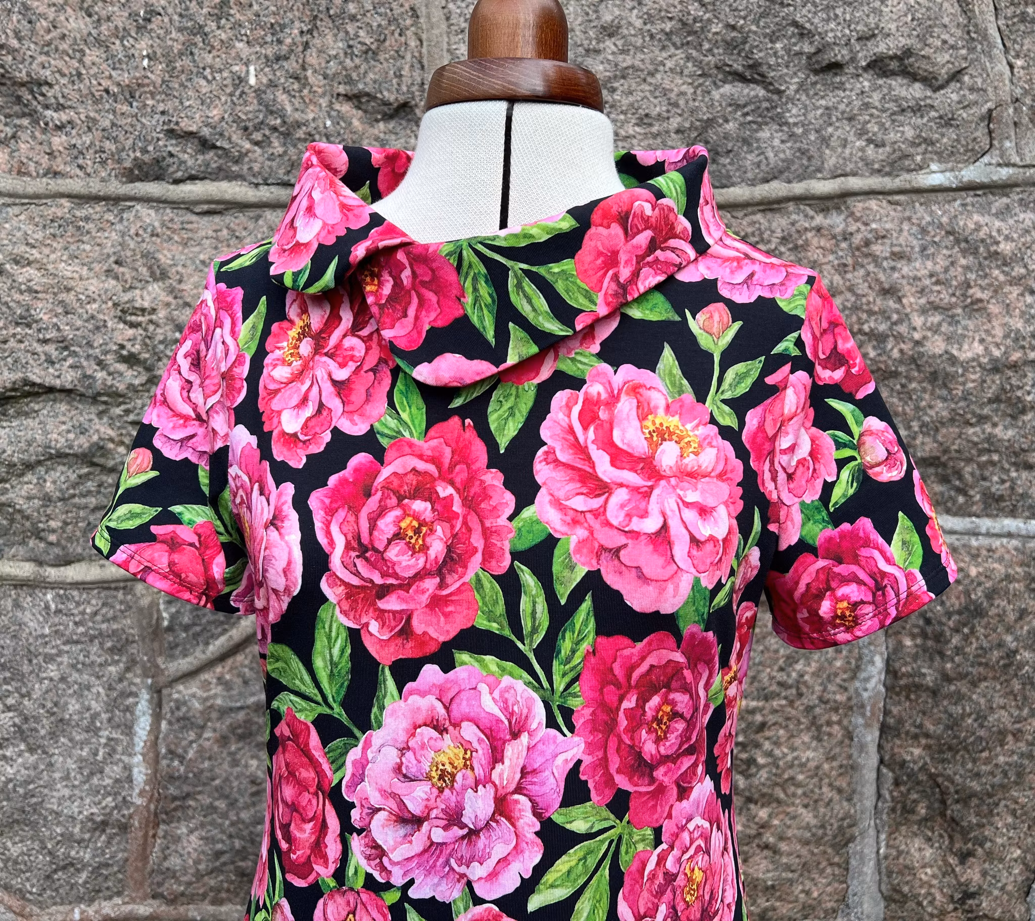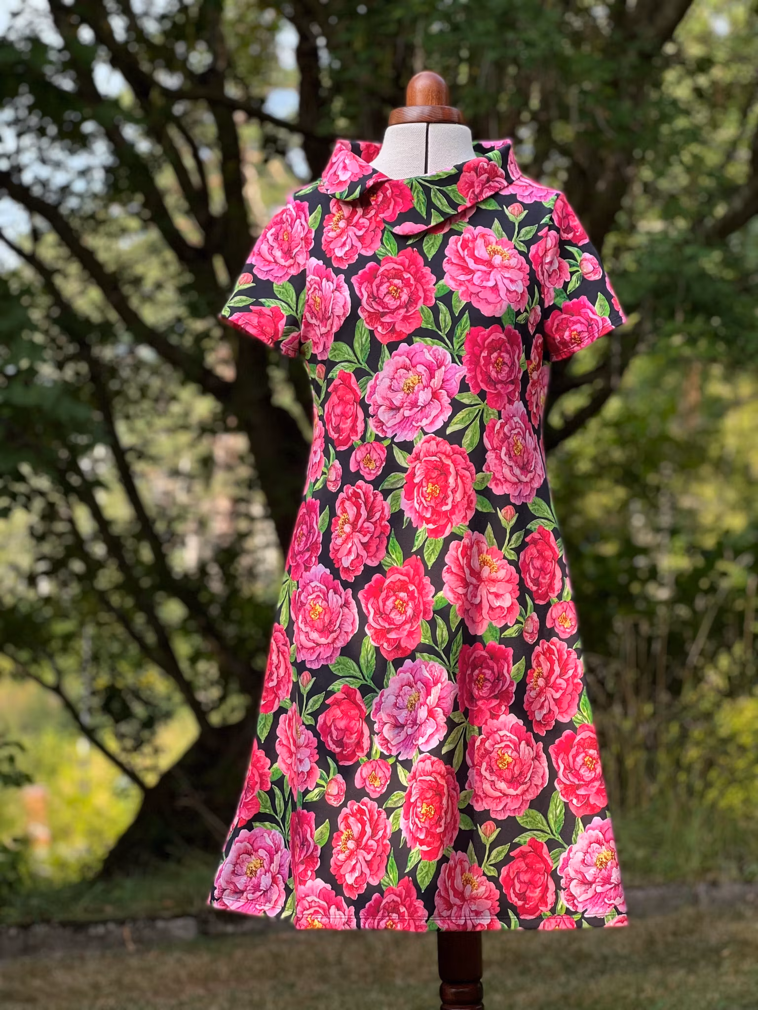 Unik klänning sydd i ett nyproducerat tyg i mjuk bomullsjersey. A-linjemodell med vacker omlottkrage. Tyget är designat av Linda Forsberg för Vintage in my heart. 95 % bomull, 5 % elastan. Gott om stretch.