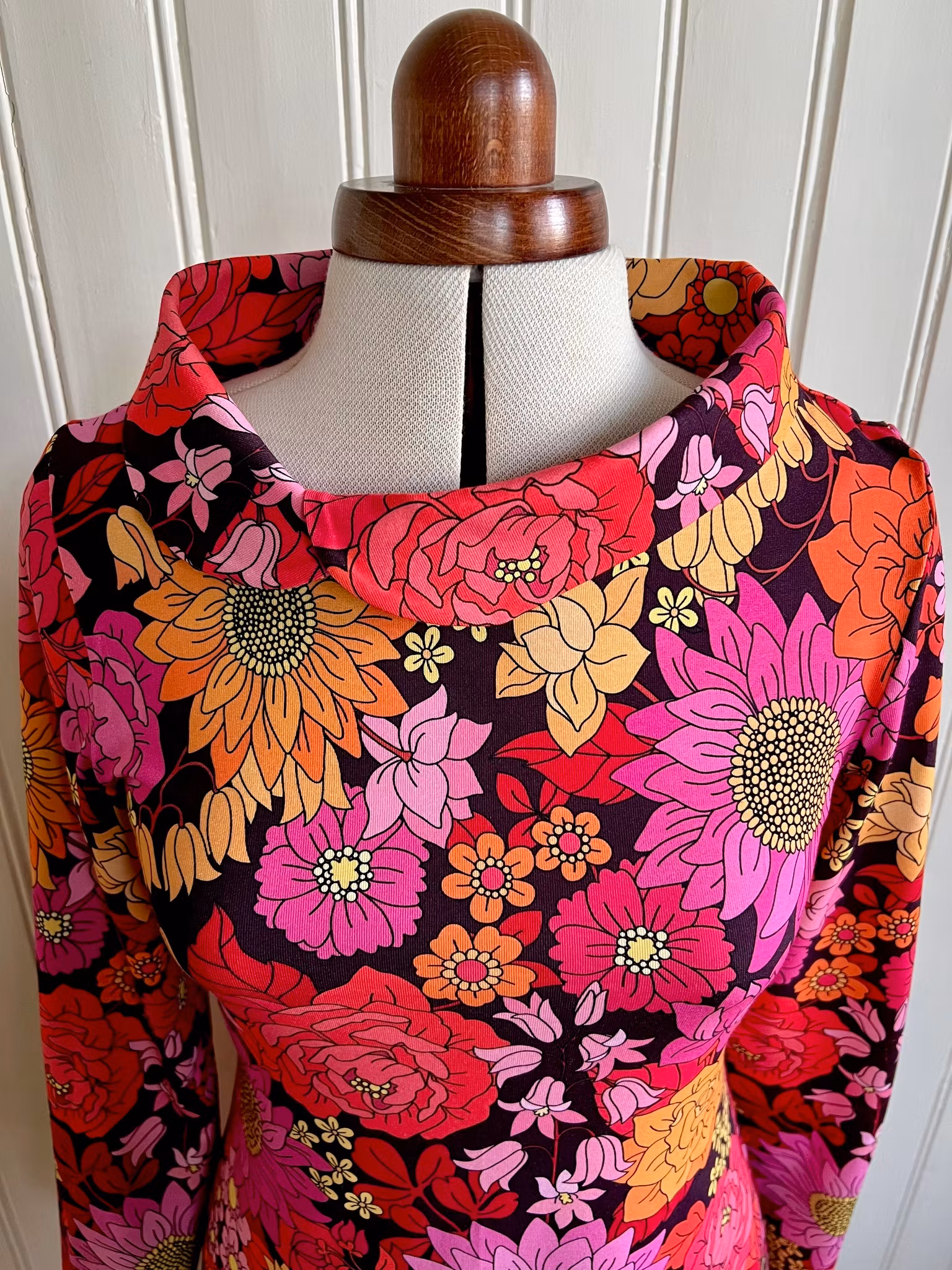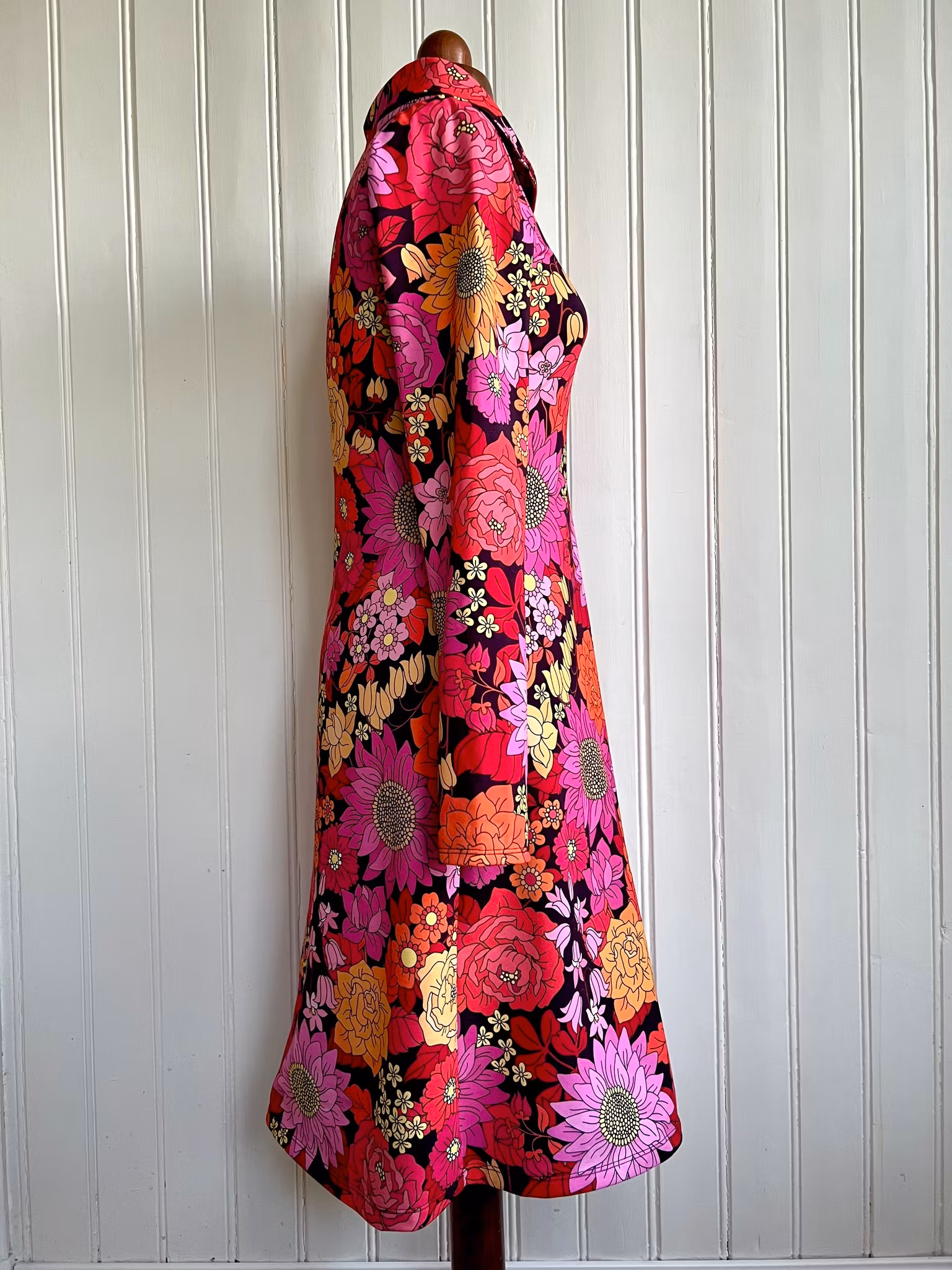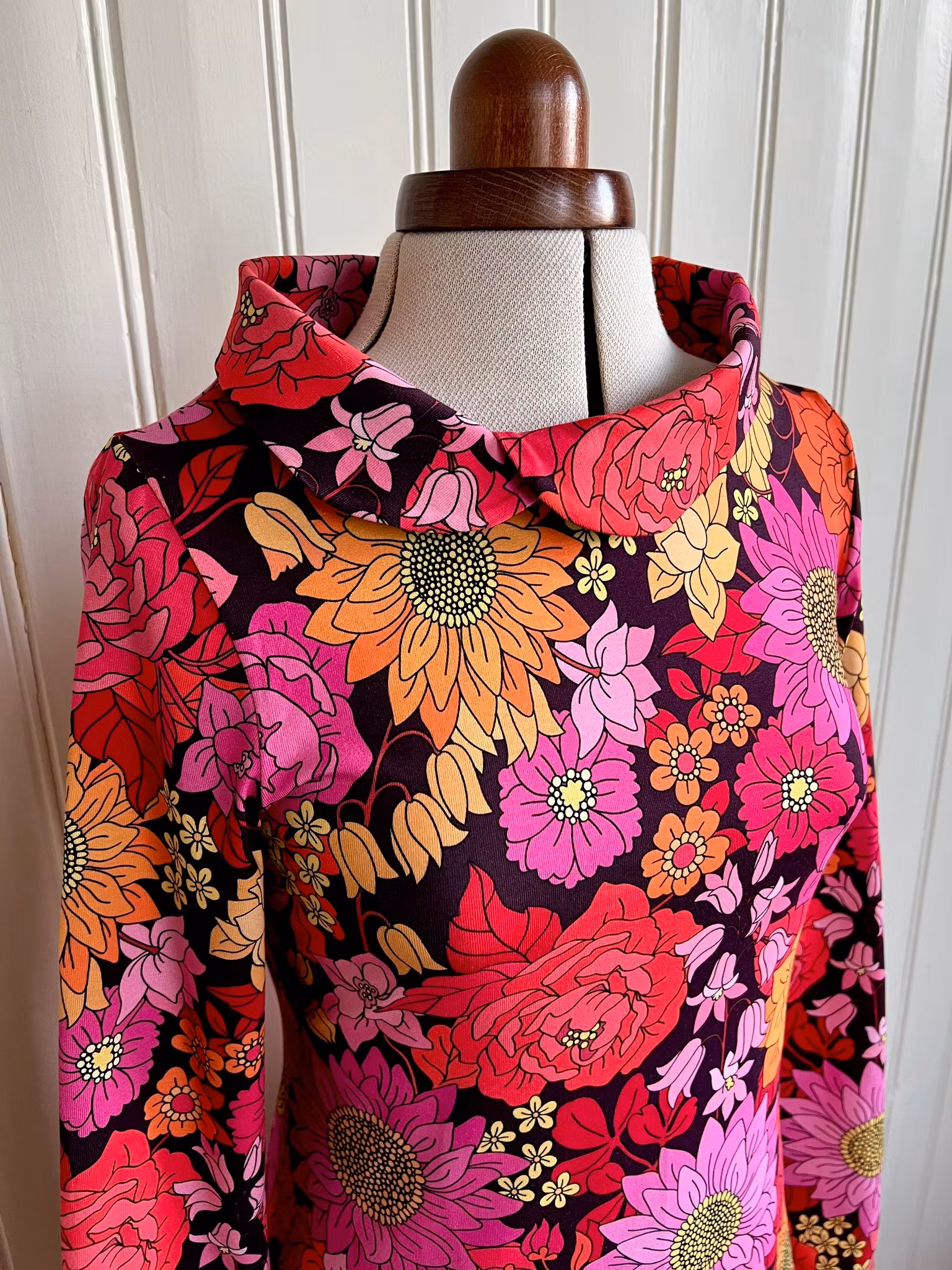Klänning sydd i mjuk härlig bomullsjersey, i A-linjemodell. Sitter åt mer upptill för att sedan få vidd över stussen och neråt. Den har en vacker lite vidare krage som går omlott i sidan framtill. Lång skön ärm som håller dig varm i vinter.