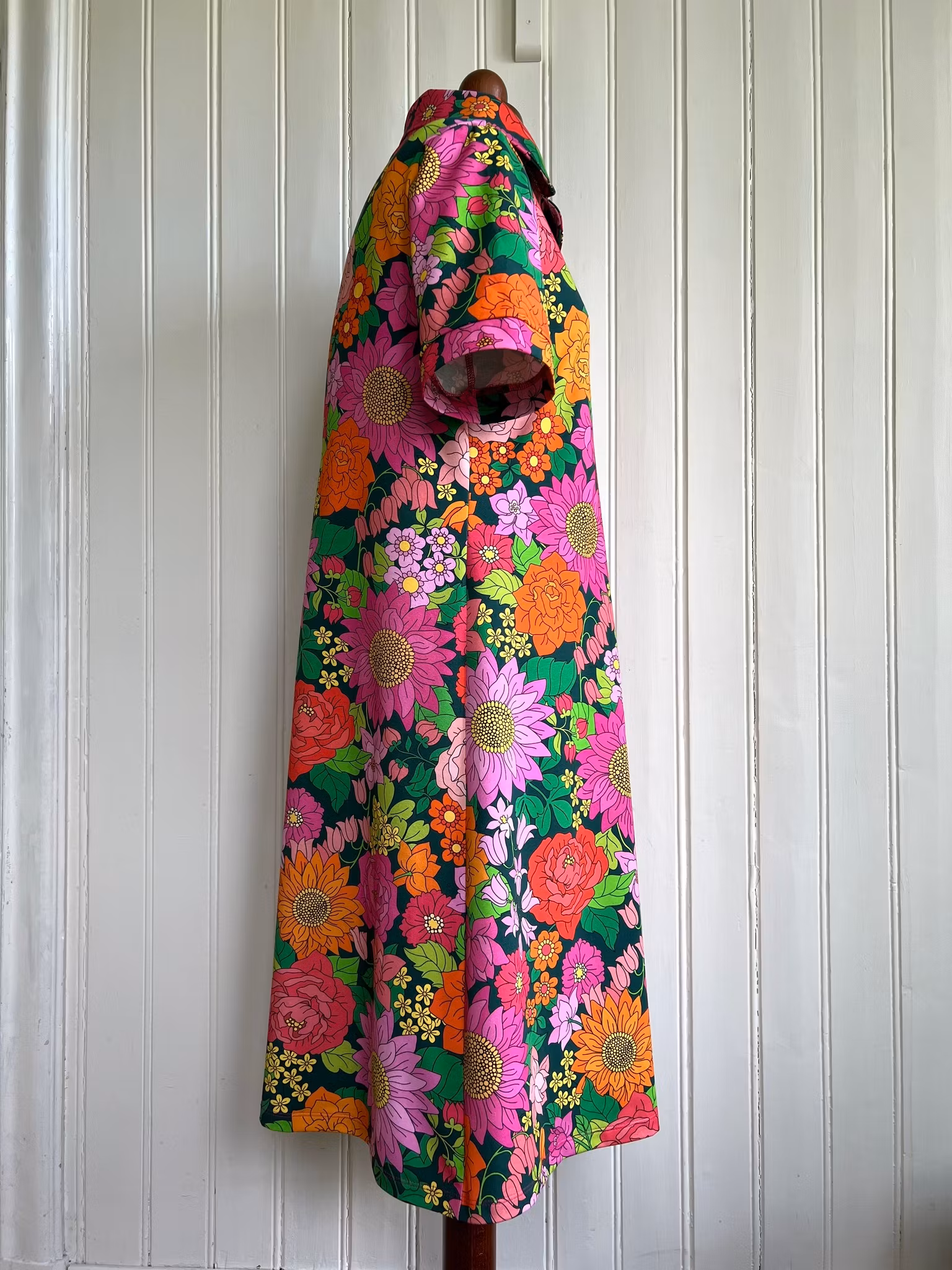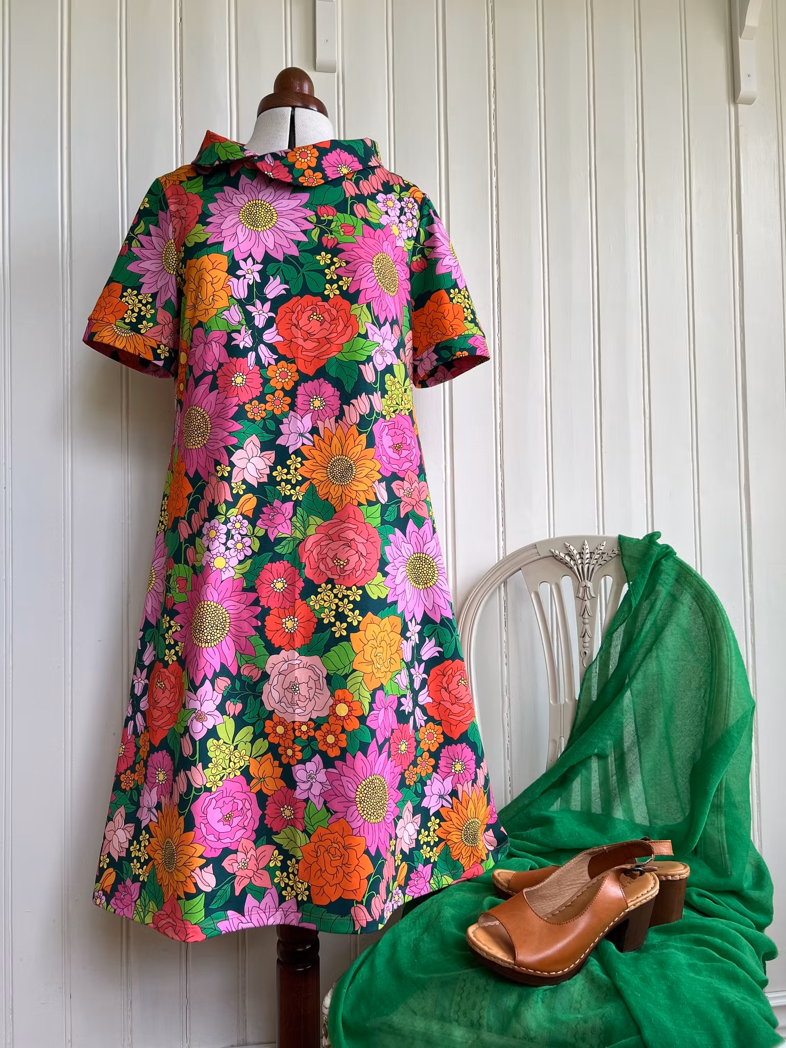 Klänning sydd i mjuk härlig bomullsjersey, i A-linjemodell. Den har en vacker lite vidare krage som går omlott i sidan framtill.