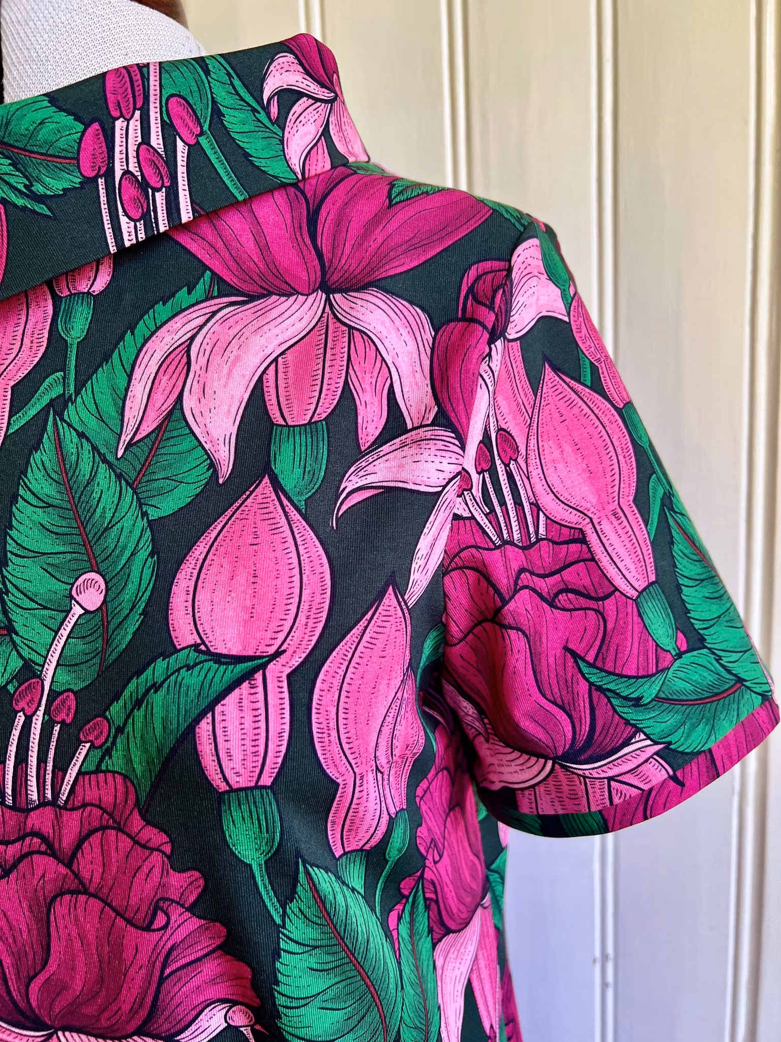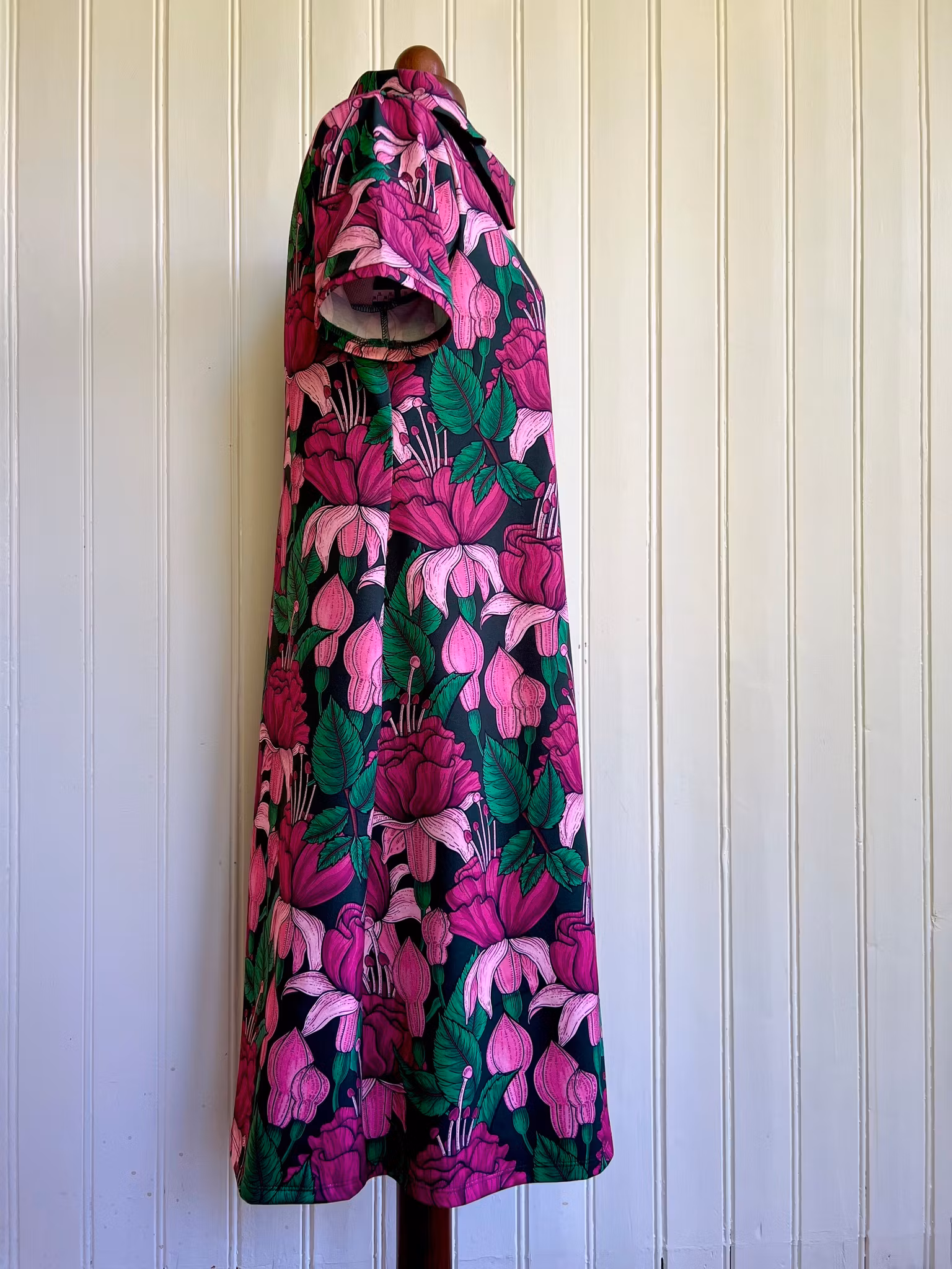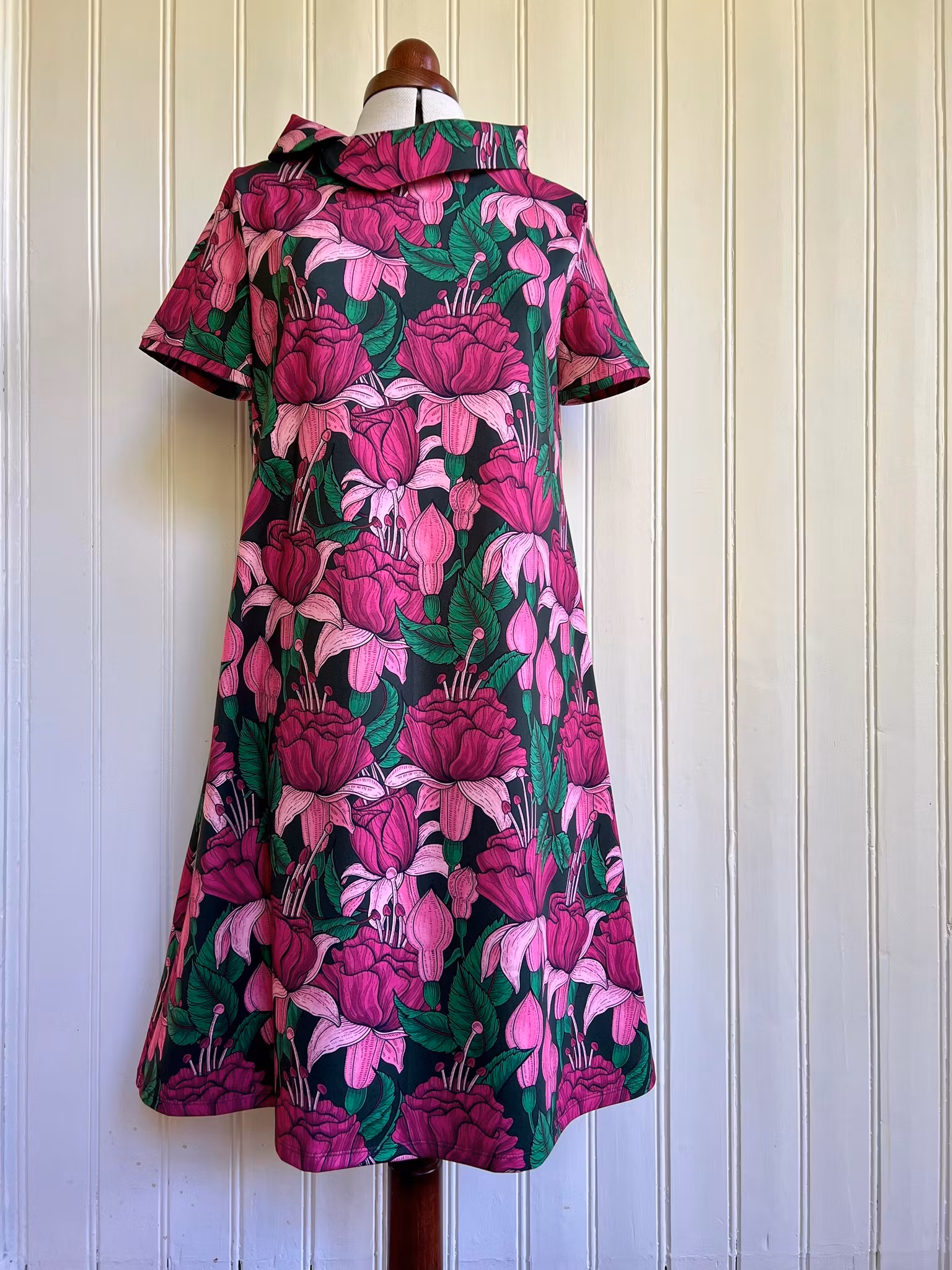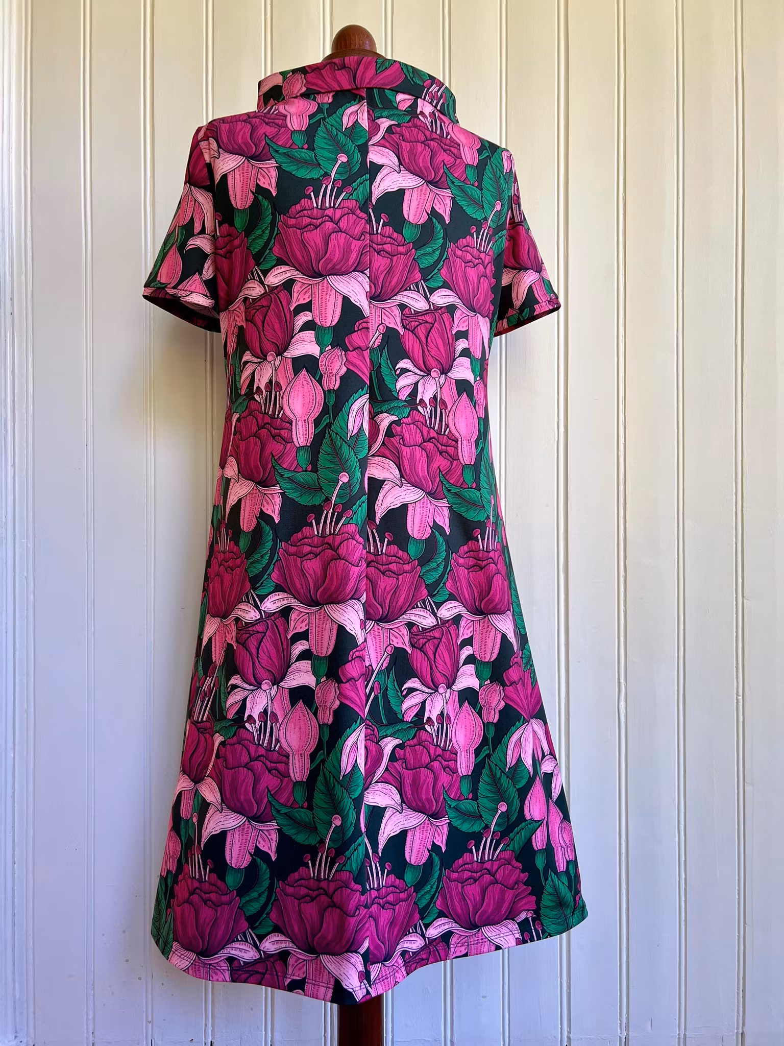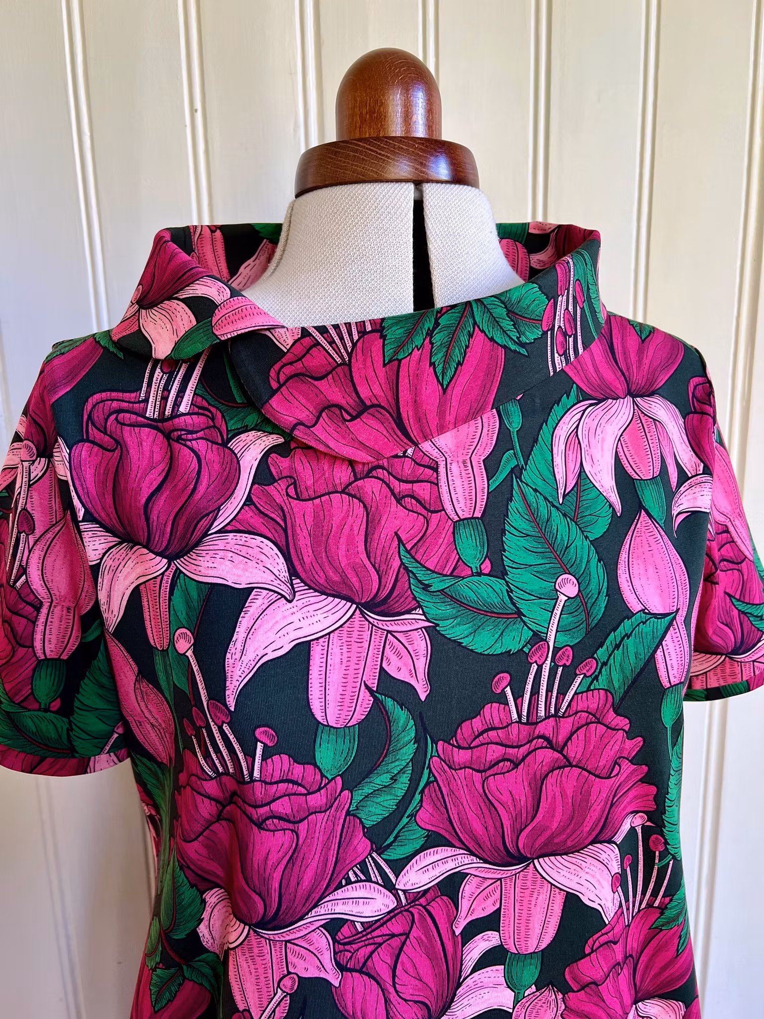 Klänning sydd i mjuk härlig bomullsjersey, i A-linjemodell. Den har en vacker lite vidare krage som går omlott i sidan framtill.
