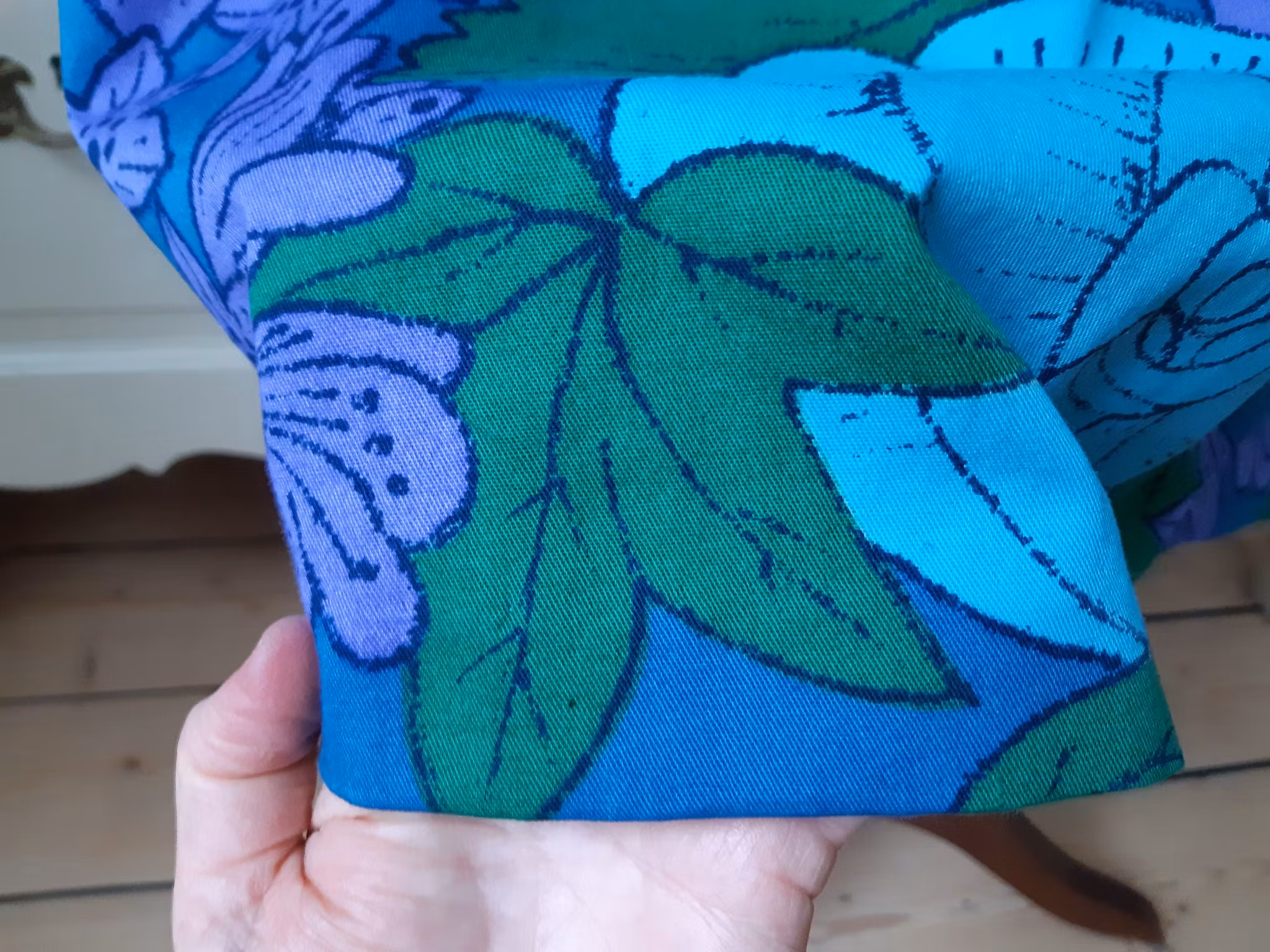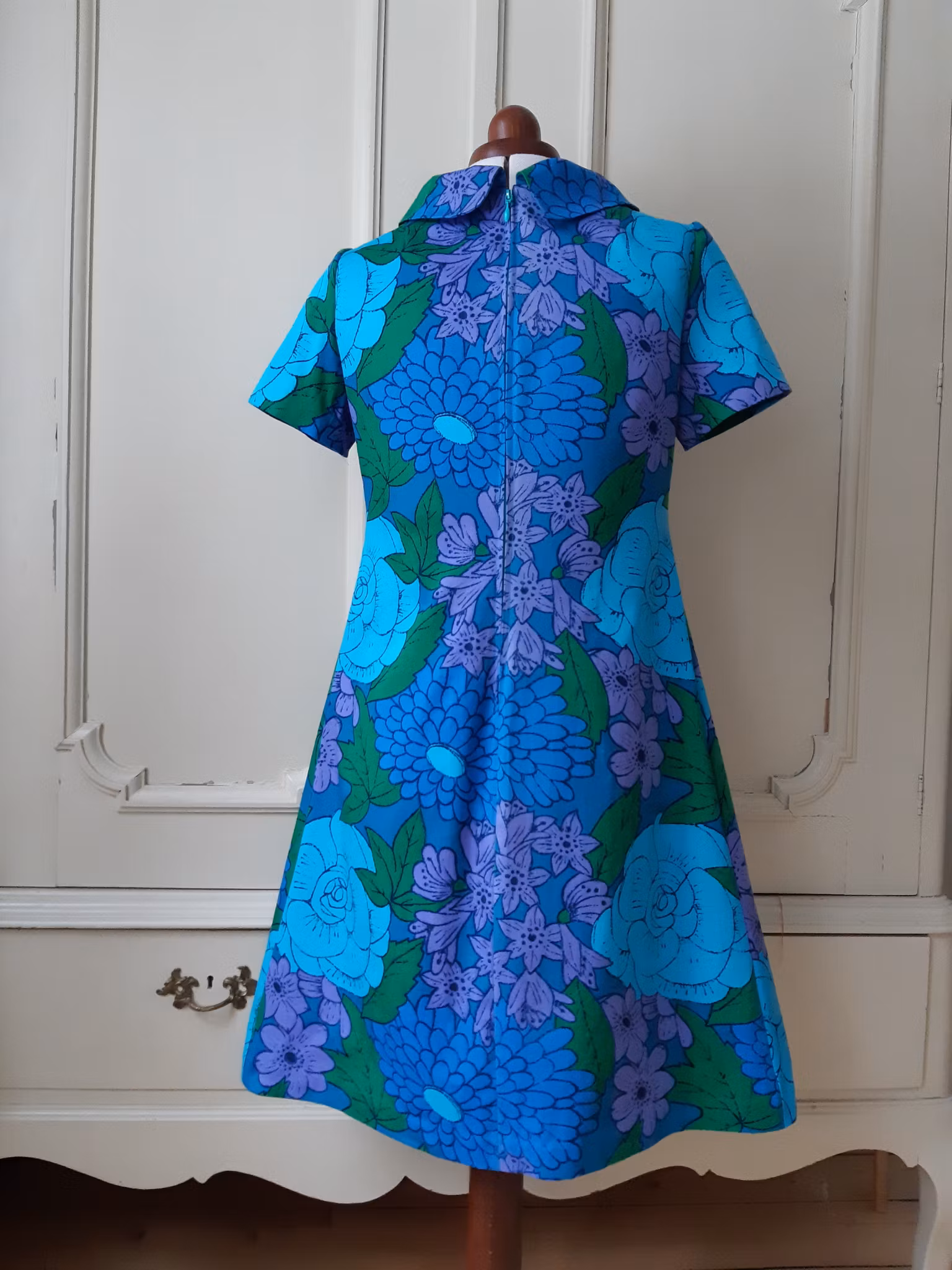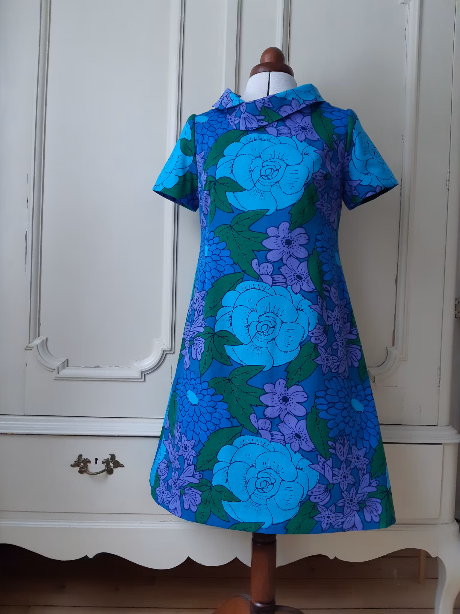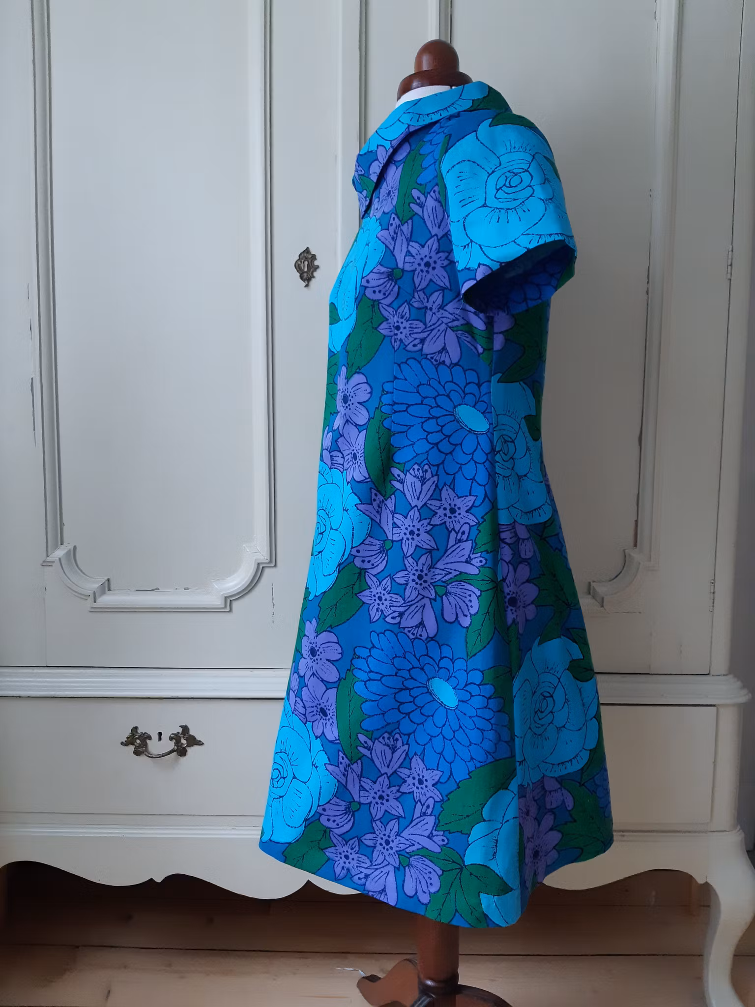 Klänning sydd i ett ljuvligt retrotyg från 1960- eller 70-talet. Materialet är tätvävd mellankraftig bomull och tyget är i mycket fint återbrukat skick. Lite mer figurnära A-linjemodell med rundad omlottkrage, insnitt i midjan, dragkedja bak och dolda handsydda fållar på ärm och klänningsslut.