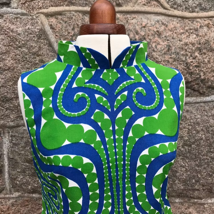 En klänning med stärkt ståkrage som är delad och lite rundad framtill och har dragkedja bak. Klänningen har dold handsydd fåll nertill. Den är sydd i ett retrotyg från 1960- eller 70-talet i mycket fint skick. Materialet är tätvävd bomull.