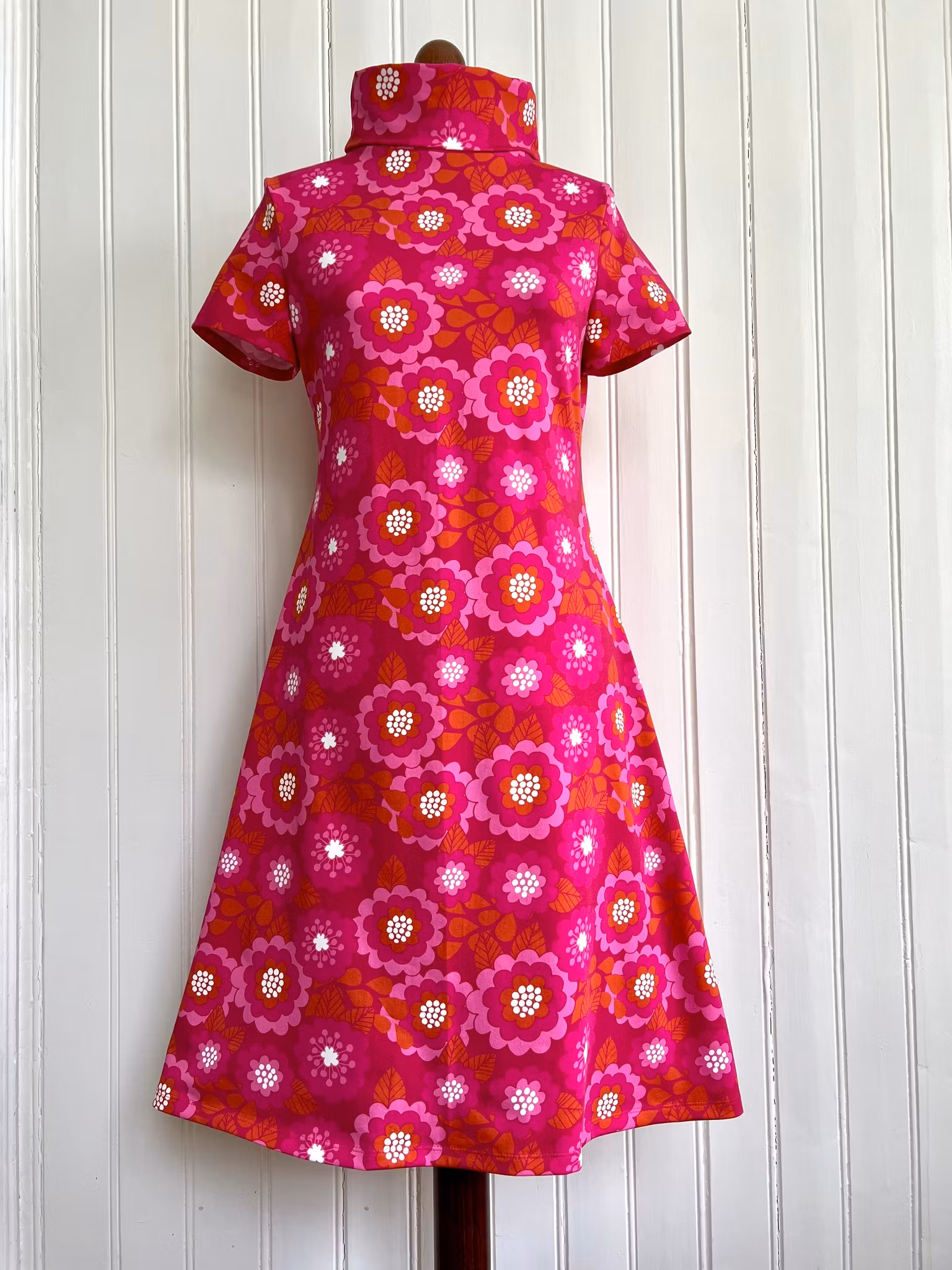 Klänning i A-linjemodell sydd i bomullsjersey, med hög krage som kan dubbelvikas samt tillhörande skärp. Sitter mer figurnära över bysten för att sedan få vidd över stussen. Kragen värmer skönt runt halsen utan att sitta åt. Tygets mönster är designat av Elin Granath. Mjuk skön jersey i 95 % bomull och 5 % elastan.