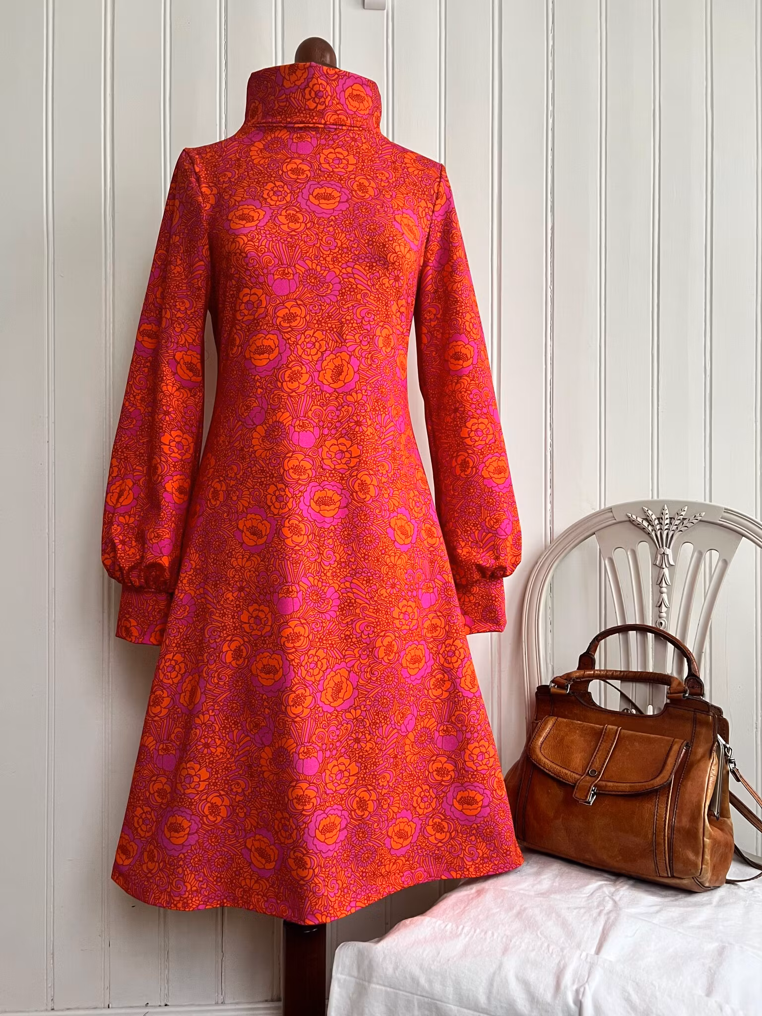 Klänning i A-linjemodell sydd i mjuk härlig bomullsjersey, med hög krage som kan dubbelvikas. Den sitter mer figurnära över bysten för att sedan få vidd över stussen. Klänningen har en lång ärm med mycket vidd nertill, som samlas ihop med en mudd i samma tyg.