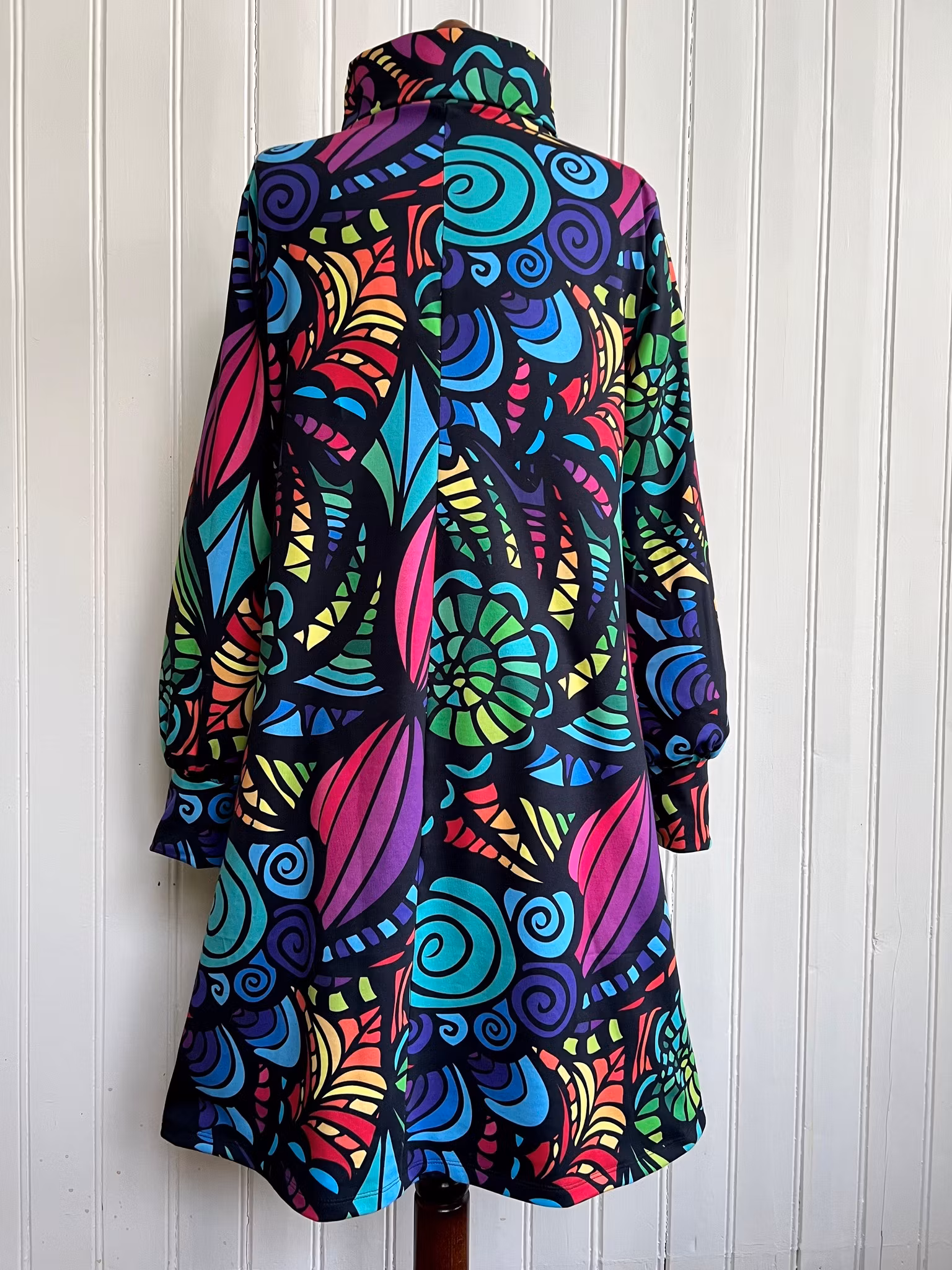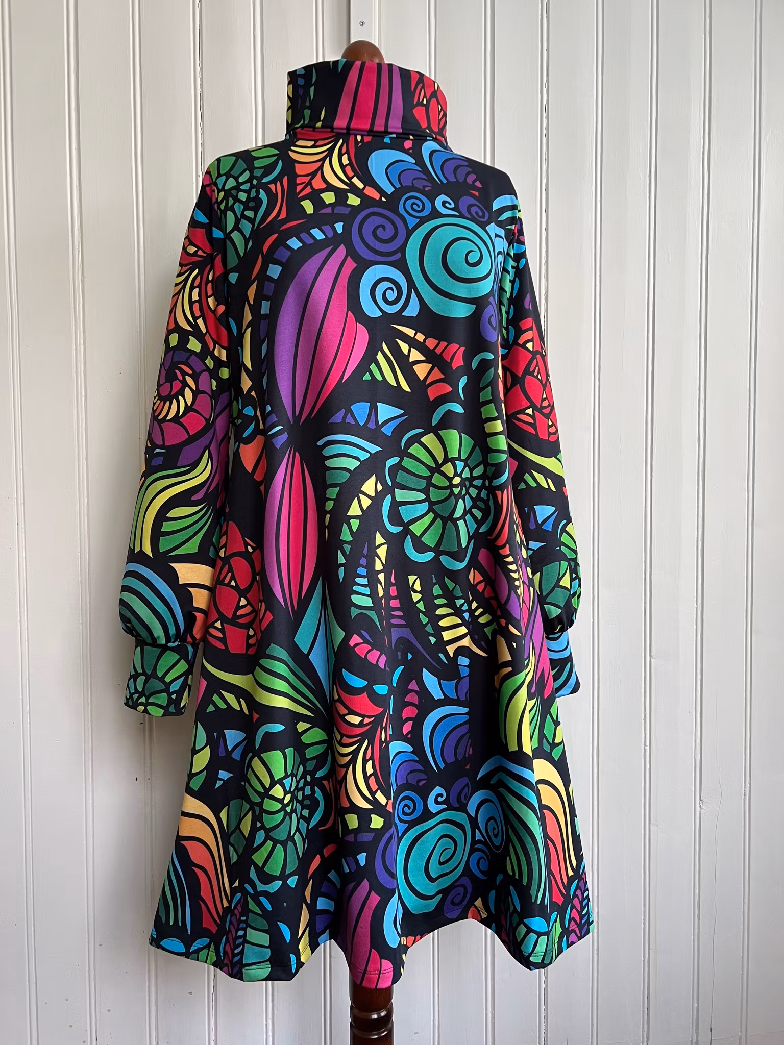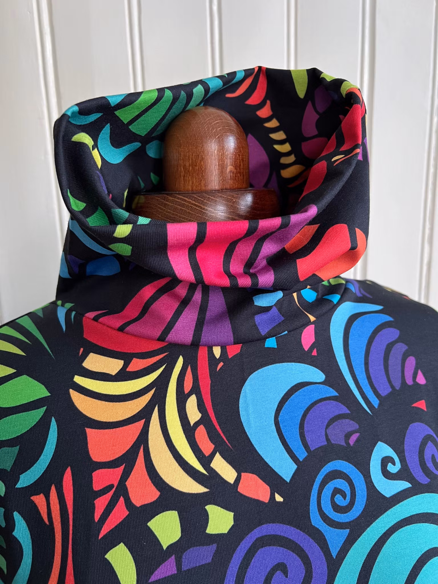 Klänning i A-linjemodell sydd i mjuk härlig bomullsjersey, med hög krage som kan dubbelvikas. Sitter mer figurnära över bysten för att sedan få vidd över stussen. Klänningen har en lång ärm med lite vidd nertill, som avslutas med en mudd i samma tyg. Det vackra tyget är designat av Vintage in my heart och heter Go Crazy. Material 95 % ekologisk bomull och 5 % elastan, med gott om stretch i.