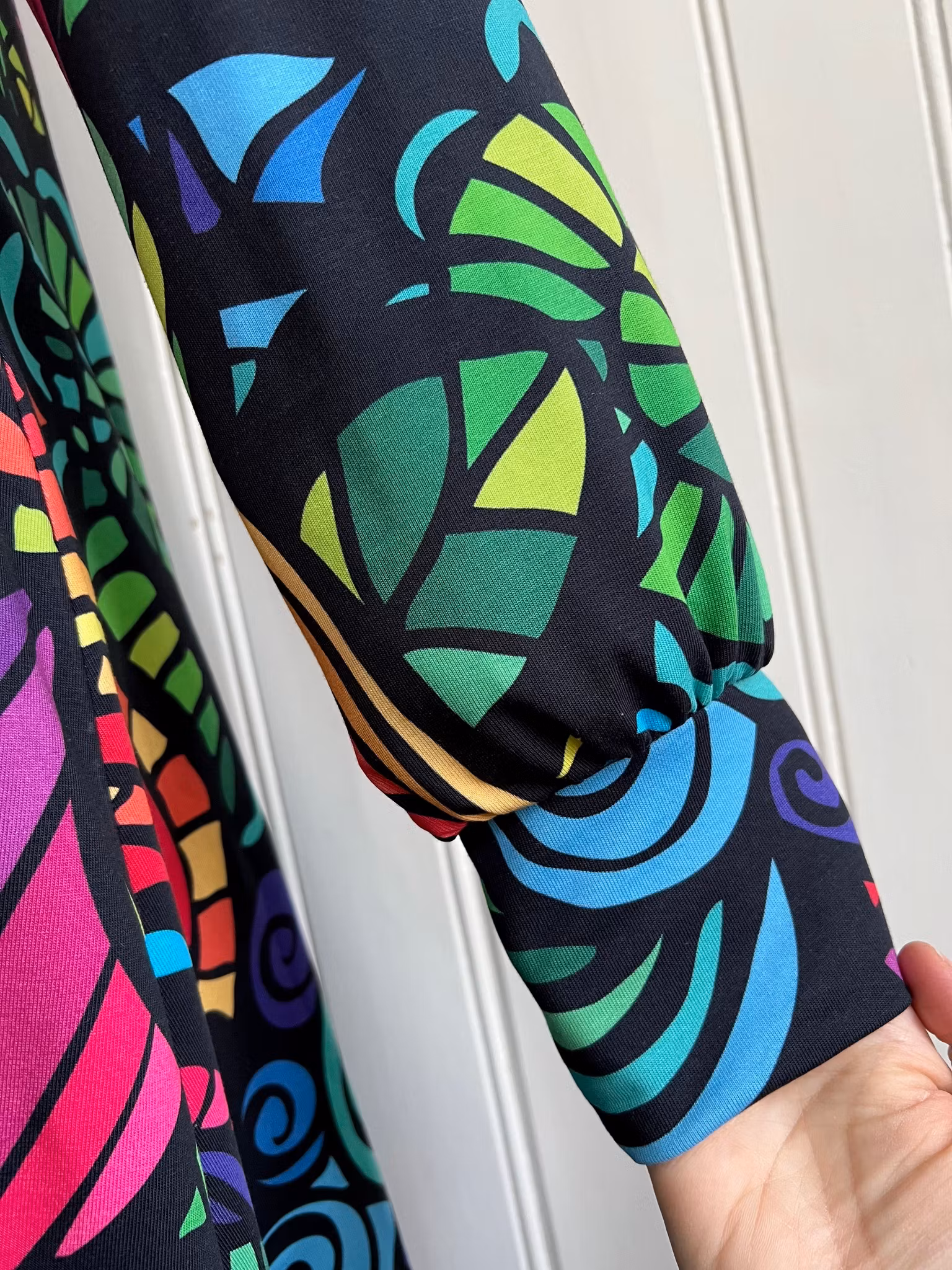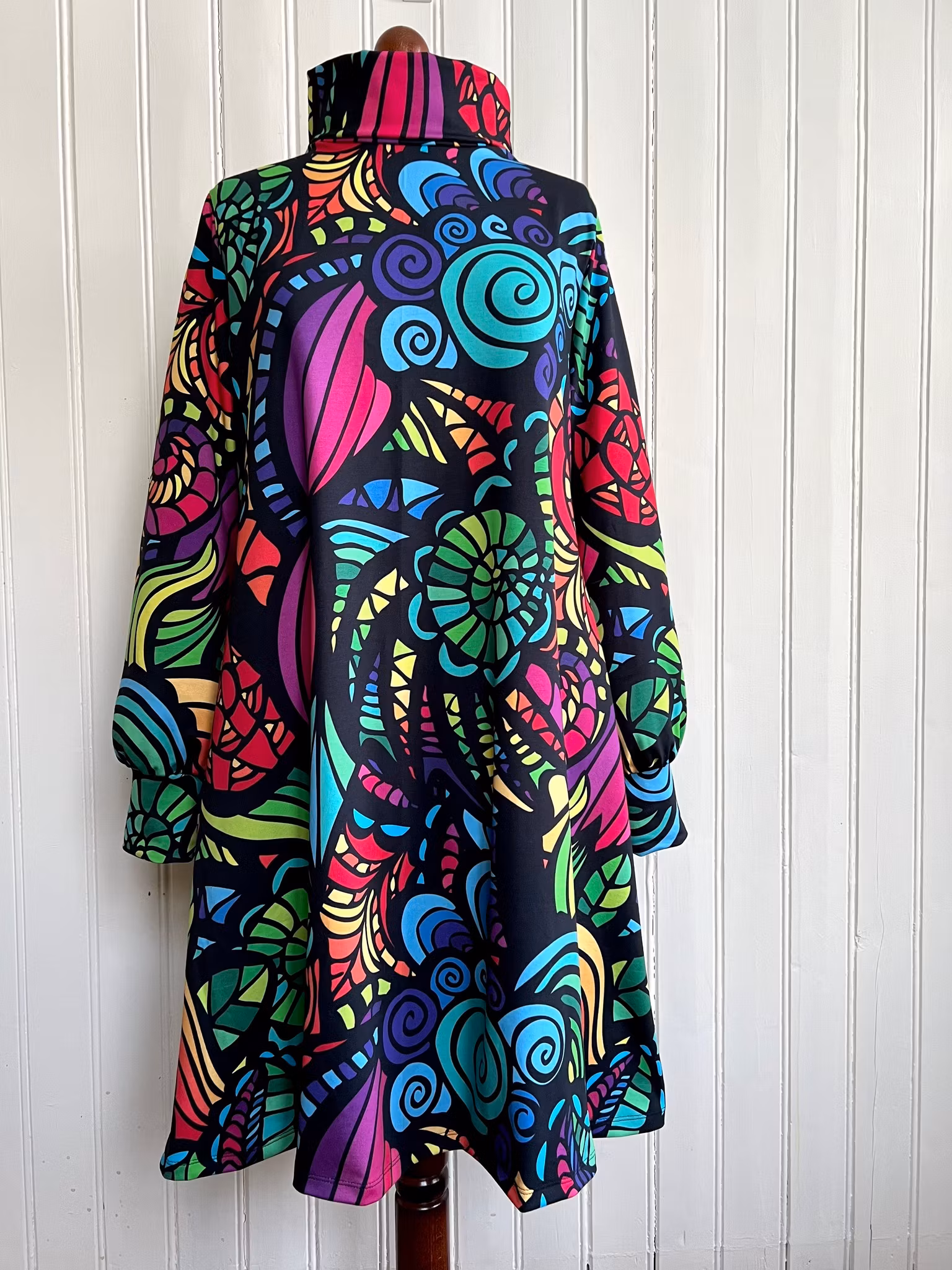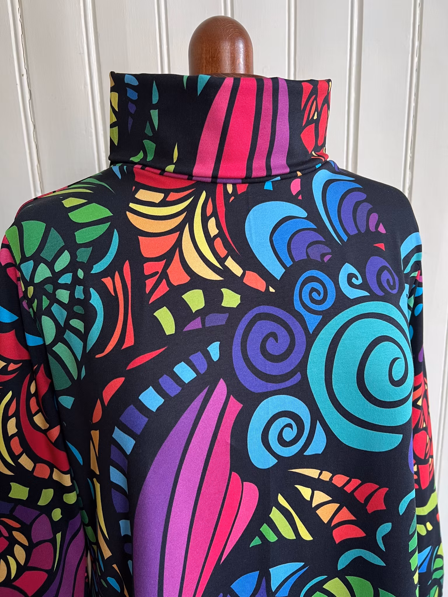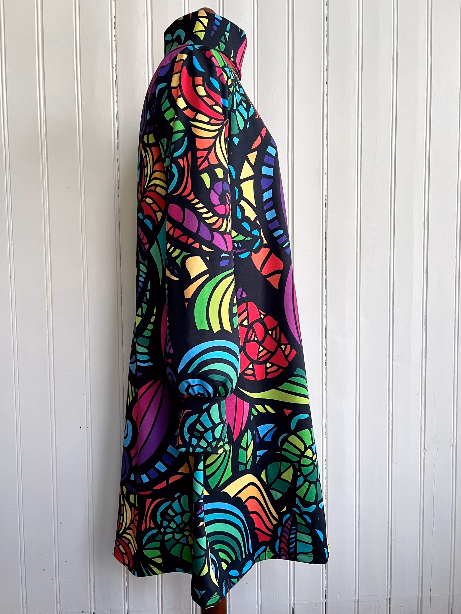Klänning i A-linjemodell sydd i mjuk härlig bomullsjersey, med hög krage som kan dubbelvikas. Sitter mer figurnära över bysten för att sedan få vidd över stussen. Klänningen har en lång ärm med lite vidd nertill, som avslutas med en mudd i samma tyg. Det vackra tyget är designat av Vintage in my heart och heter Go Crazy. Material 95 % ekologisk bomull och 5 % elastan, med gott om stretch i.