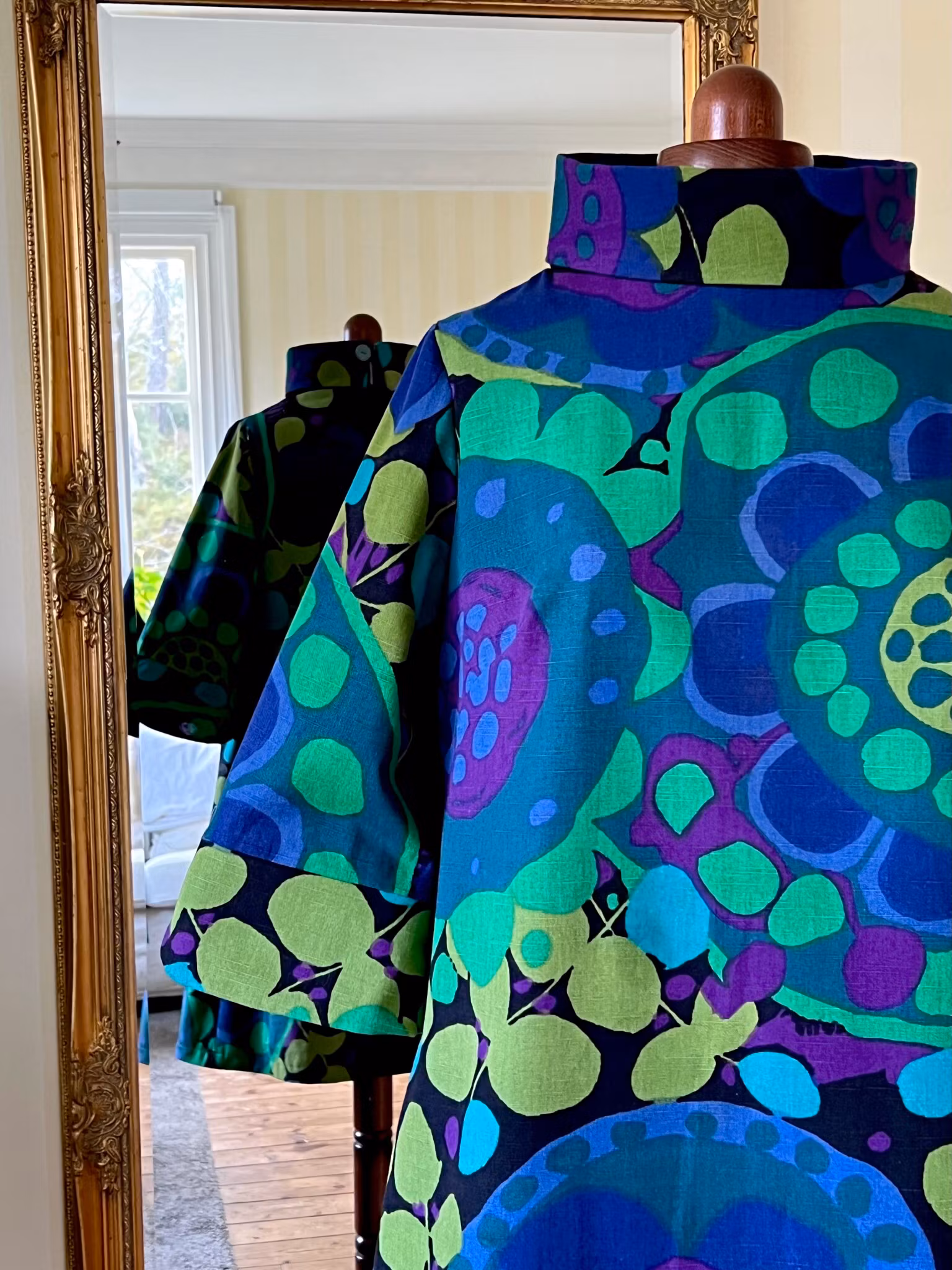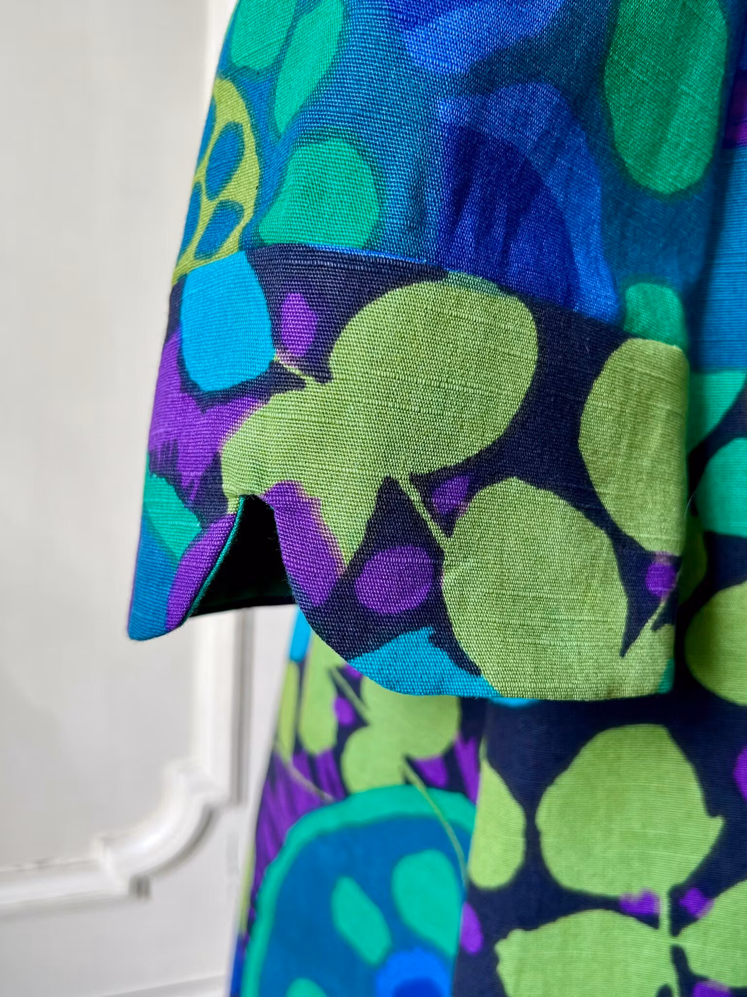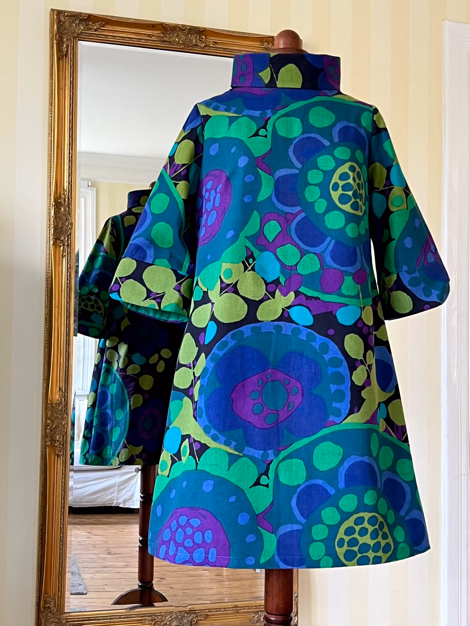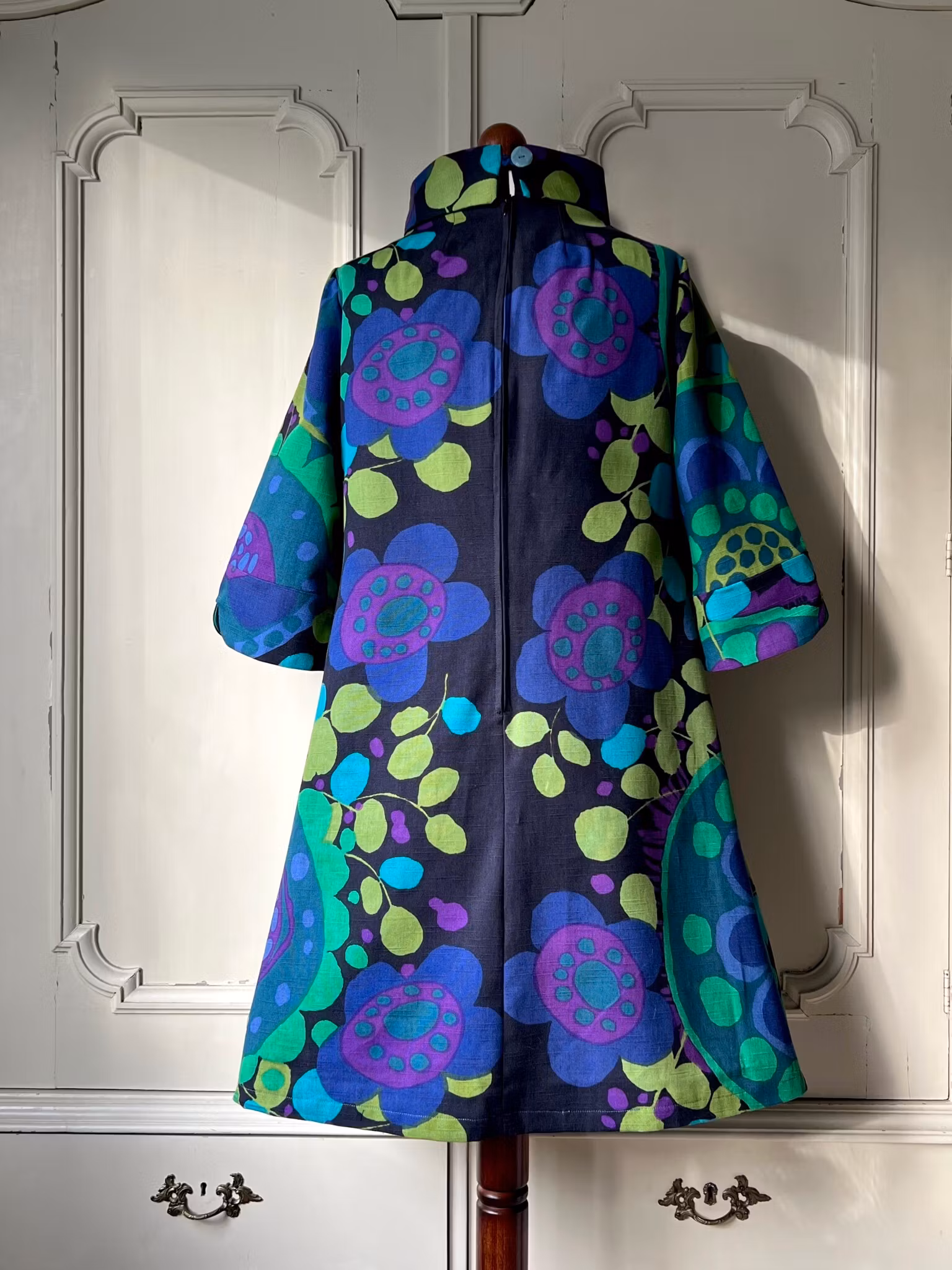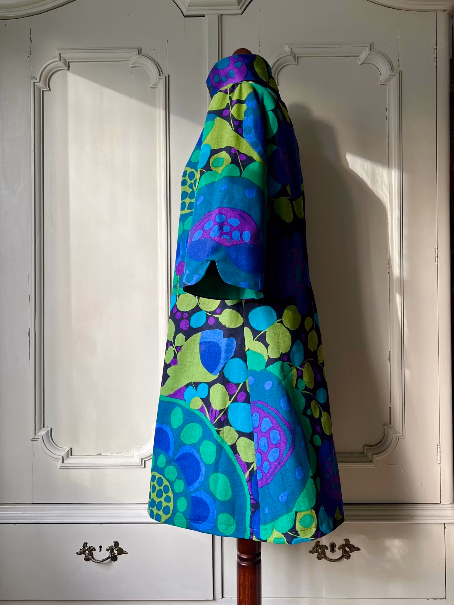 Klänning i A-linjemodell sydd i ett äkta retro/vintagetyg från 1960- eller 70-talet - Ekerö designat av Saini Salonen.