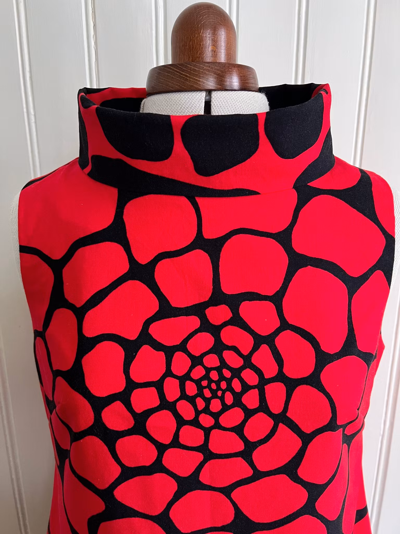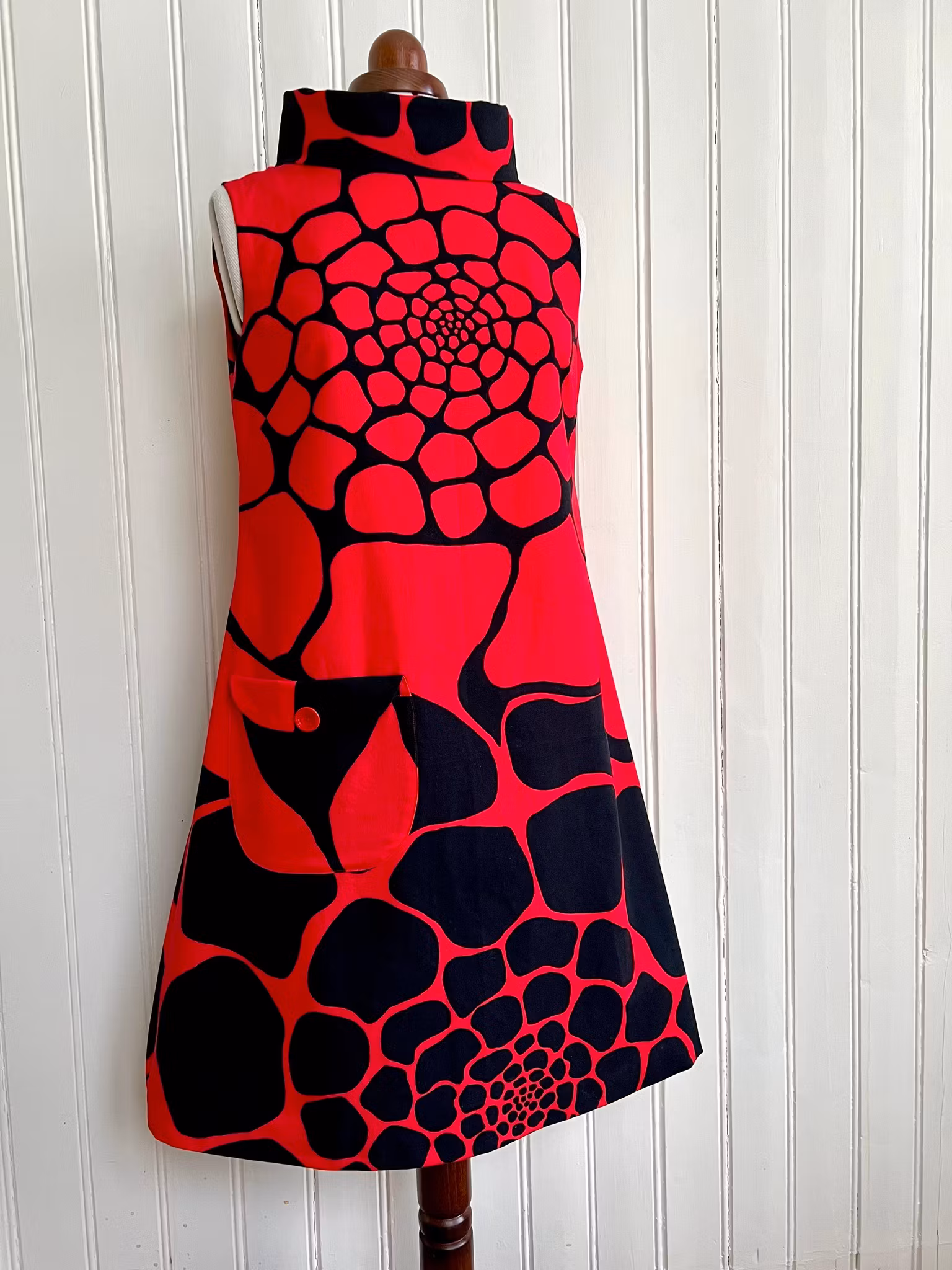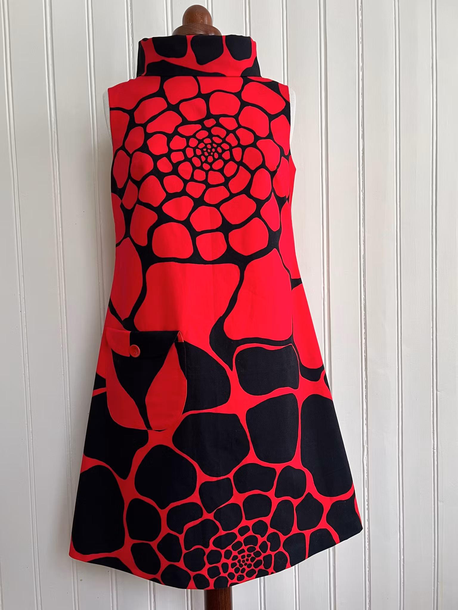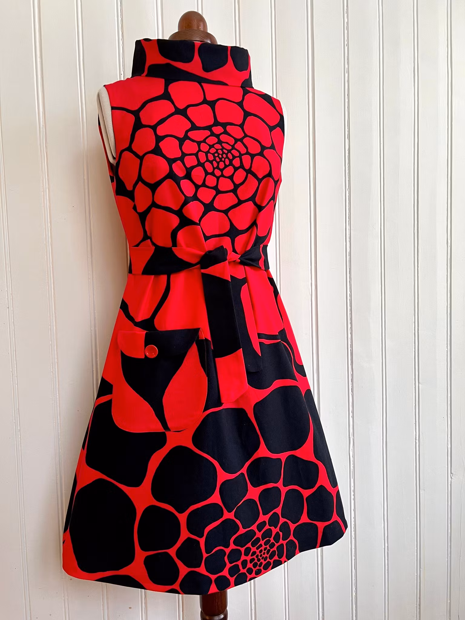 Klänning sydd i A-linjemodell i ett äkta retrotyg, troligtvis 1960-tal, i vävd bomull.