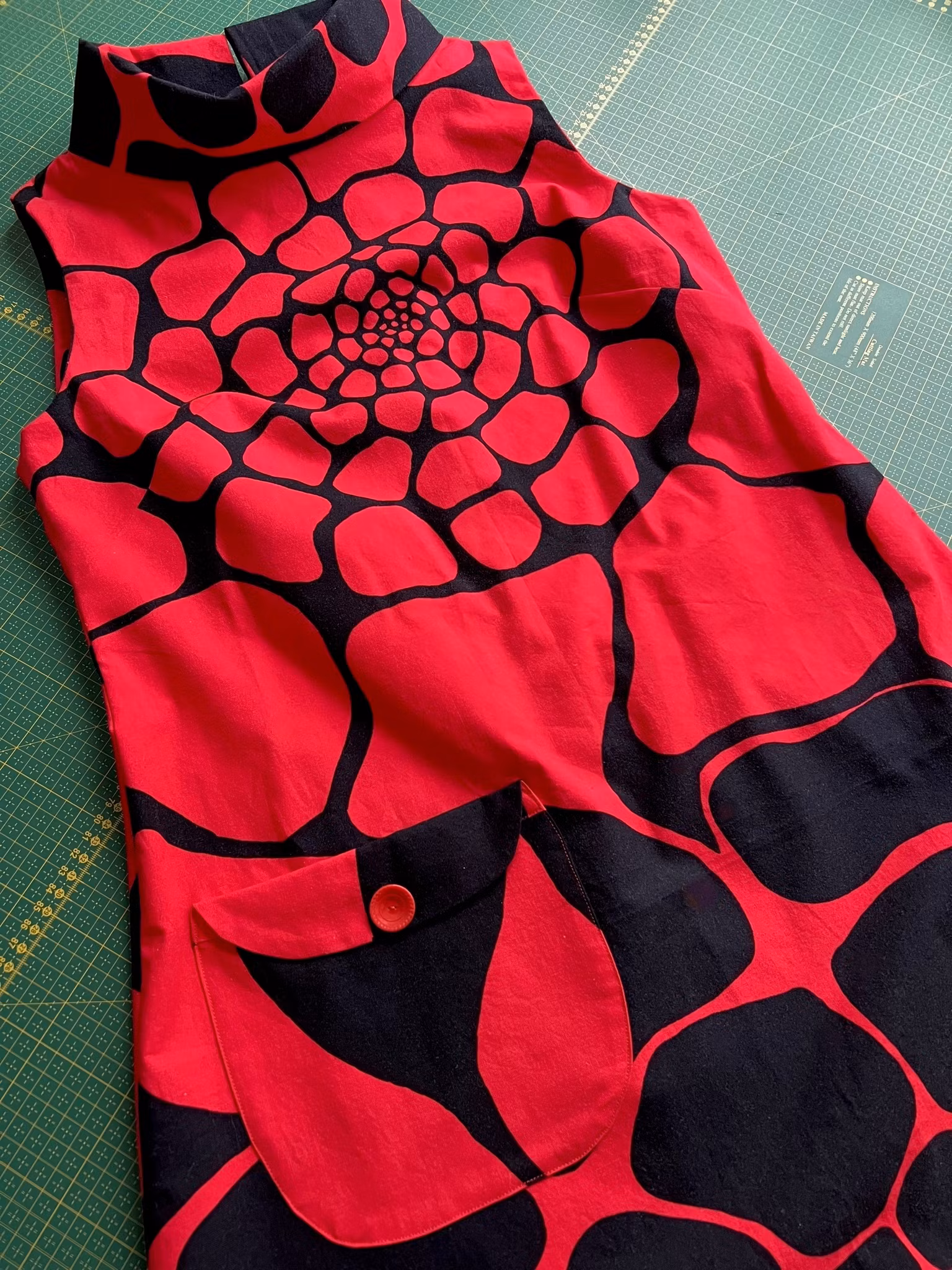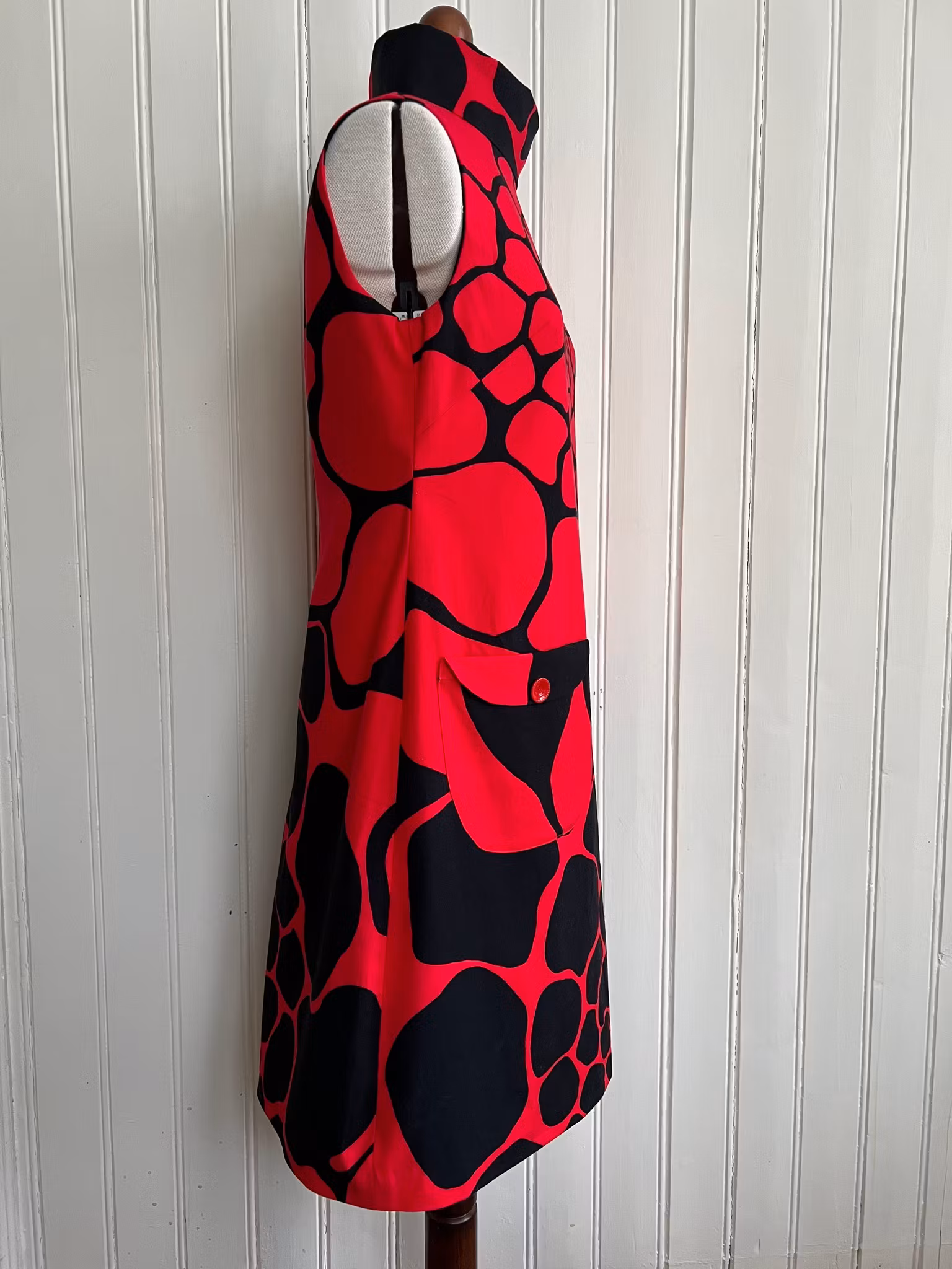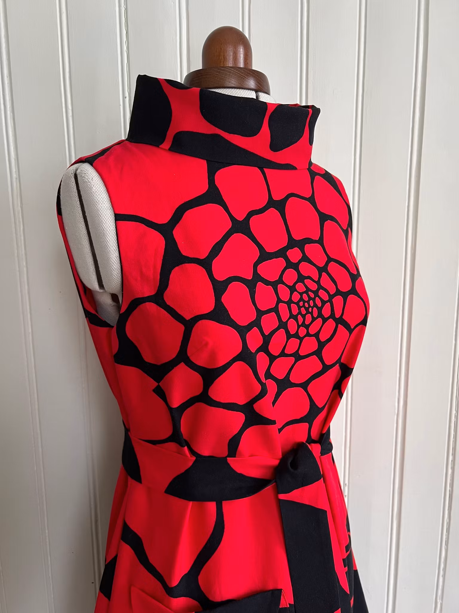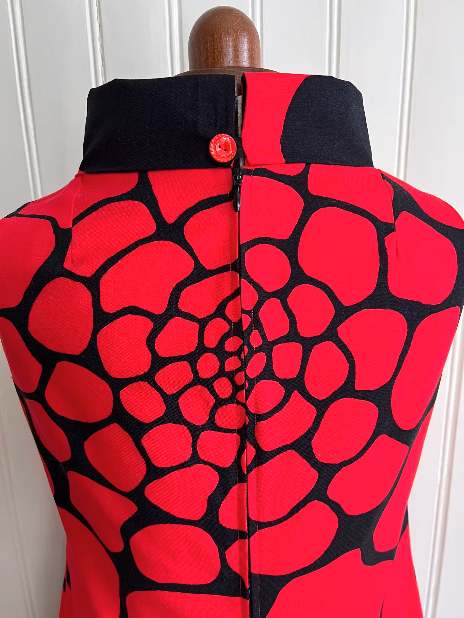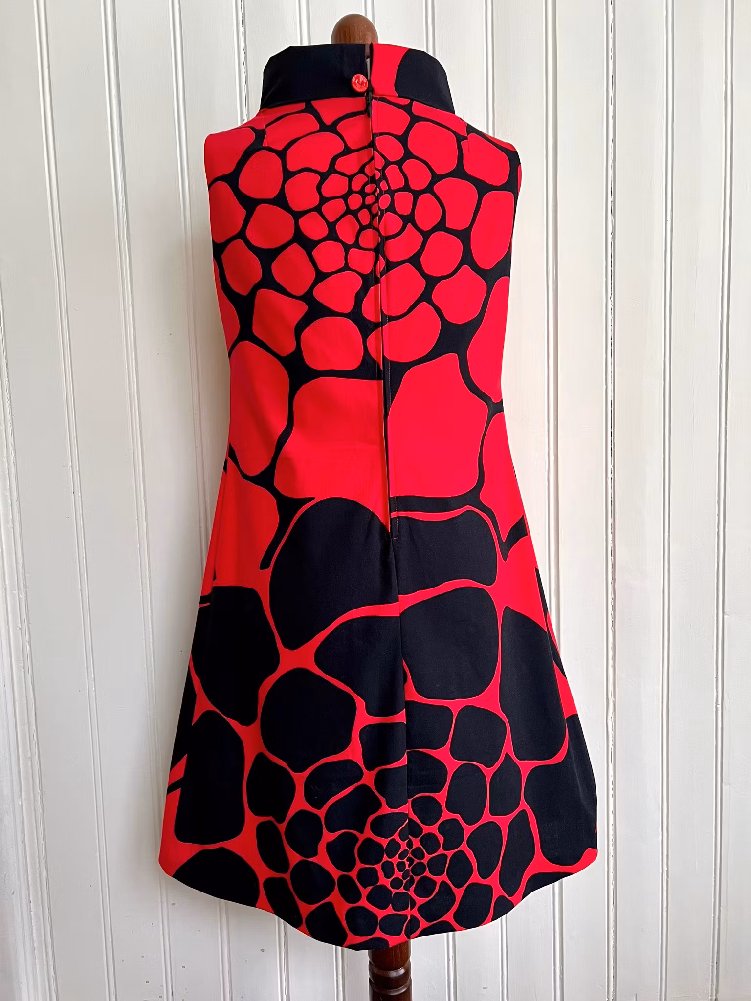 Klänning sydd i A-linjemodell i ett äkta retrotyg, troligtvis 1960-tal, i vävd bomull.