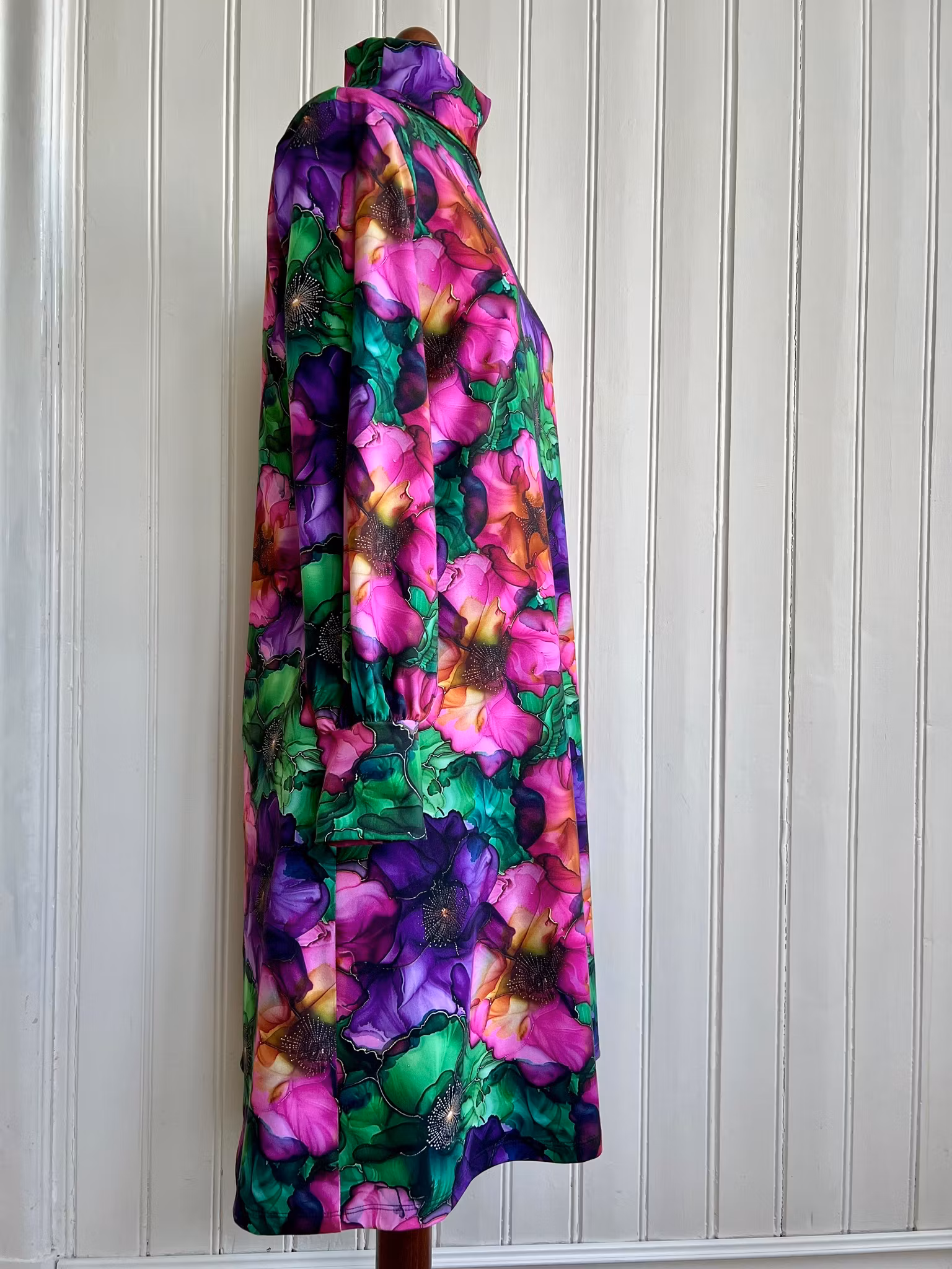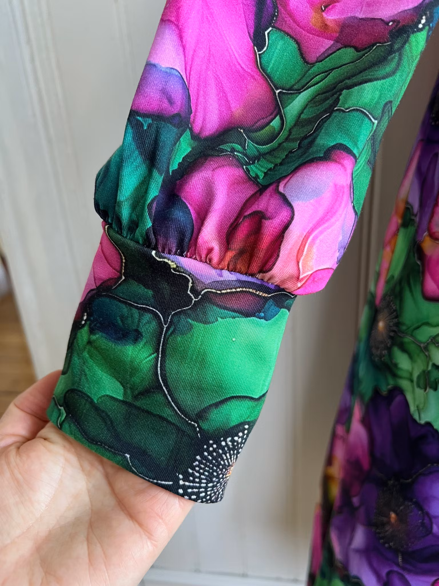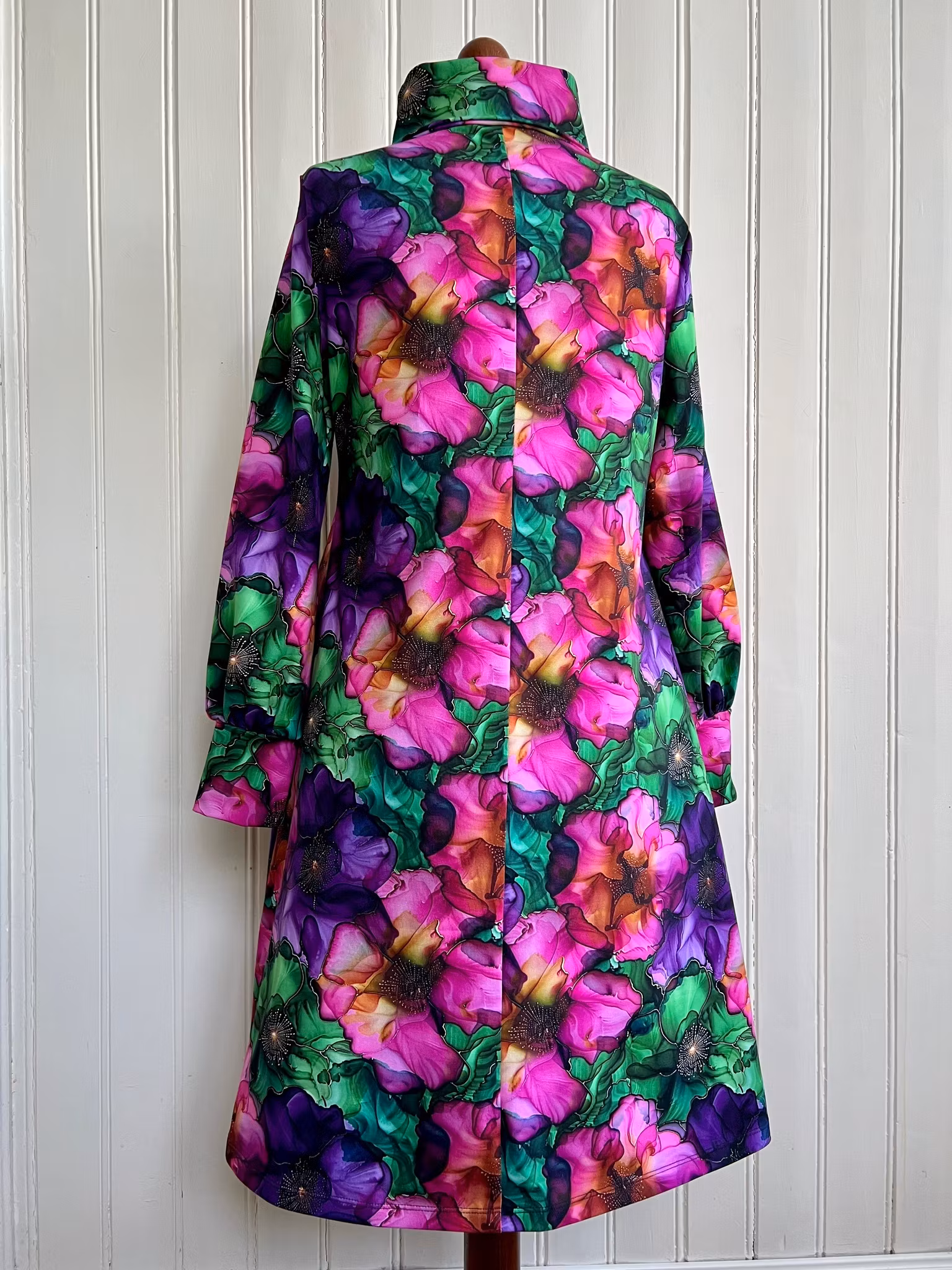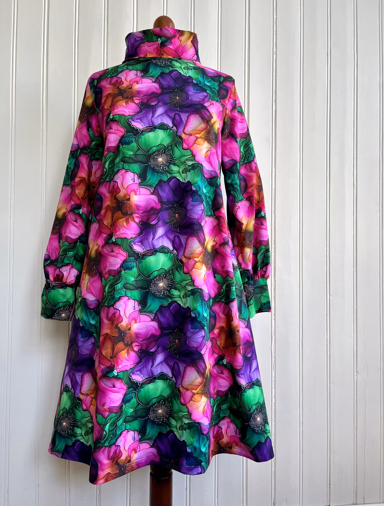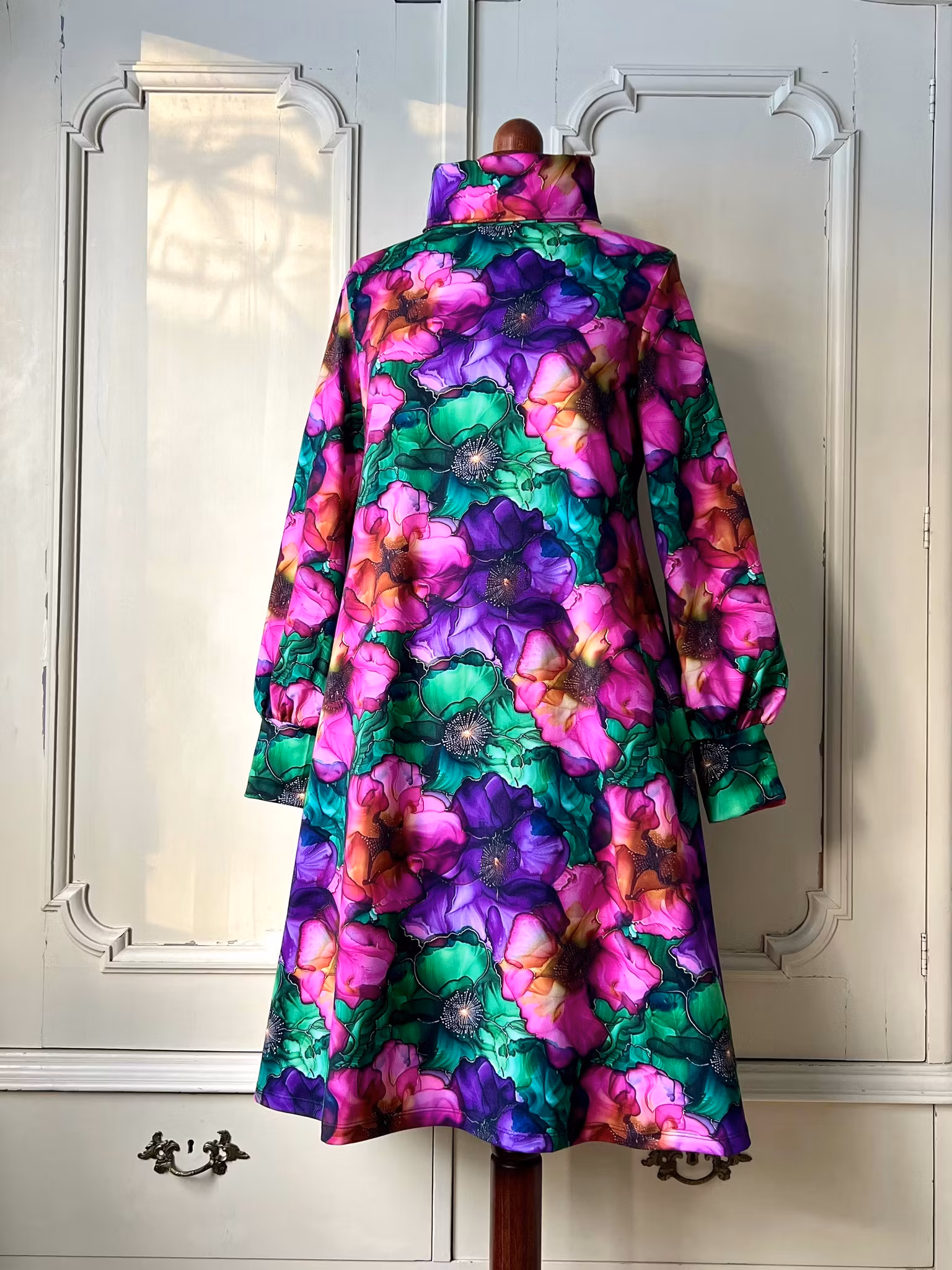 Klänning i A-linjemodell sydd i mjuk härlig bomullsjersey, med hög krage som kan dubbelvikas. Sitter mer figurnära över bysten för att sedan få vidd över stussen. Klänningen har en lång ärm med vidd nertill, som samlas ihop med en mudd i samma tyg.