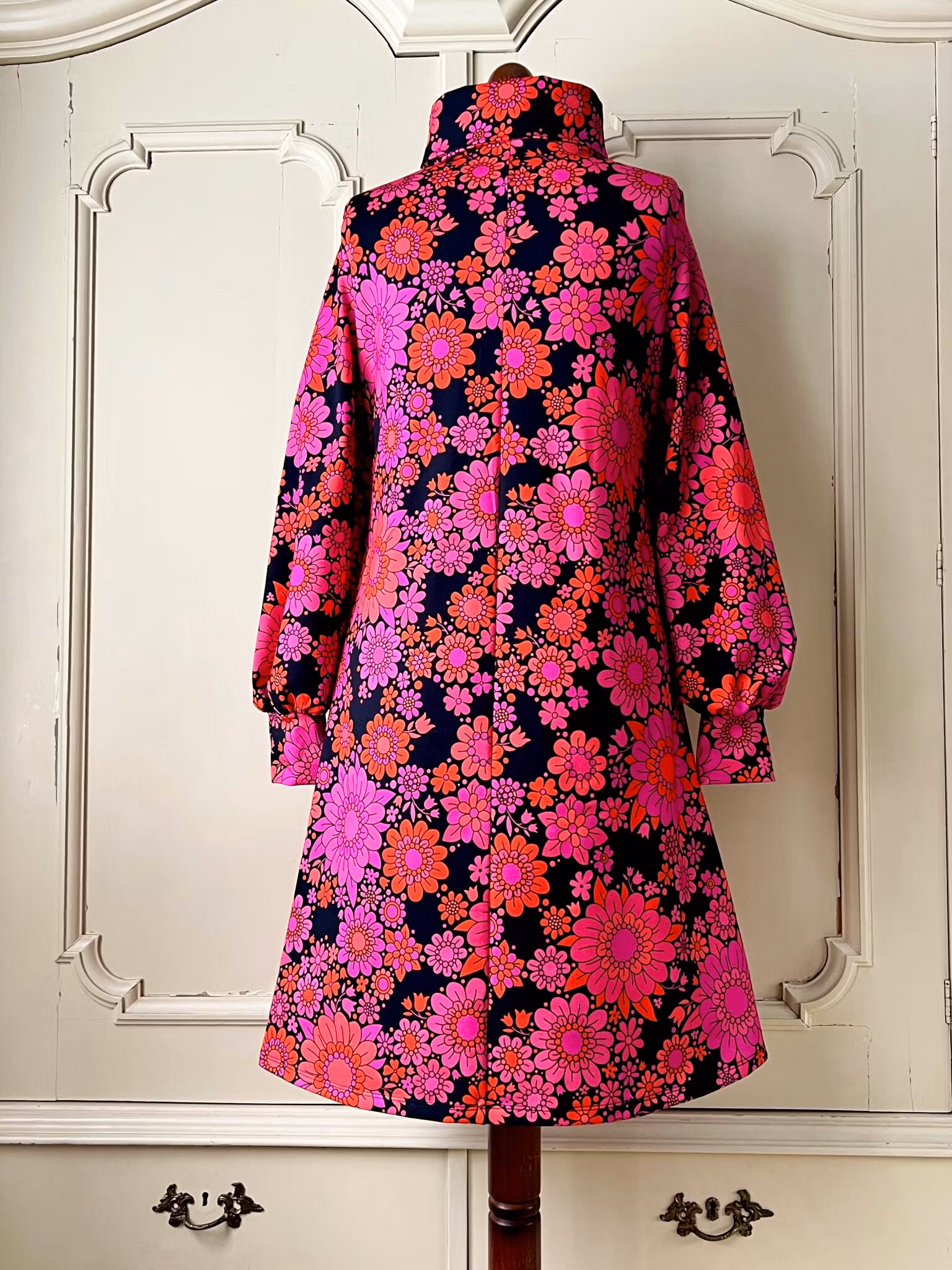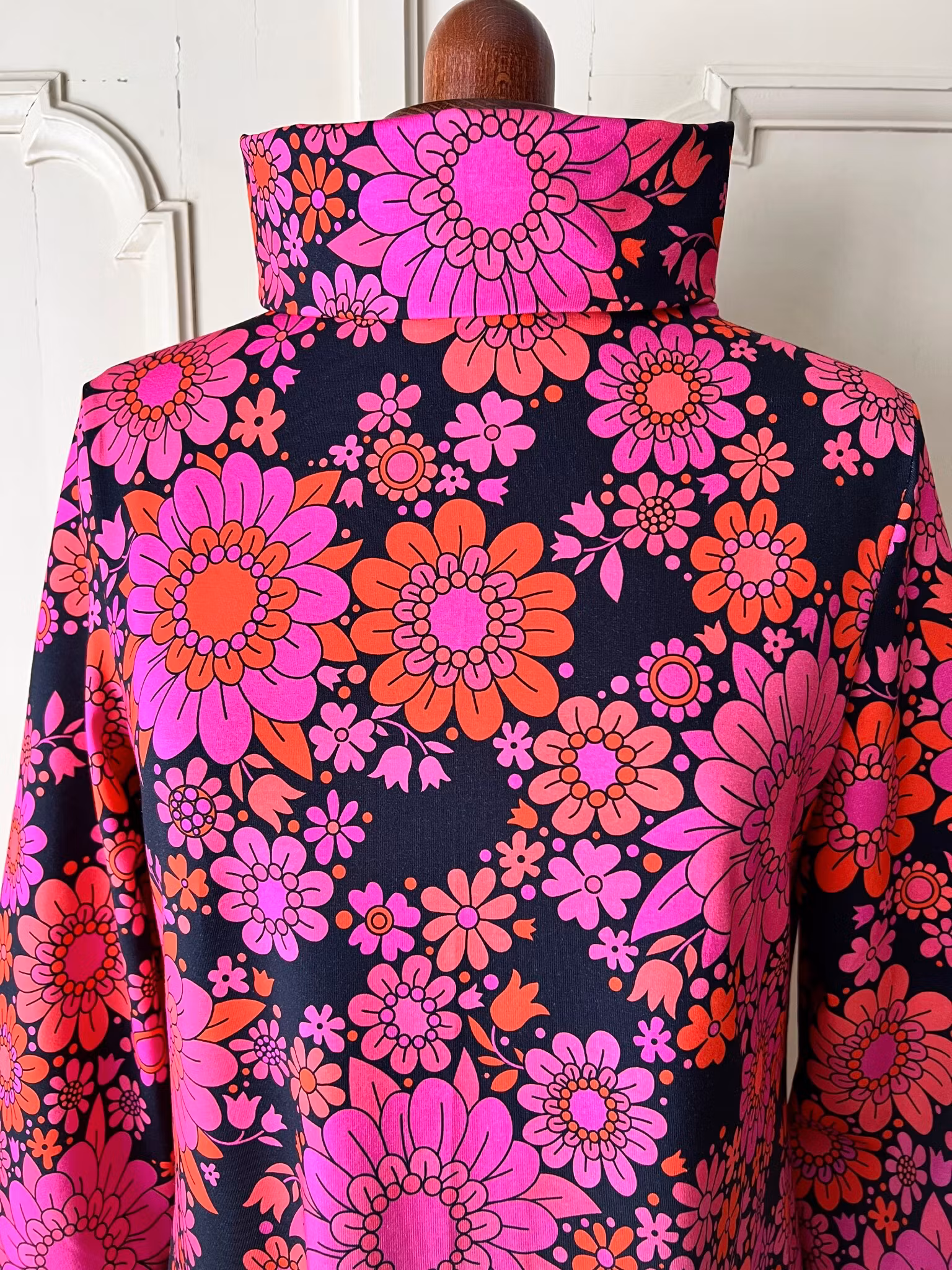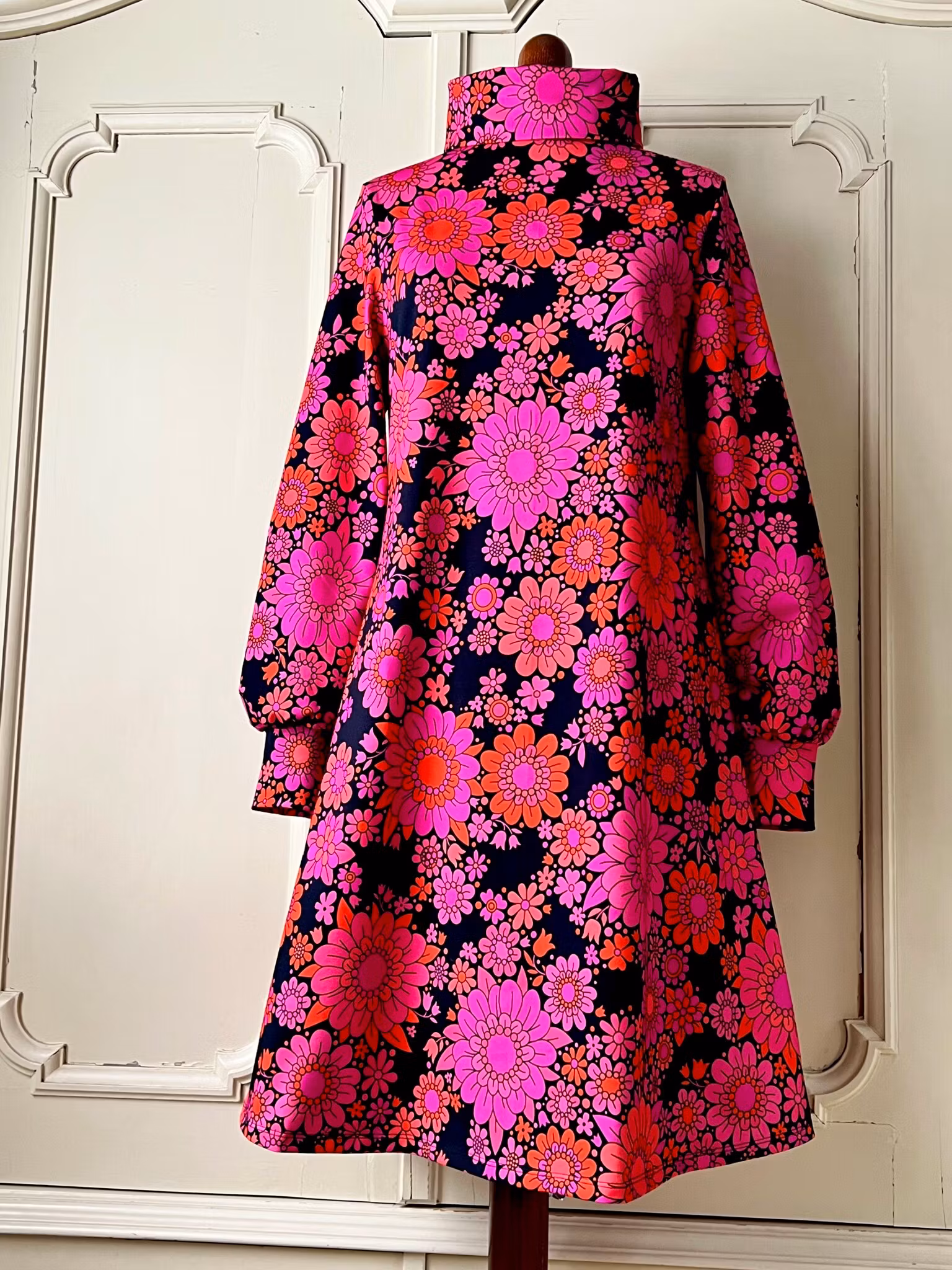 Klänning i A-linjemodell sydd i mjuk härlig bomullsjersey, med hög krage som kan dubbelvikas. Den sitter mer figurnära över bysten för att sedan få vidd över stussen. Klänningen har en lång ärm med mycket vidd nertill, som samlas ihop med en mudd i samma tyg.
