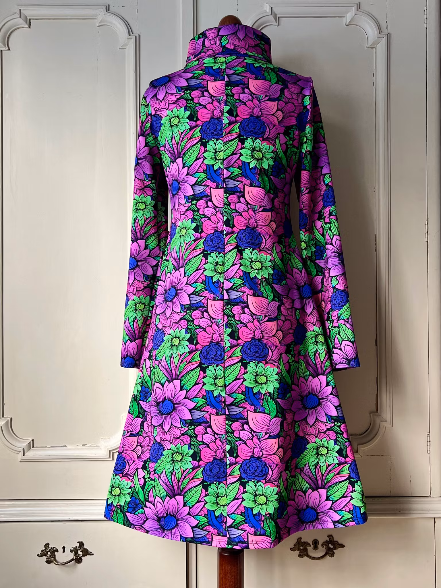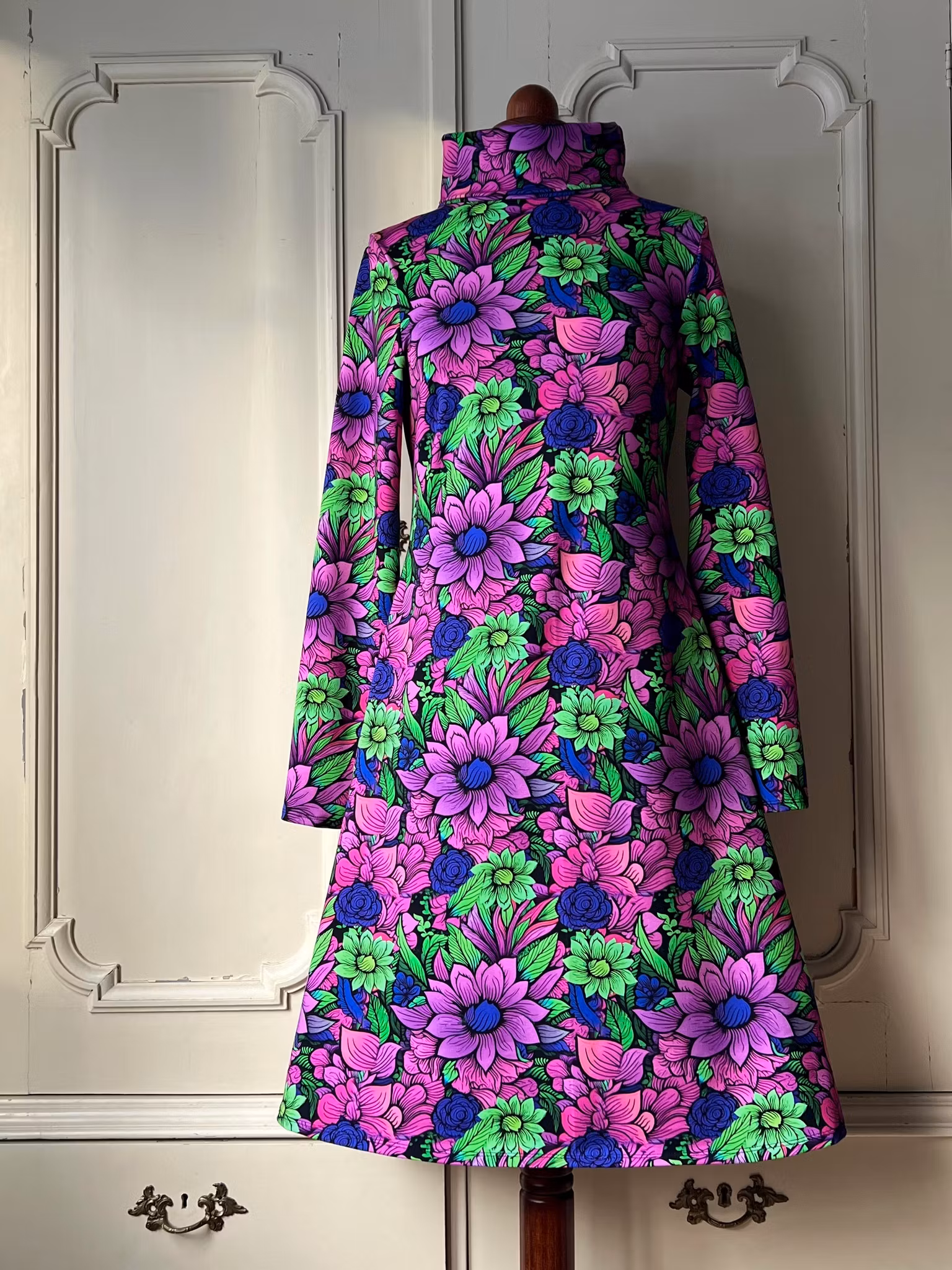 Klänning i A-linjemodell sydd i ett nyproducerat jerseytyg. Den har mjuk hög krage som dubbelviks och hellång ärm, samt tillhörande löst skärp. Klänningen sitter åt över bysten och får sedan mer vidd neråt.