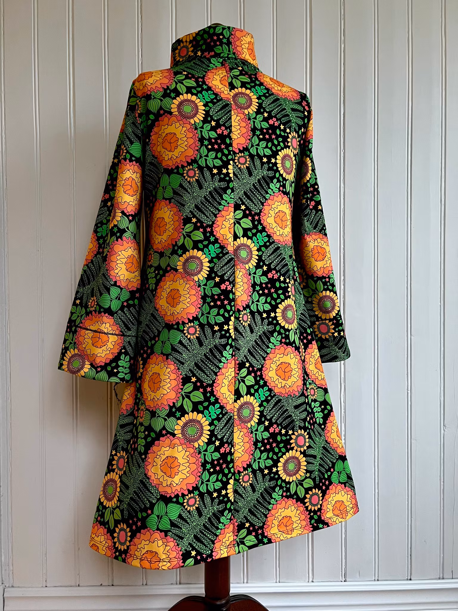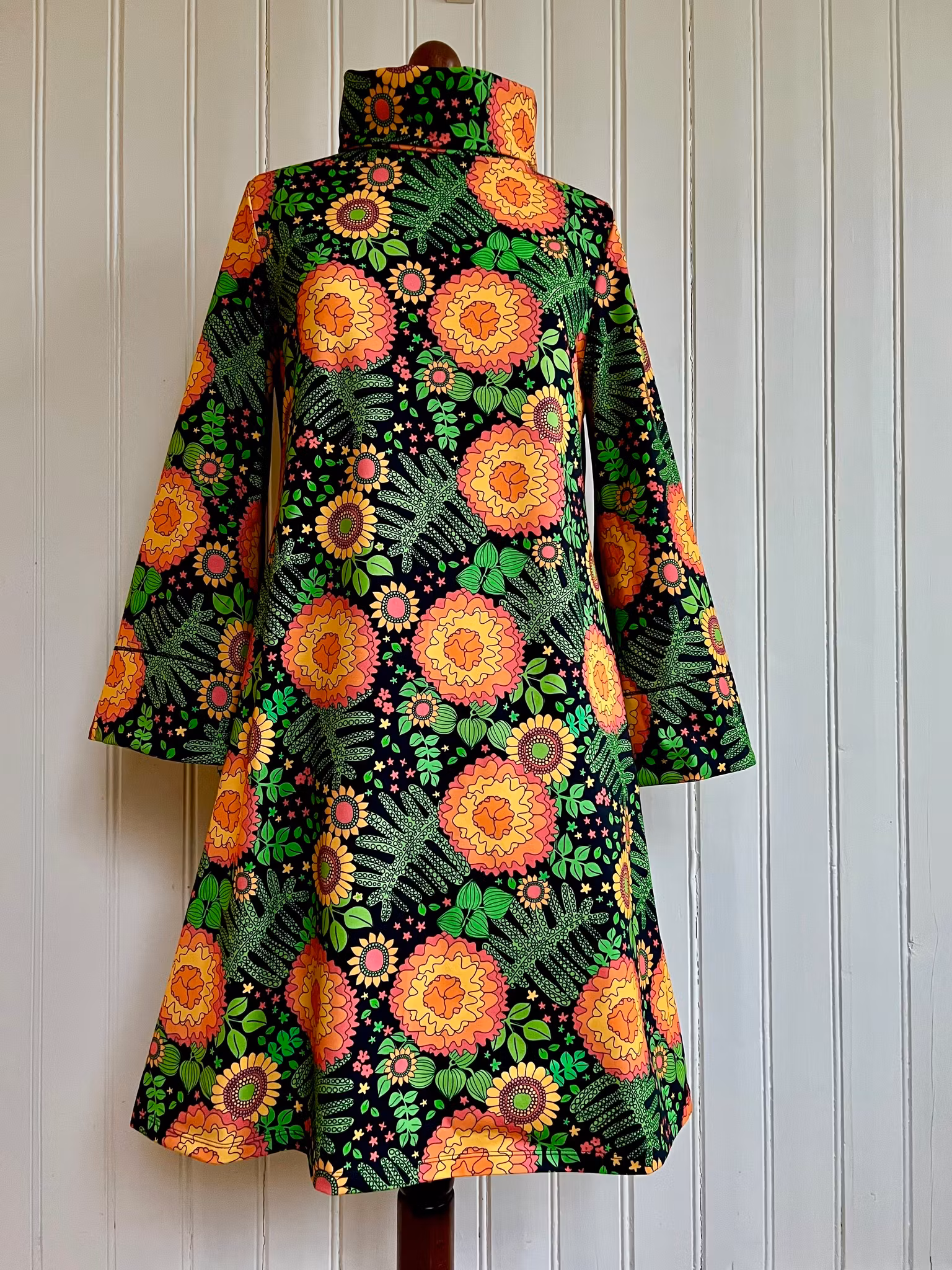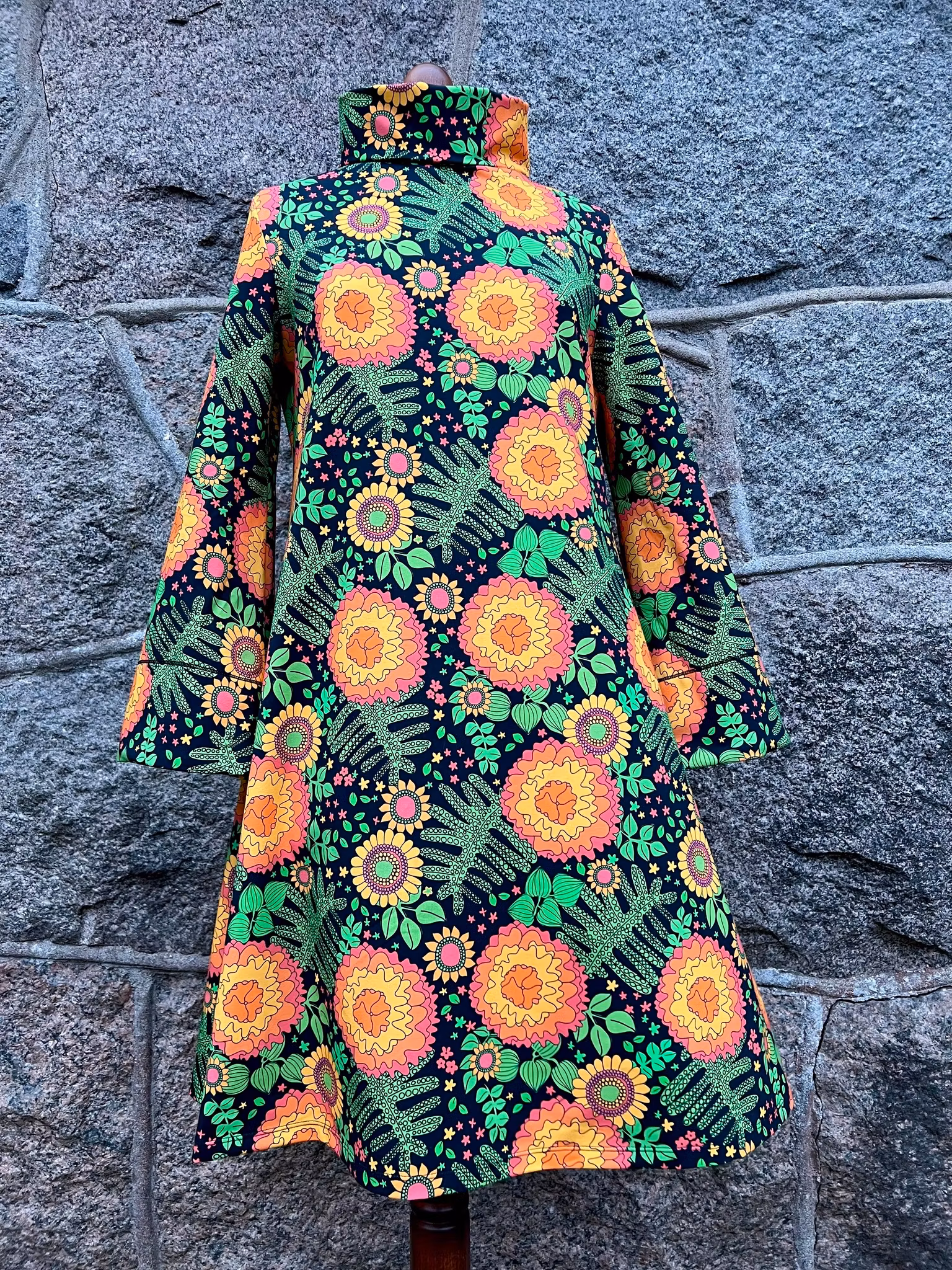 Klänning i A-linjemodell sydd i mjuk härlig bomullsjersey, med hög krage som kan dubbelvikas. Sitter mer figurnära över bysten för att sedan få vidd över stussen. Klänningen har en lång ärm med vidd nertill, fodrad en bit upp med samma tyg på insidan.