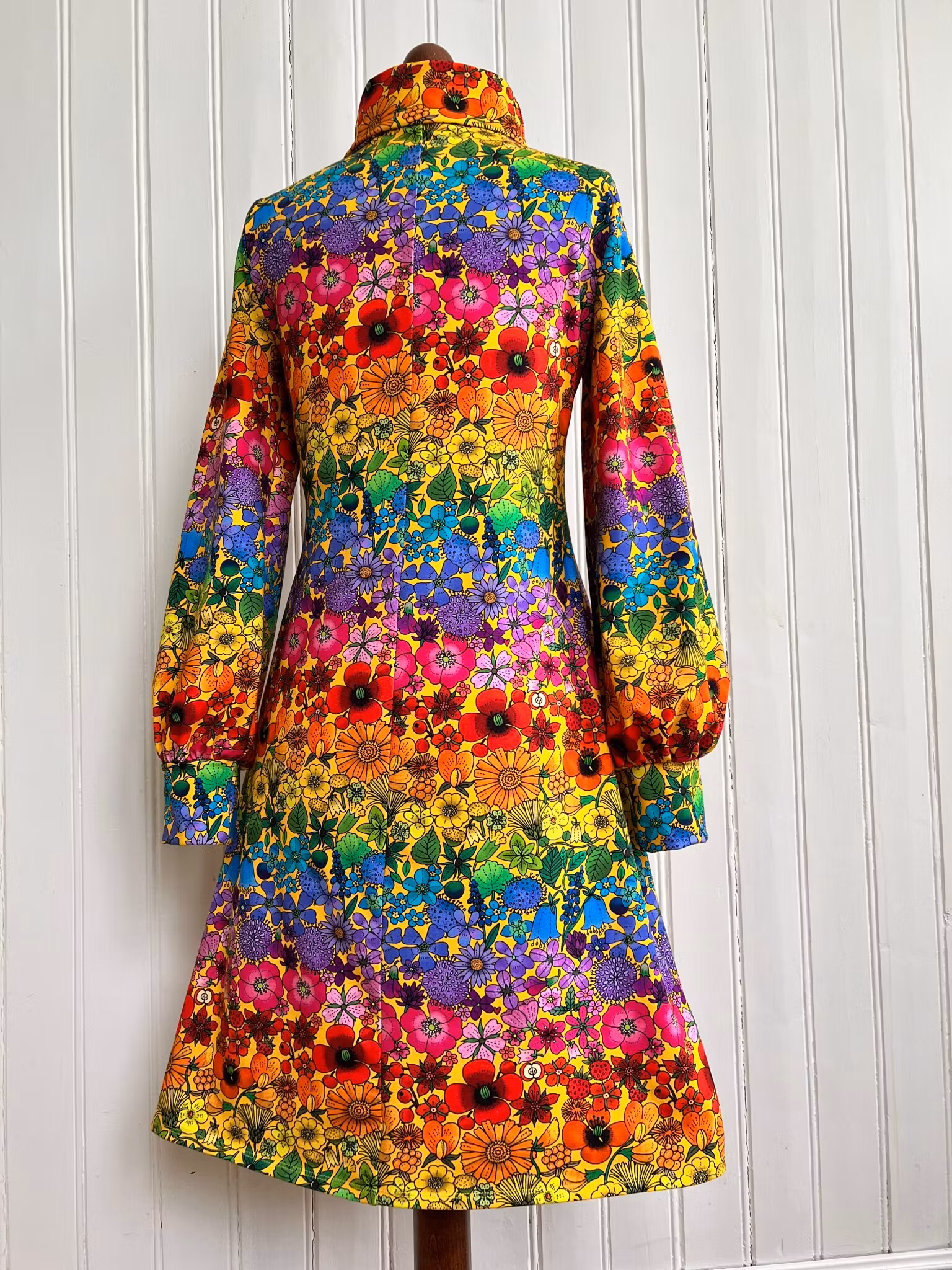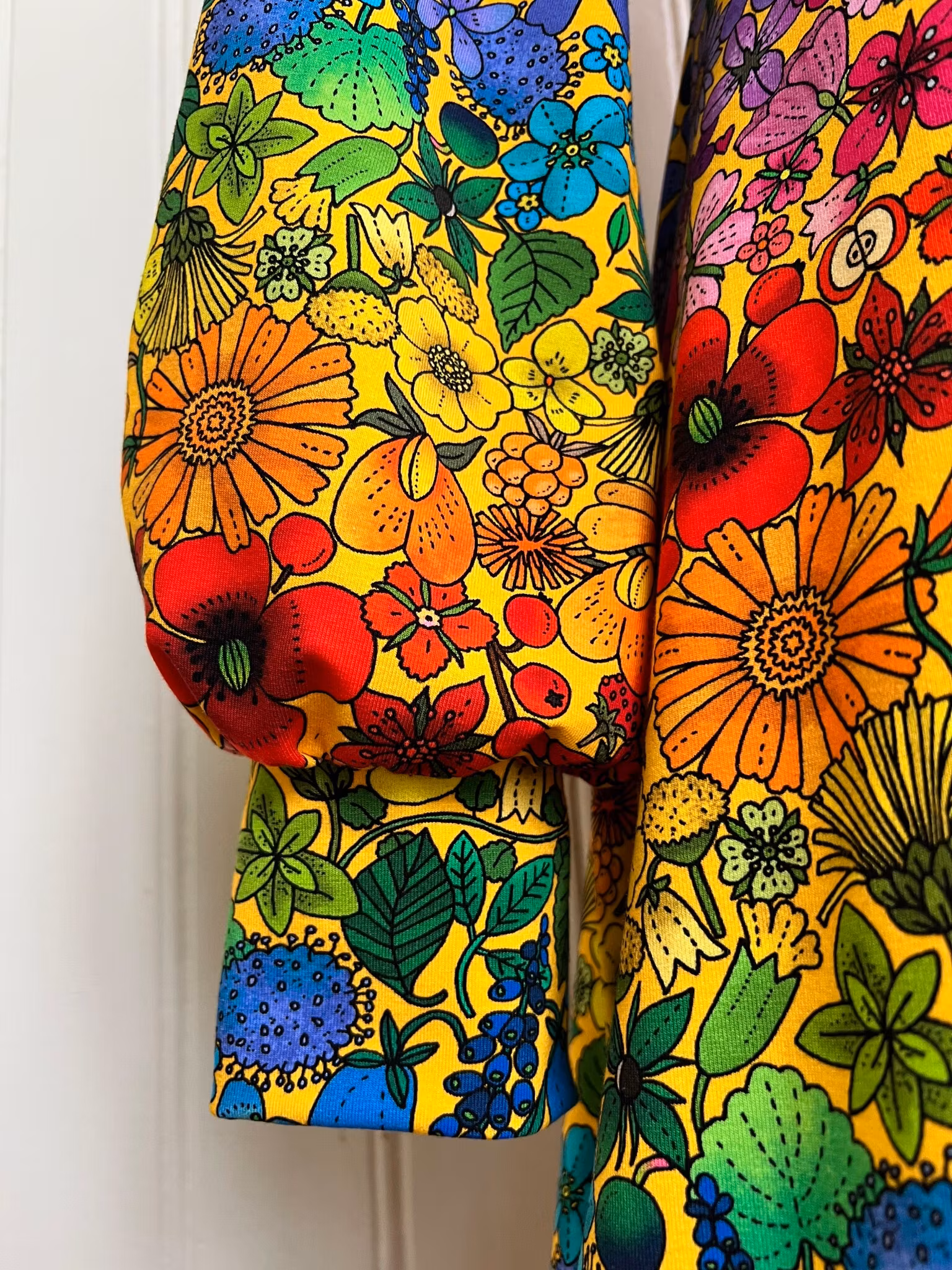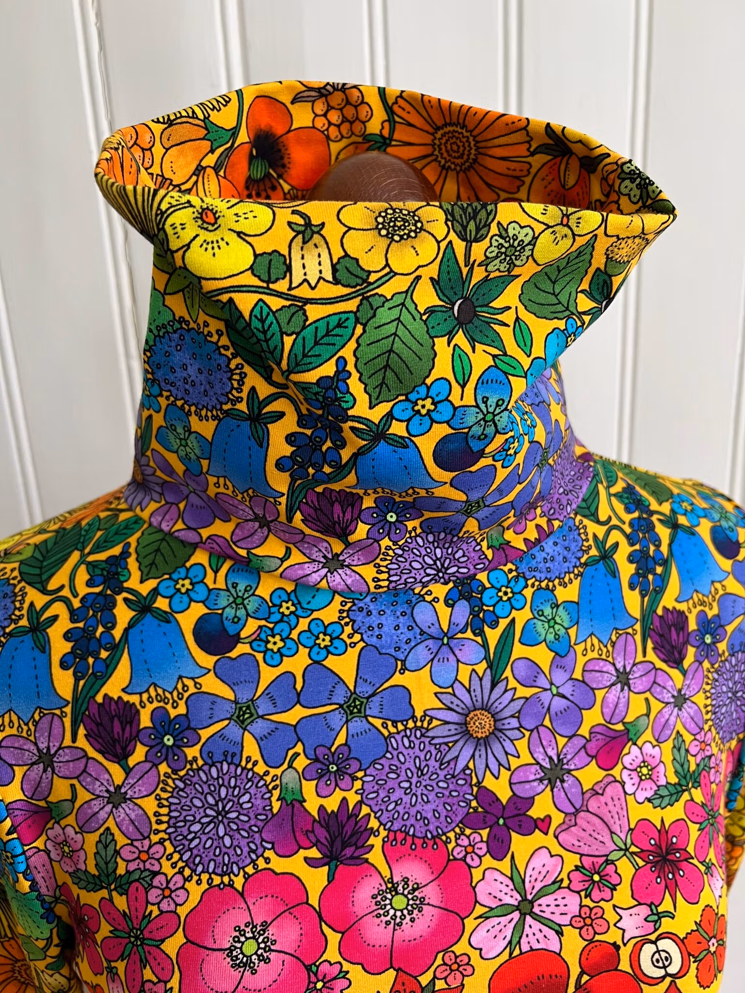 Det vackra tyget är designat av Eplaros för Vintage in my heart och heter Regnbågsflora. Material 95 % ekologisk bomull och 5 % elastan, med gott om stretch i.