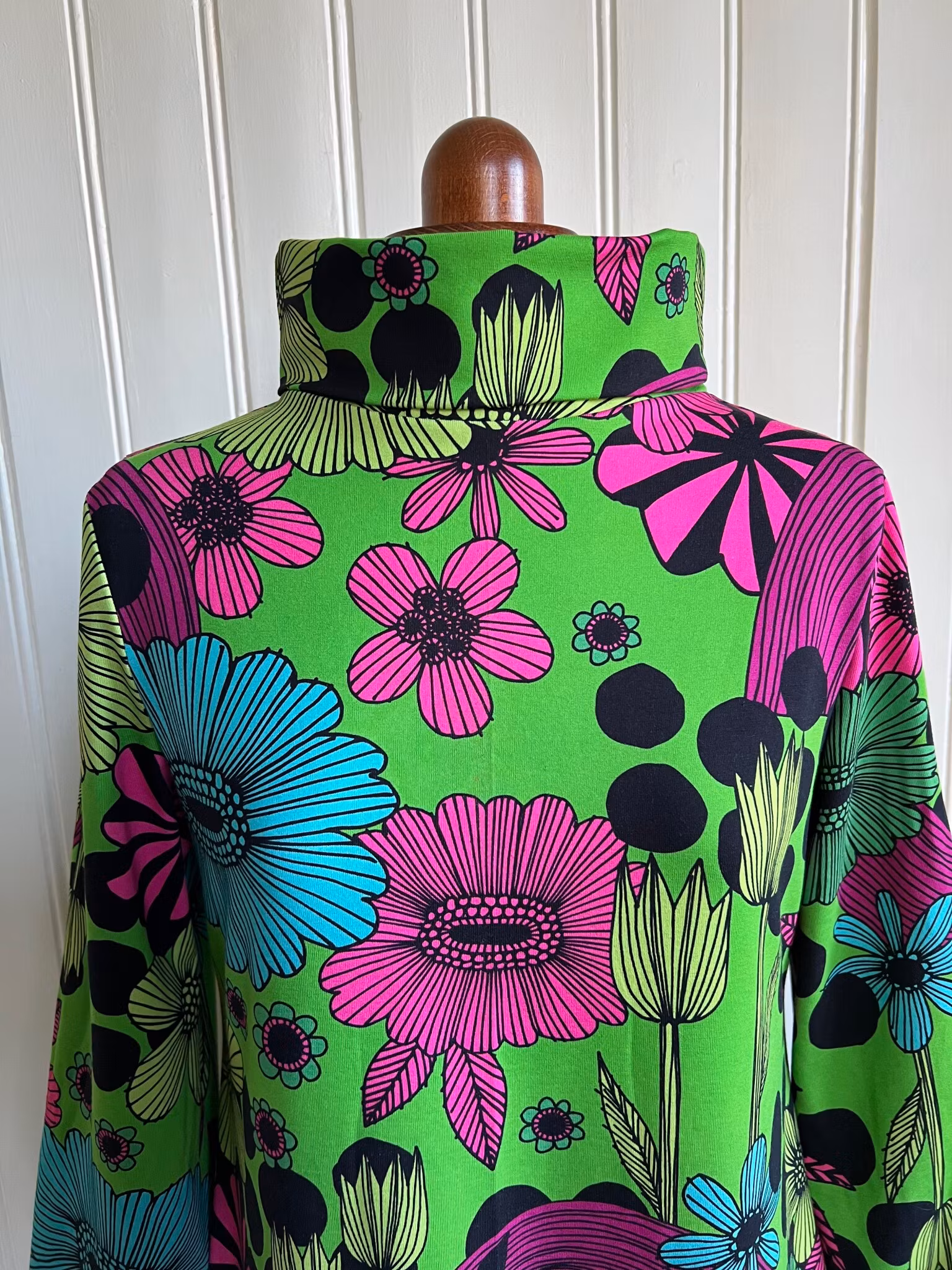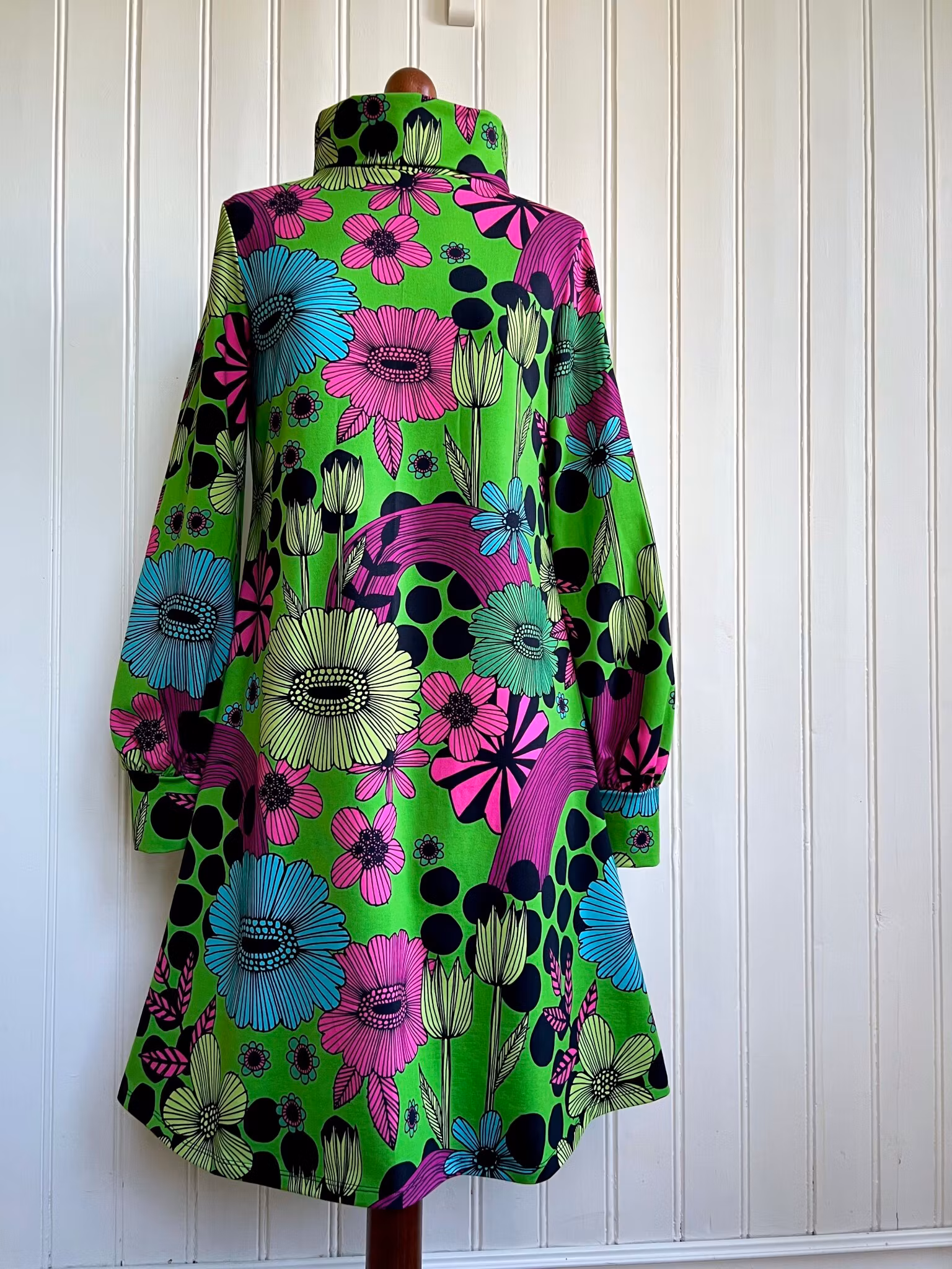 Klänning i A-linjemodell sydd i mjuk härlig bomullsjersey, med hög krage som kan dubbelvikas. Den sitter mer figurnära över bysten för att sedan få vidd över stussen. Klänningen har en lång ärm med mycket vidd nertill, som samlas ihop med en mudd i samma tyg.