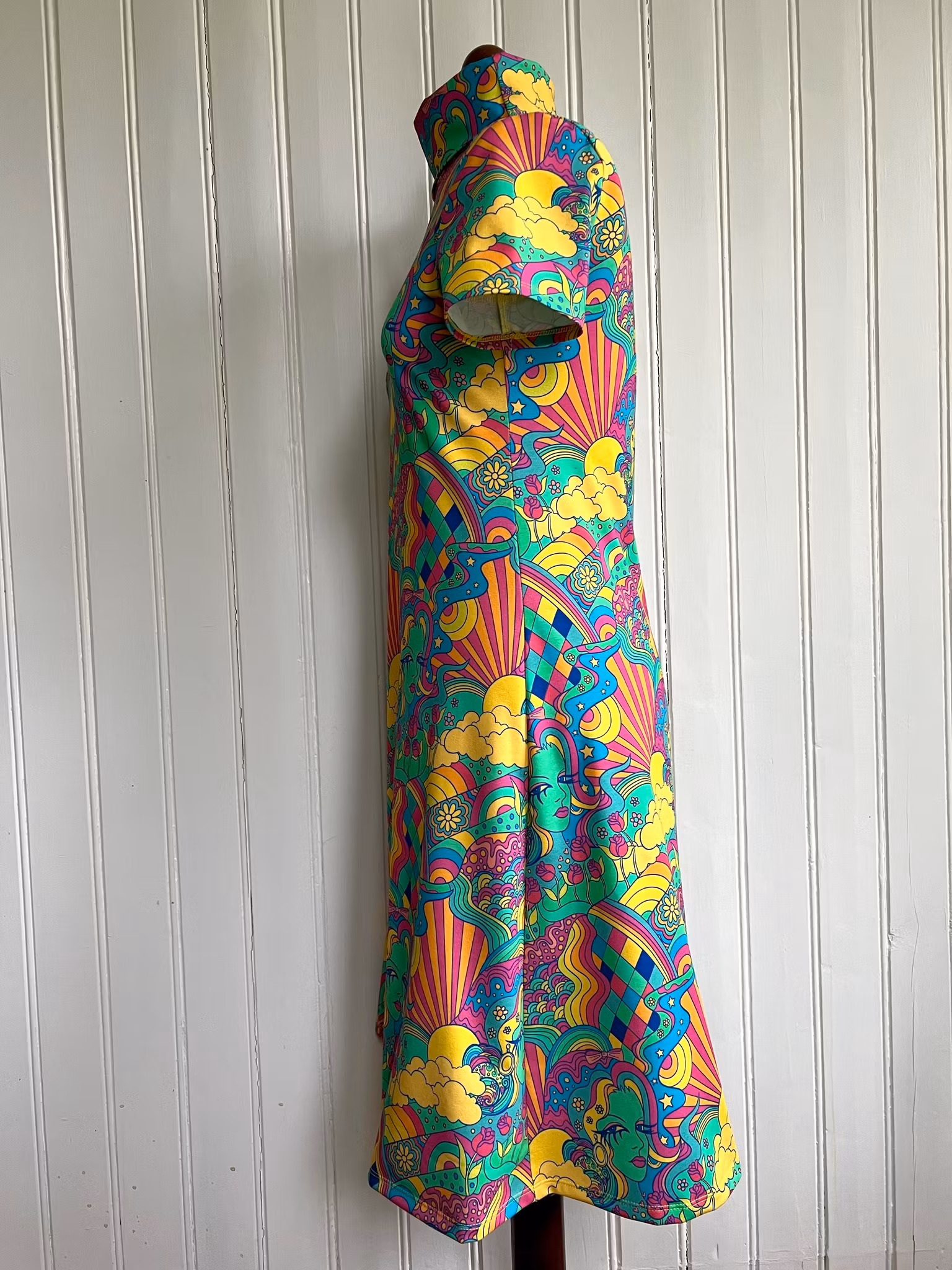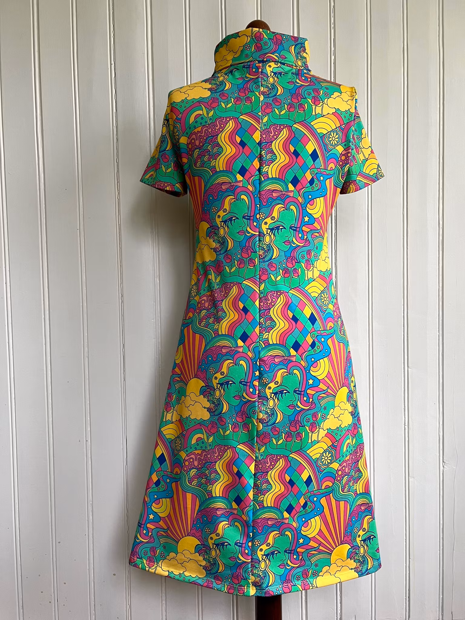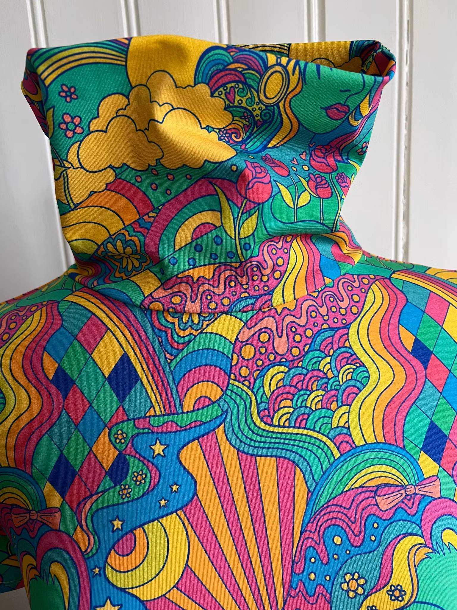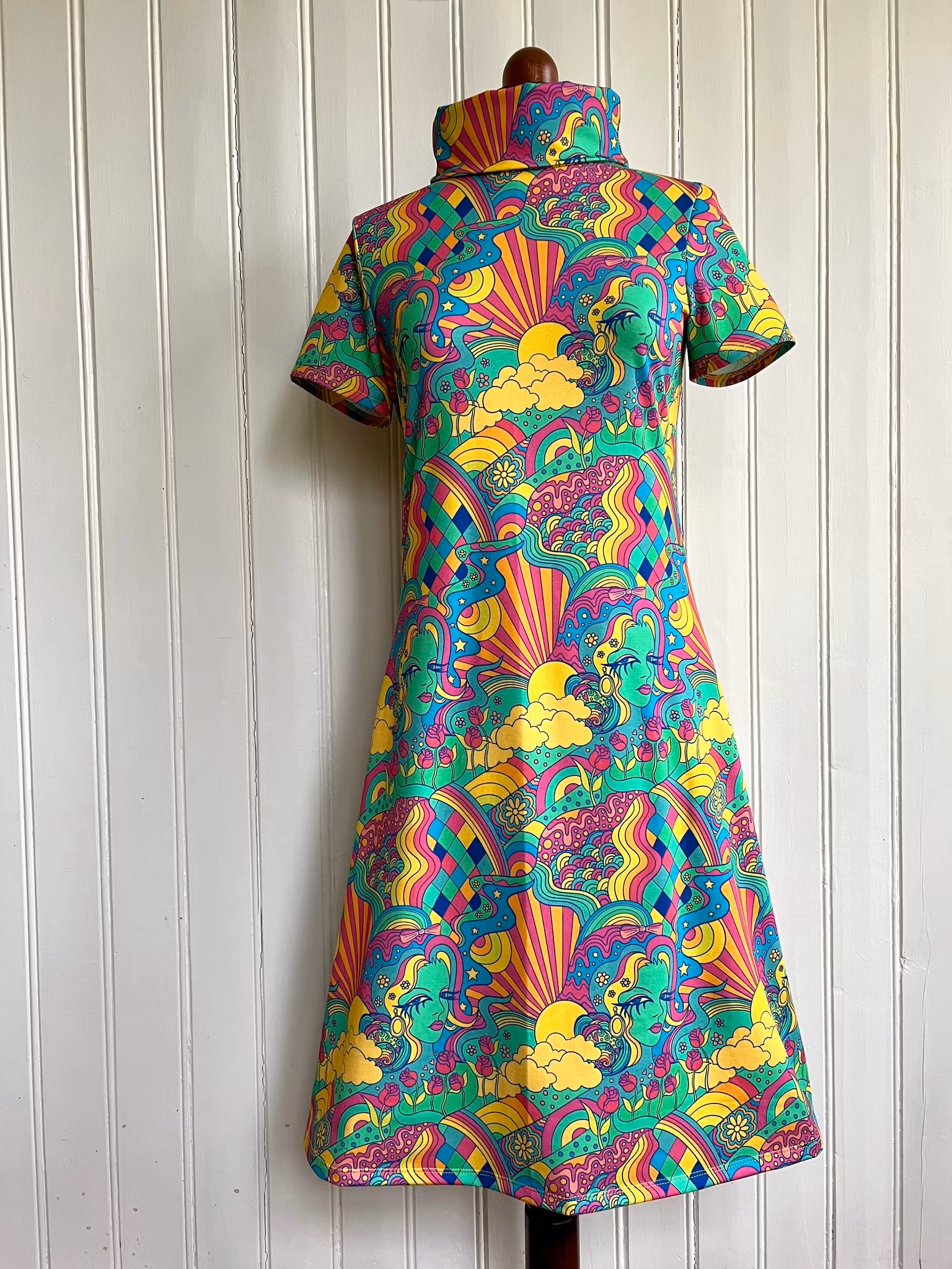 Klänning i A-linjemodell sydd i mjuk härlig bomullsjersey, med hög krage som kan dubbelvikas. Sitter mer figurnära över bysten för att sedan få vidd över stussen. Det härliga tyget är designat av Karly Art Design för Juels Danmark. Material 95 % ekologisk bomull och 5 % elastan, med gott om stretch i. Löst skärp i samma tyg kommer med.