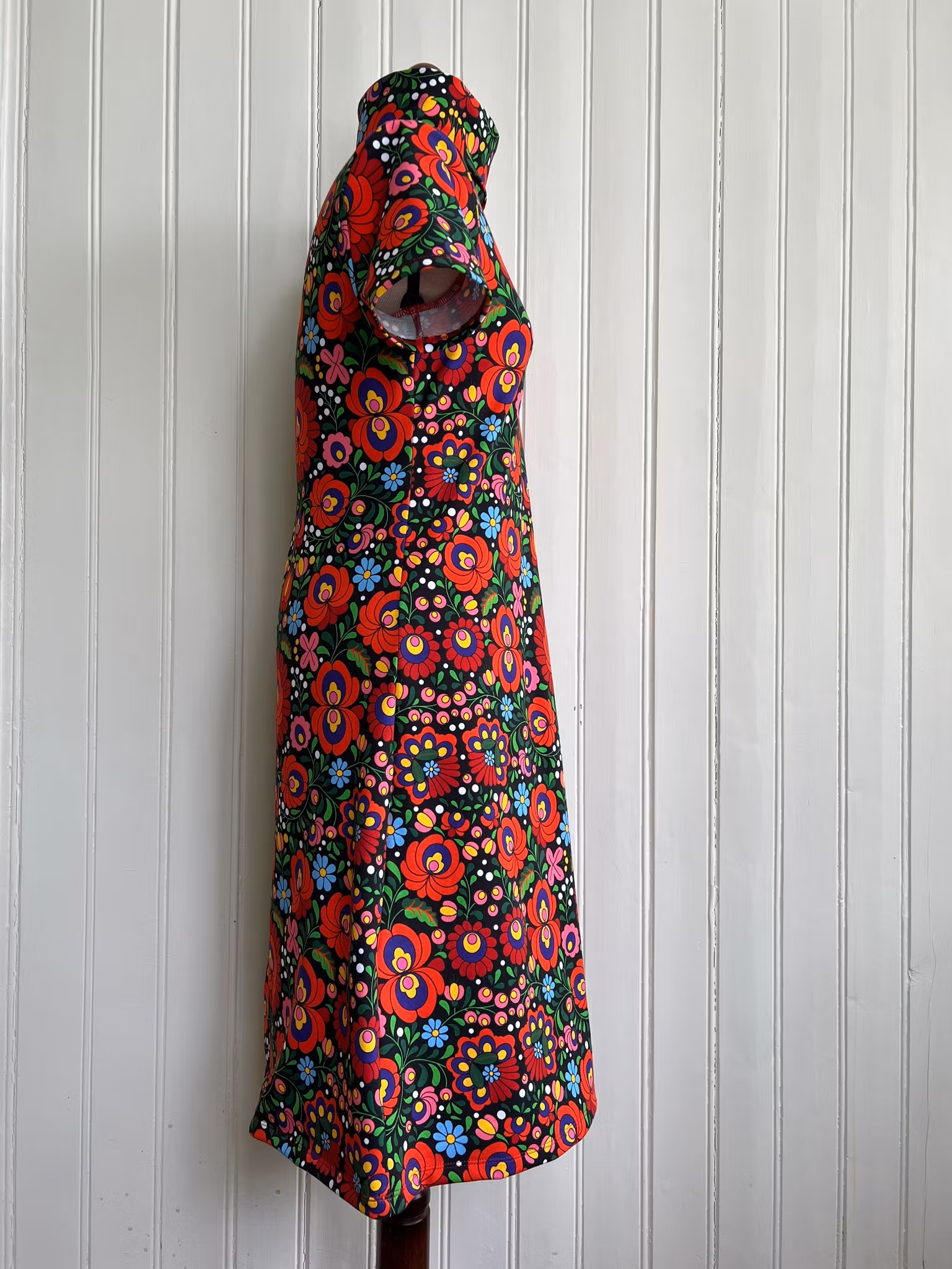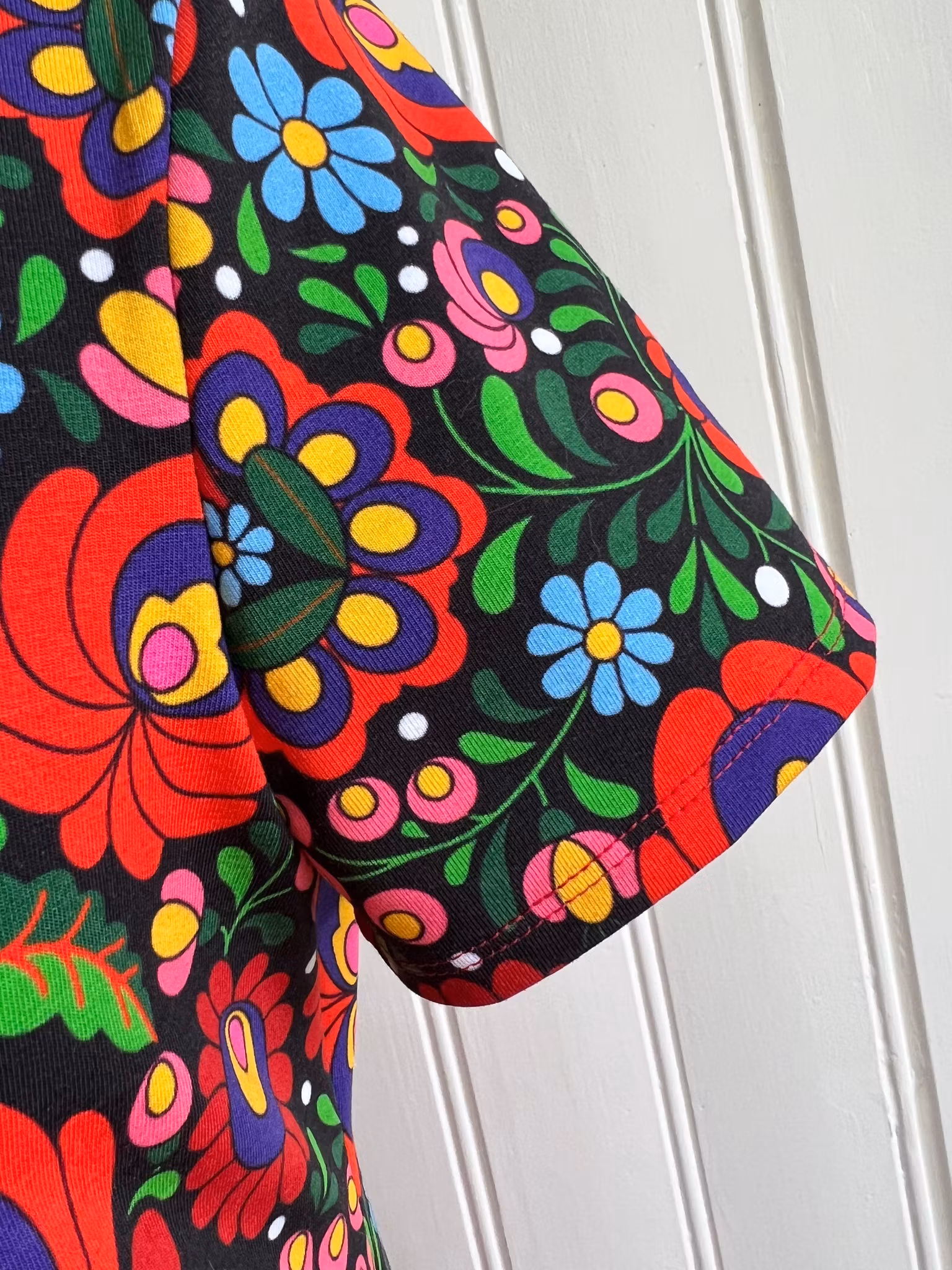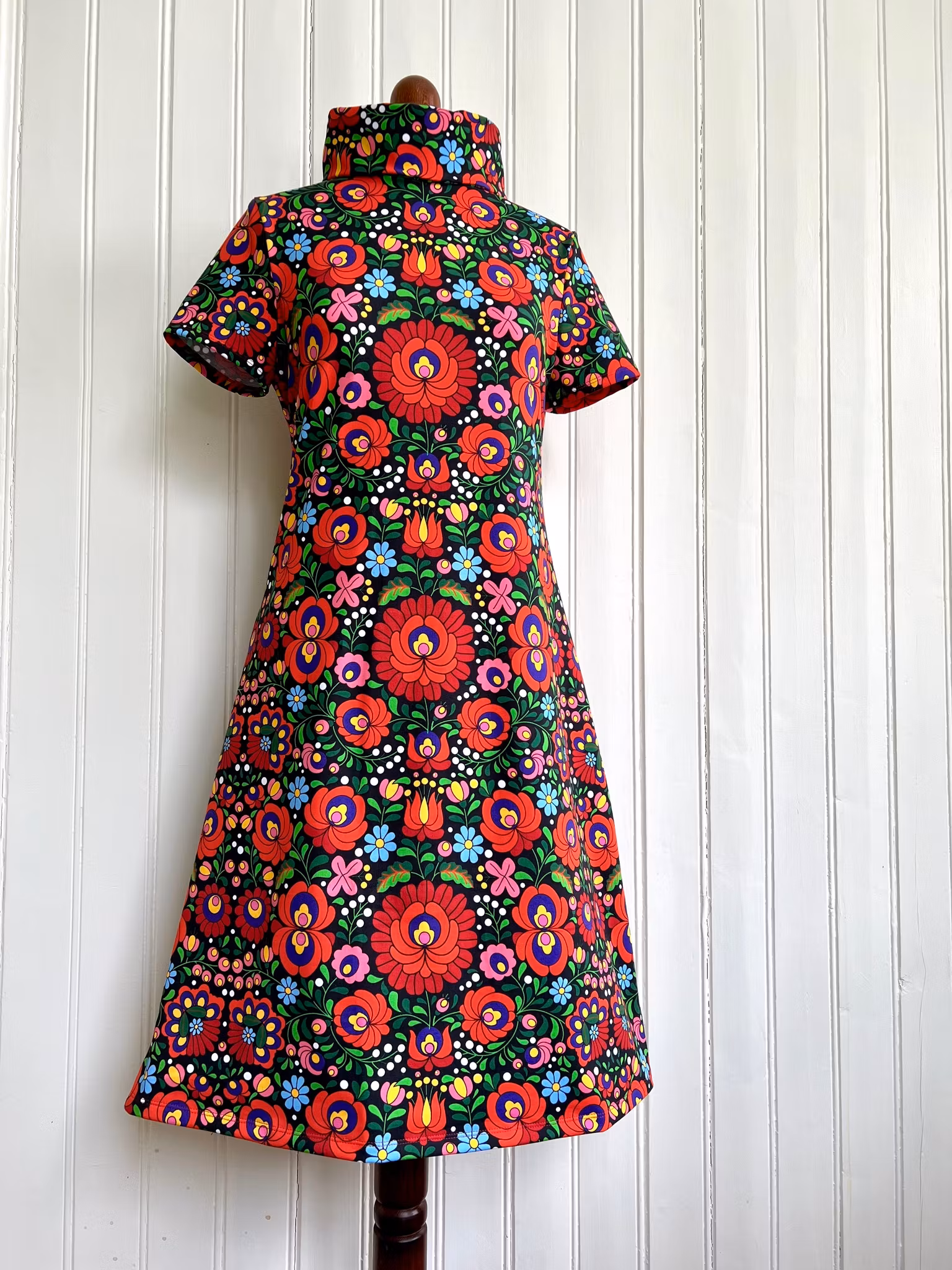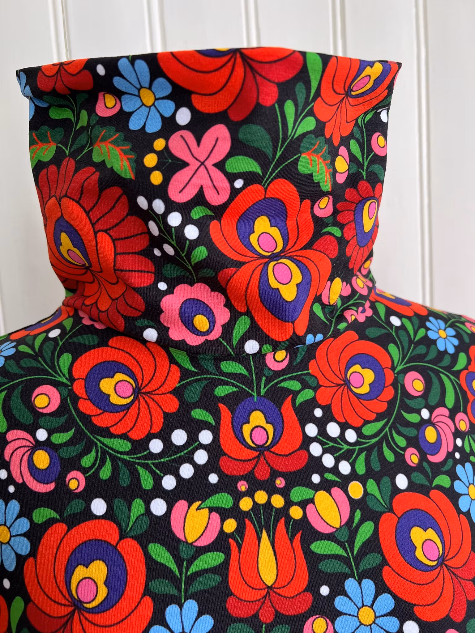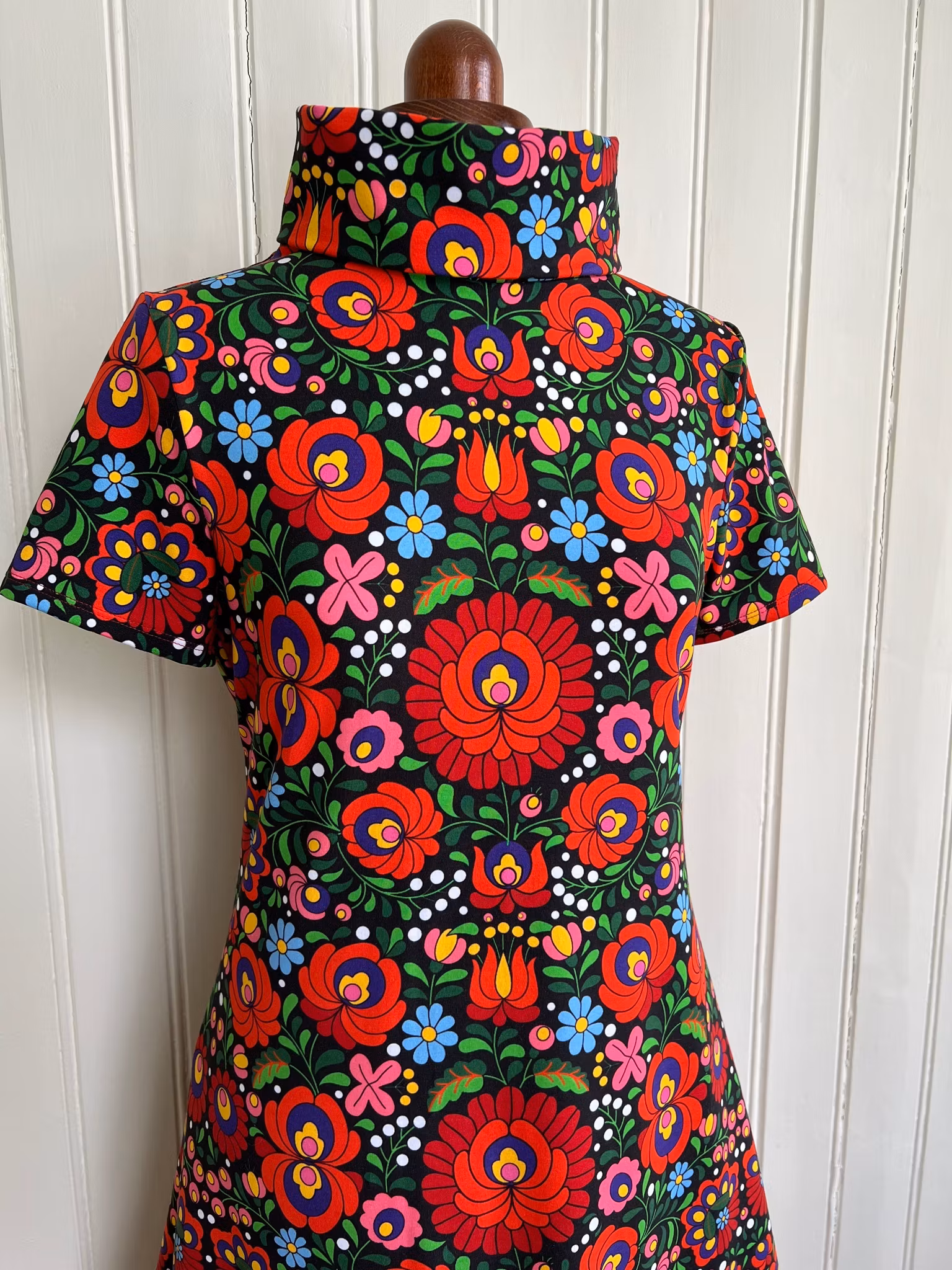 Klänning i A-linjemodell sydd i bomullsjersey, med hög krage som kan dubbelvikas. Sitter mer figurnära över bysten för att sedan få vidd över stussen. Kragen värmer skönt runt halsen utan att sitta åt. Underbart mjuk skön GOTS-certifierad jersey i 95 % bomull och 5 % elastan, med gott om stretch i.