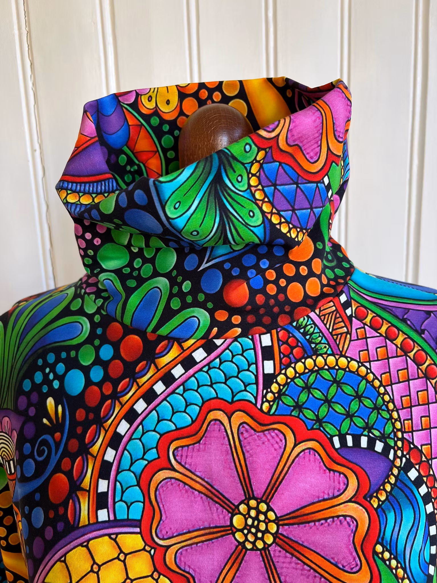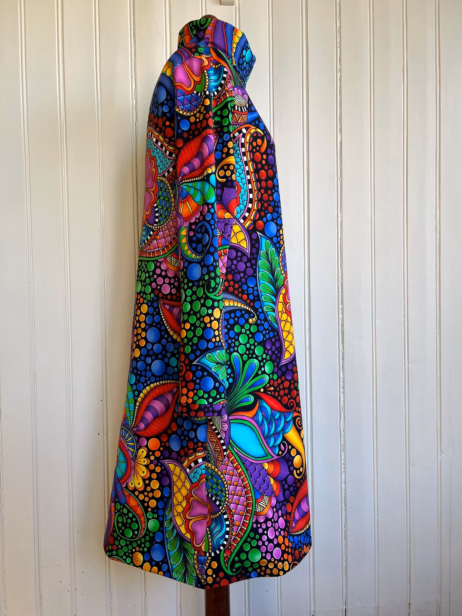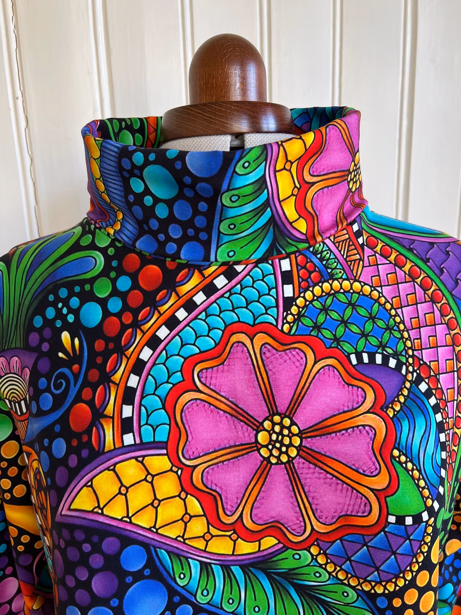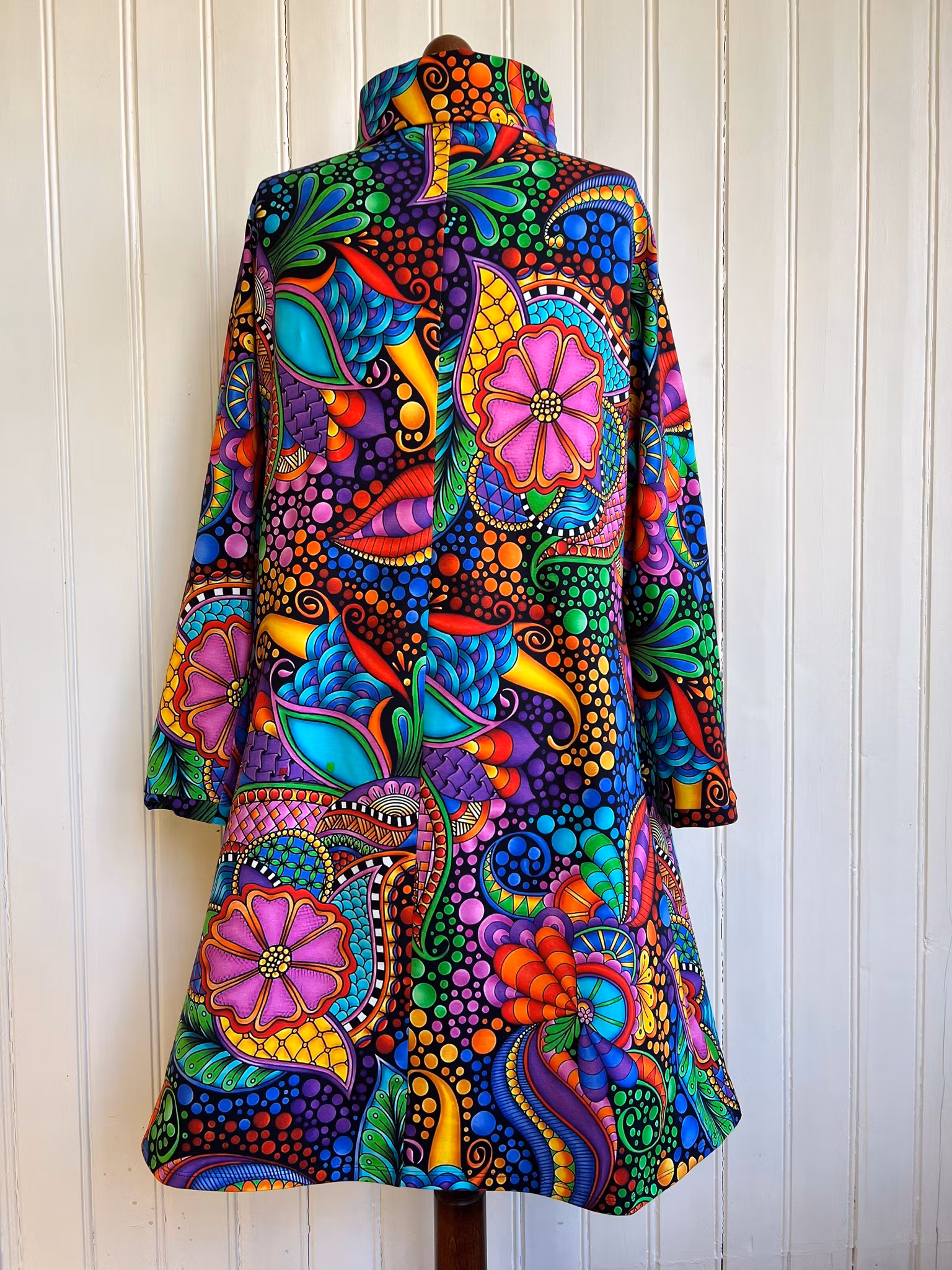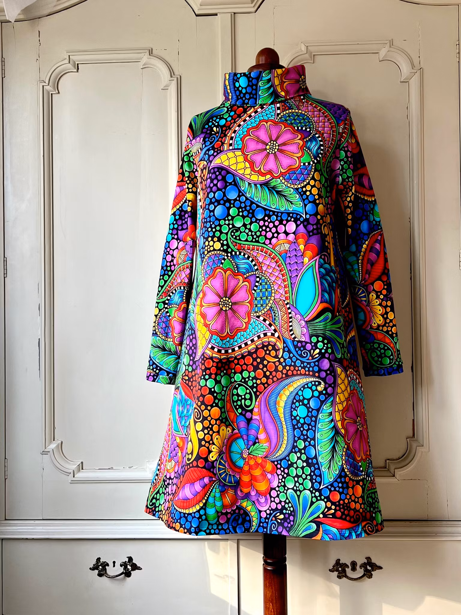 Klänning i A-linjemodell sydd i bomullsjersey. Den har en hög krage som dubbelviks och hellång smal ärm. Klänningen sitter mer figurnära över bysten och har sedan mycket vidd i kjolen.