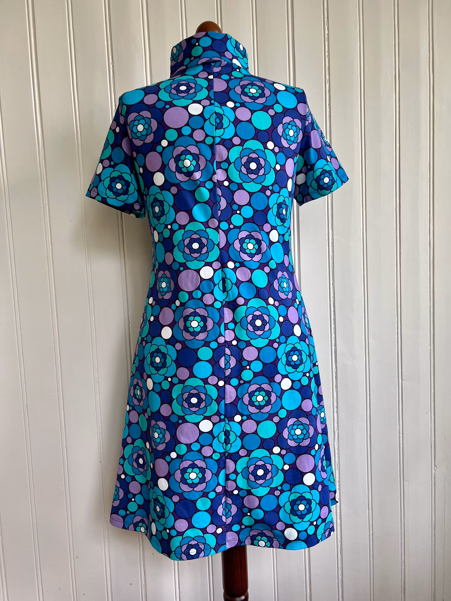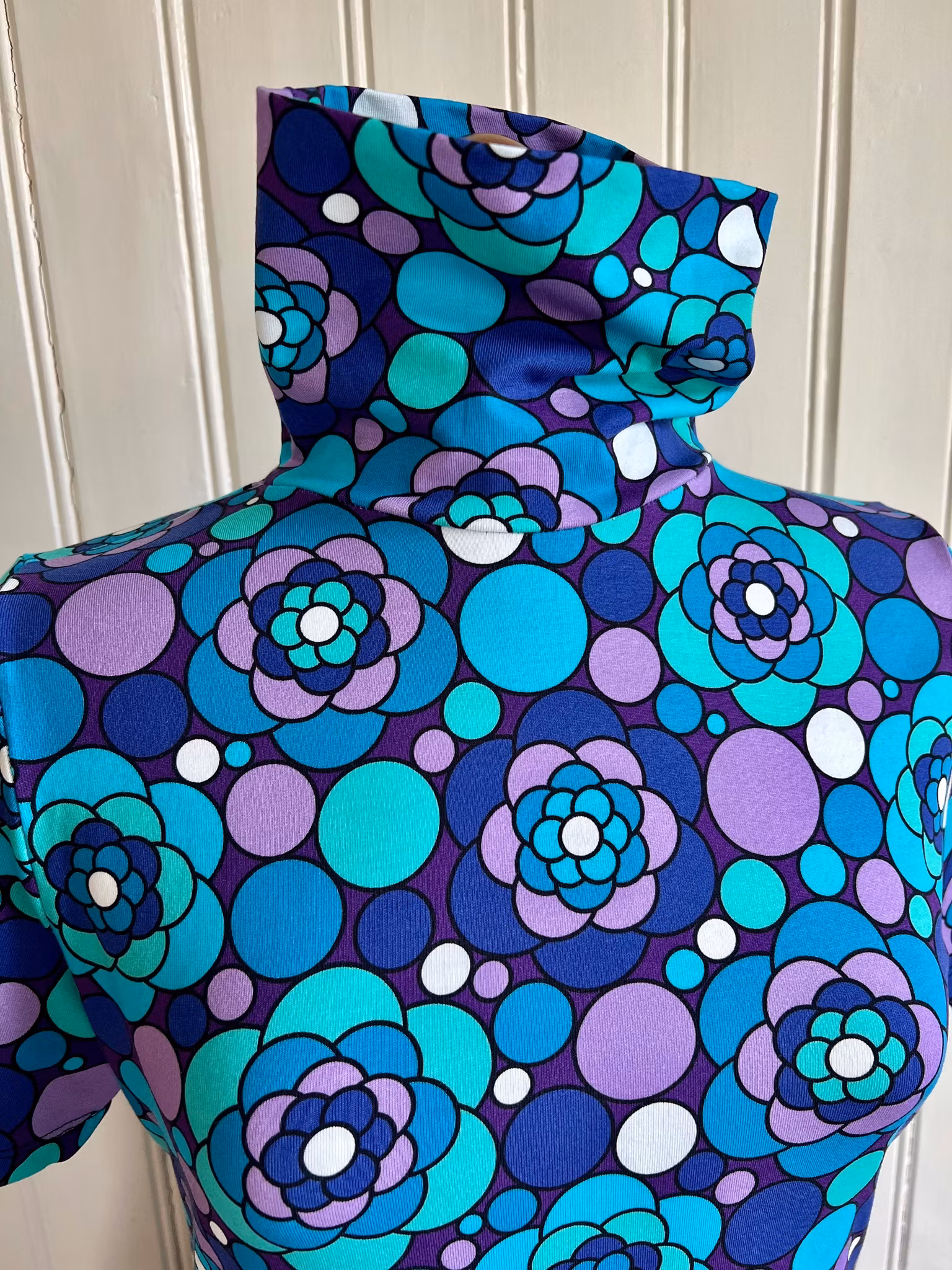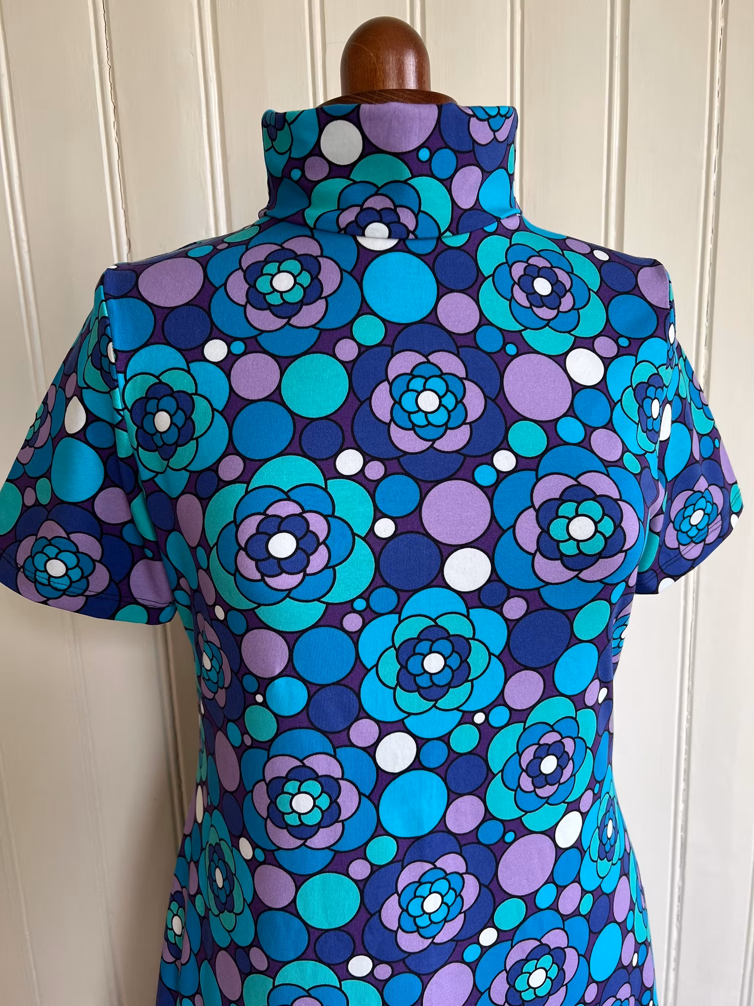 Klänning i A-linjemodell med hög krage som kan dubbelvikas. Sitter mer figurnära över bysten för att sedan få vidd över stussen. Kragen är något smalare än jag numera gör på denna modell då detta är ett tidigare ex som inte kommit ut i webbshopen förrän nu. Mjuk skön jersey i 95 % bomull och 5 % elastan. Tyget är designat av Shalmiak för Vintage in my heart.