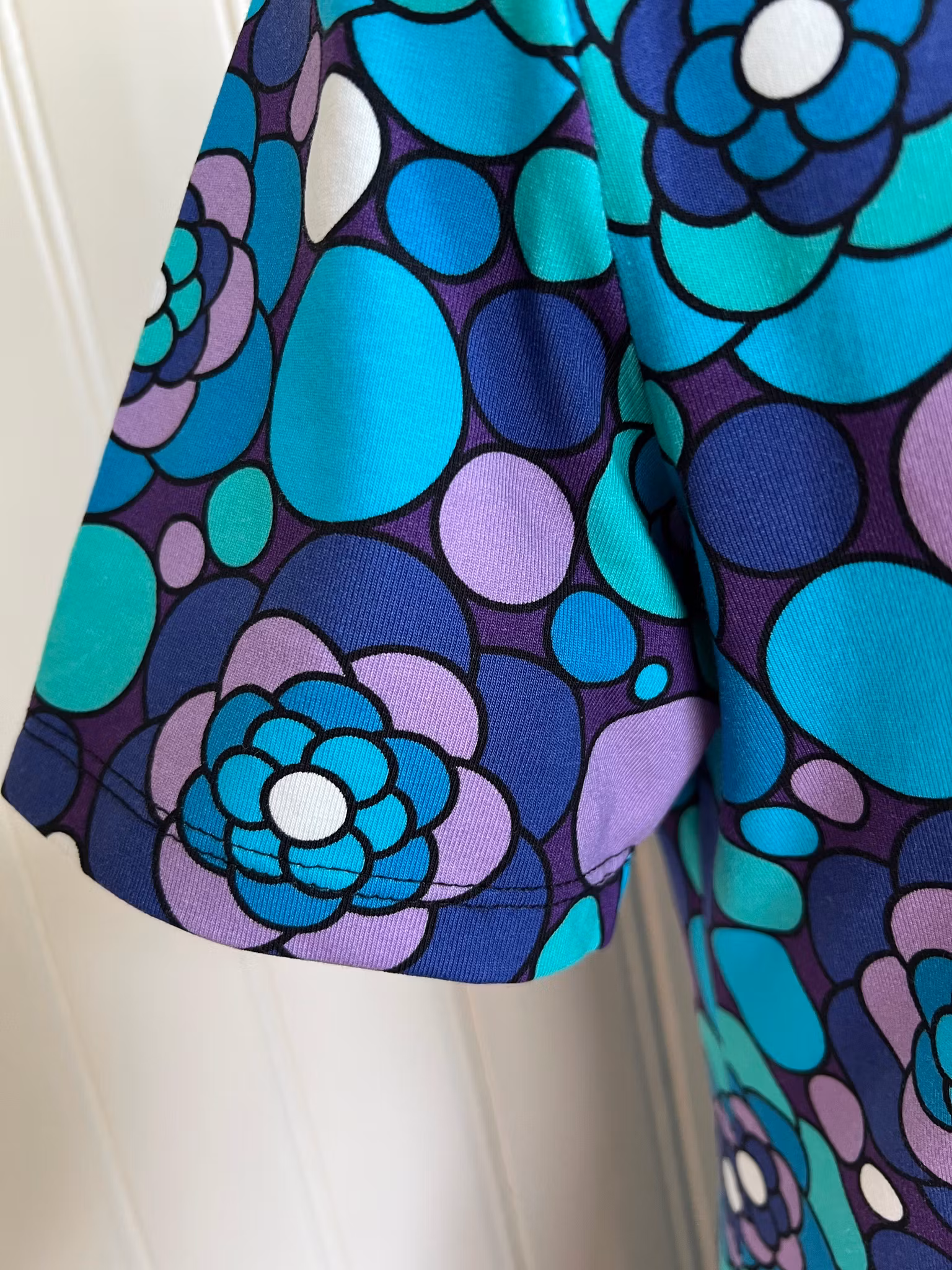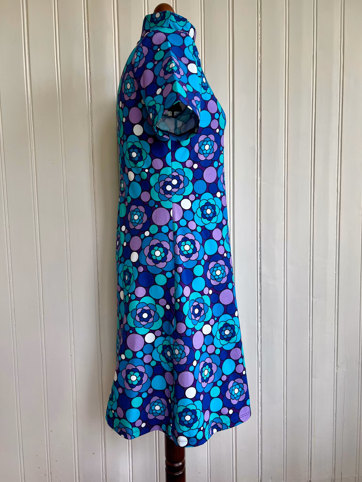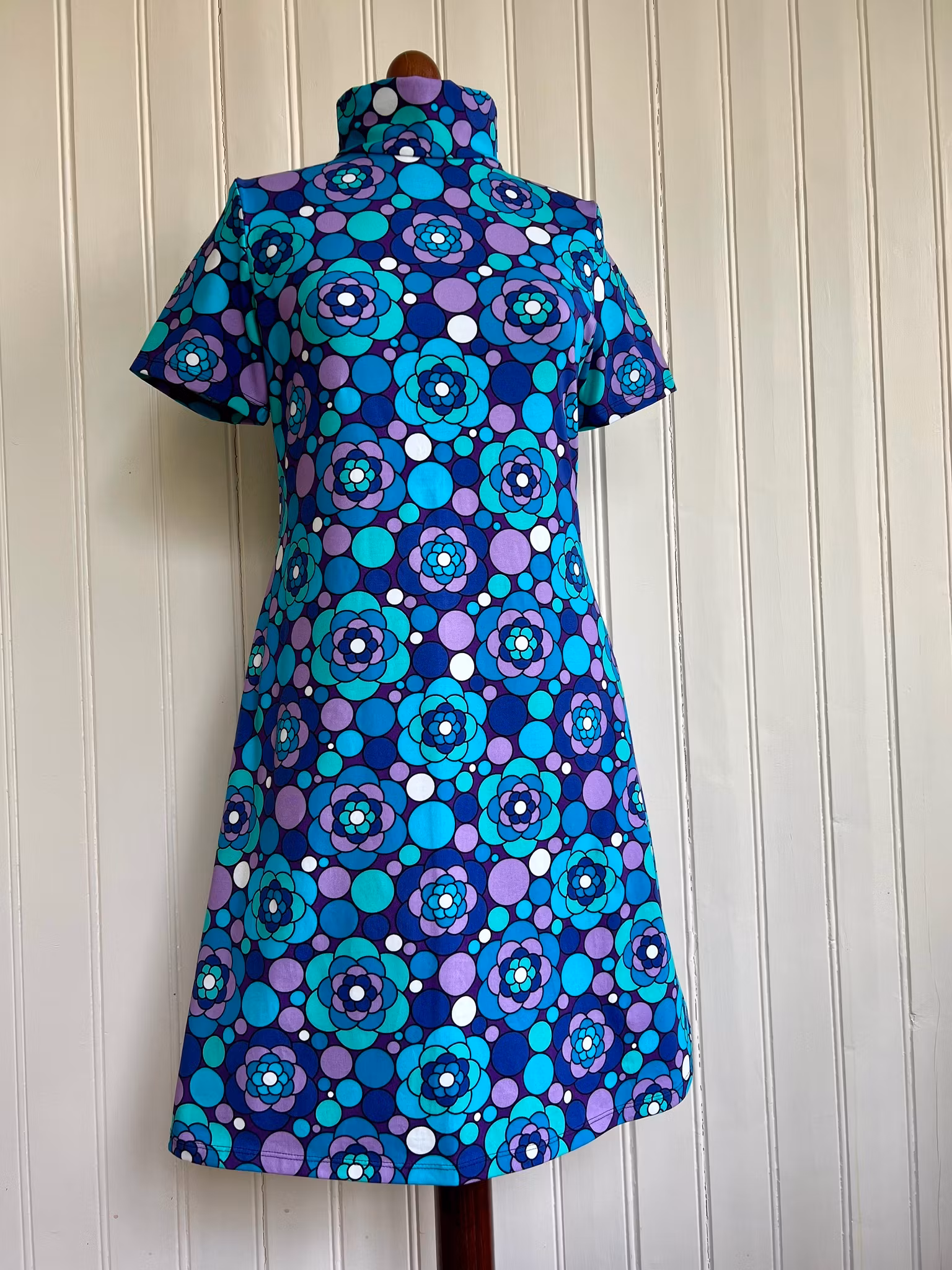 Klänning i A-linjemodell med hög krage som kan dubbelvikas. Sitter mer figurnära över bysten för att sedan få vidd över stussen. Kragen är något smalare än jag numera gör på denna modell då detta är ett tidigare ex som inte kommit ut i webbshopen förrän nu. Mjuk skön jersey i 95 % bomull och 5 % elastan. Tyget är designat av Shalmiak för Vintage in my heart.