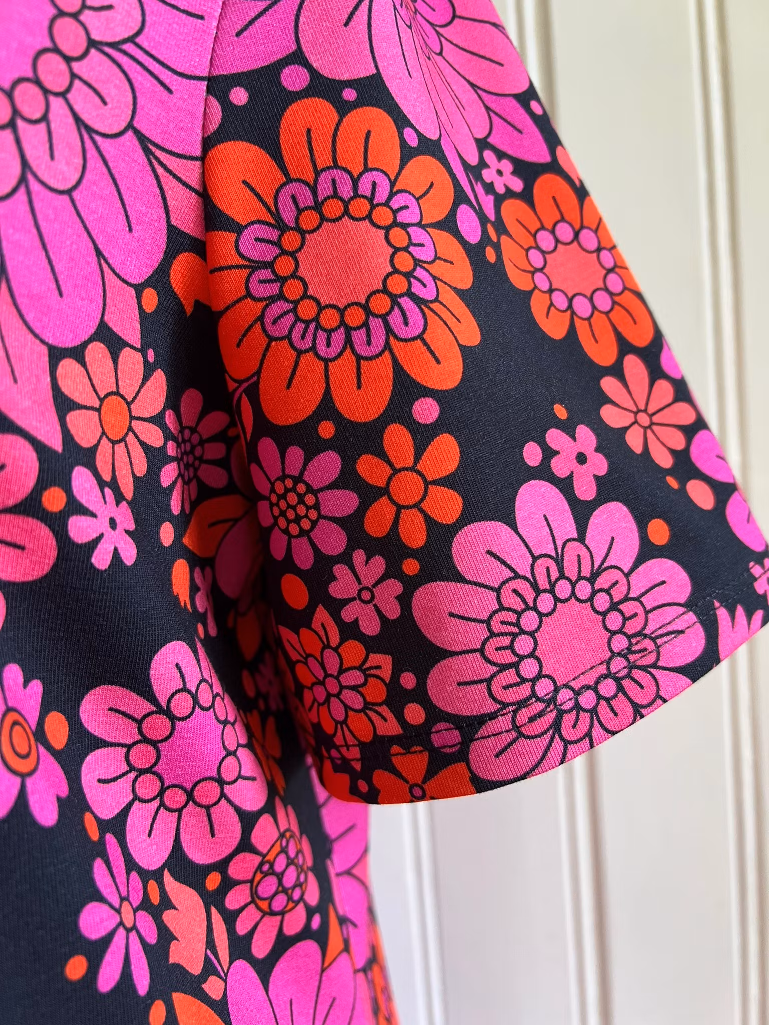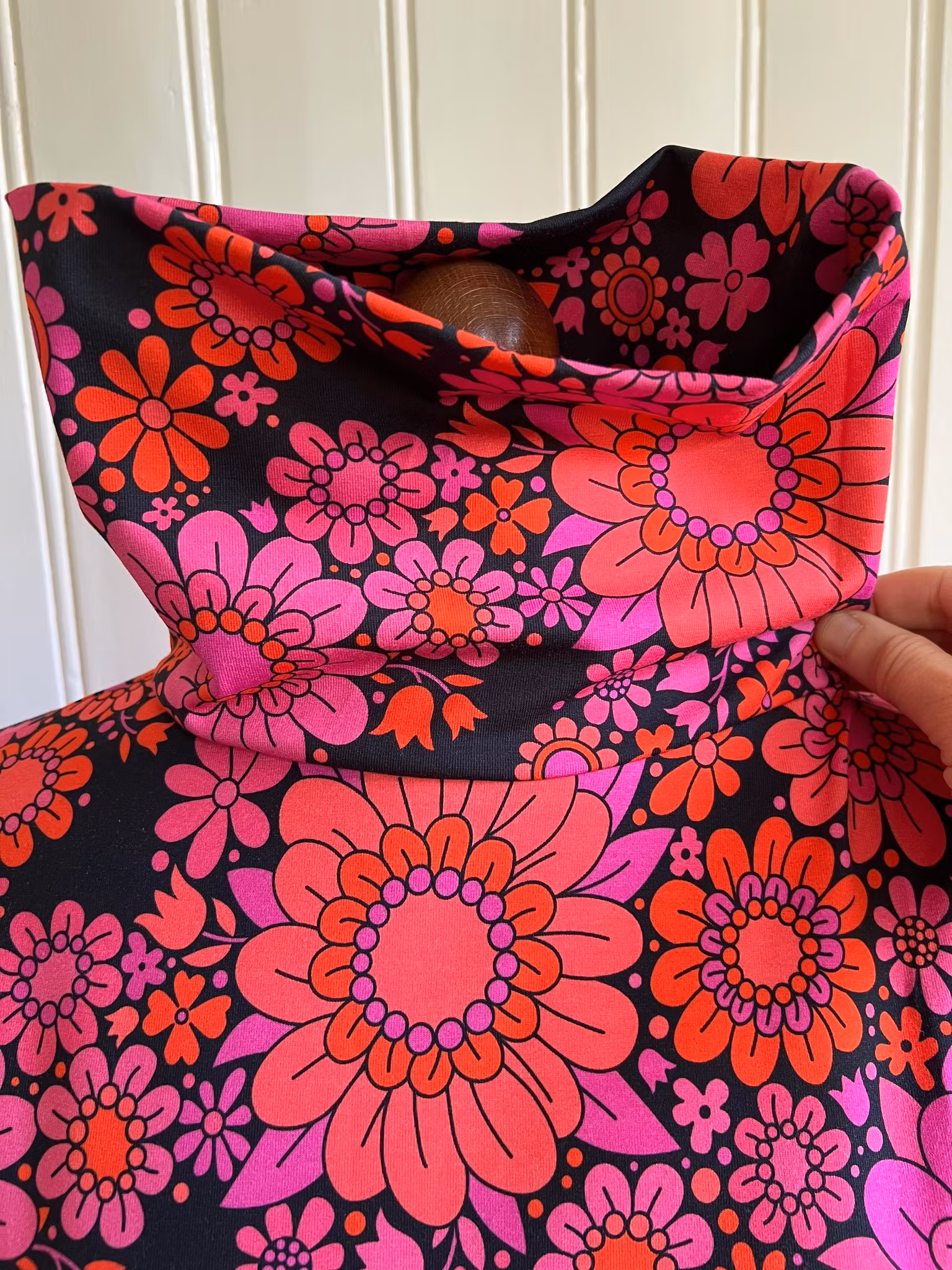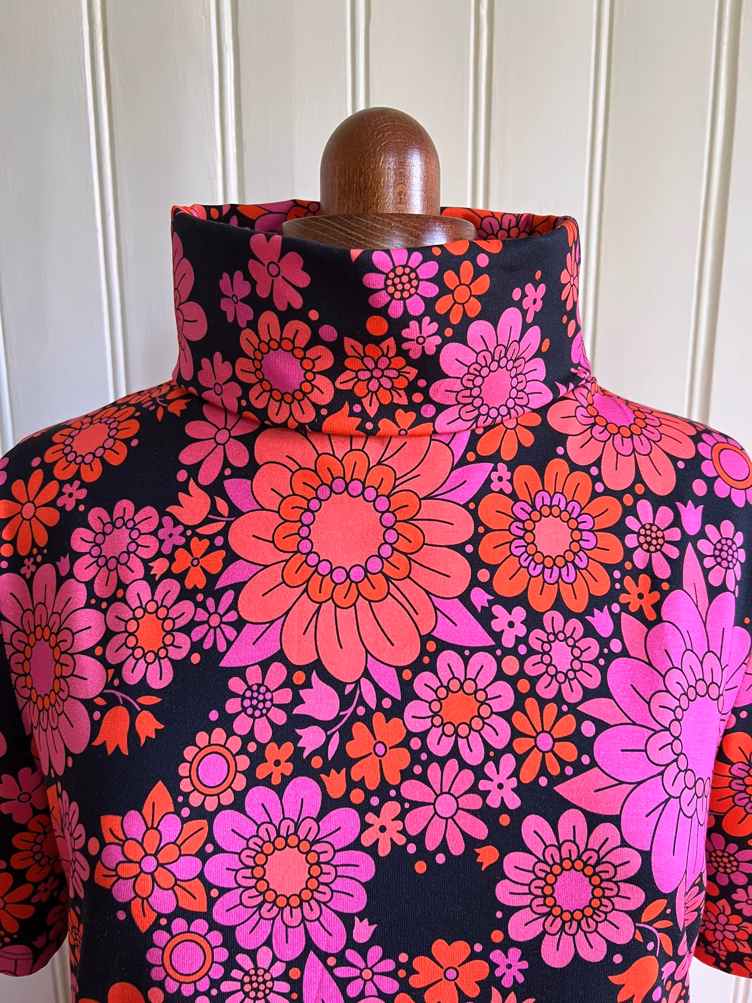 Klänning sydd i A-linjemodell i mjuk skön bomullsjersey. Hög krage som dubbelviks.