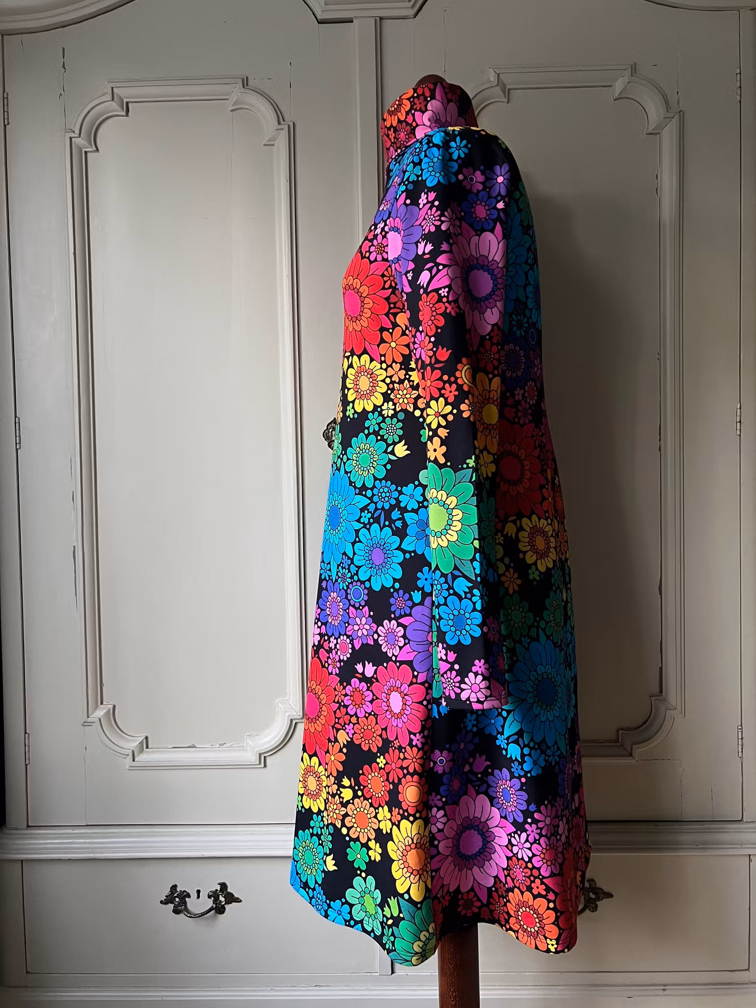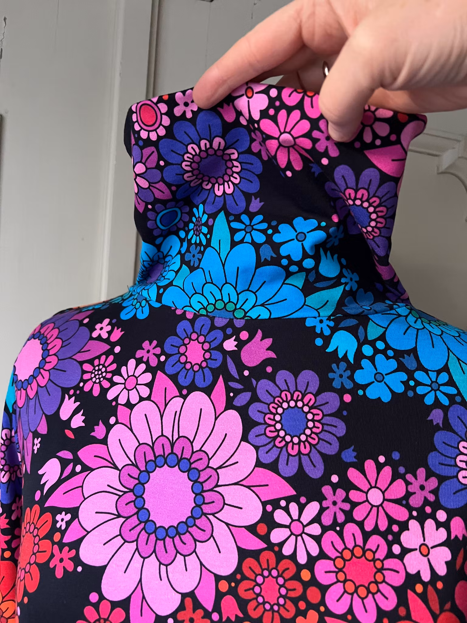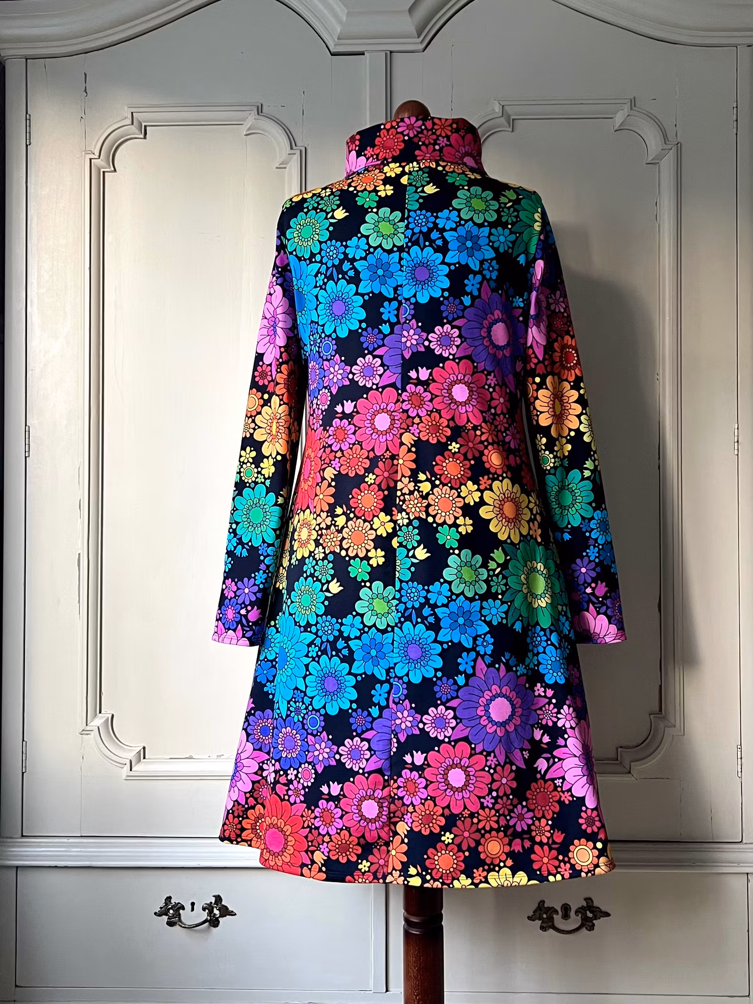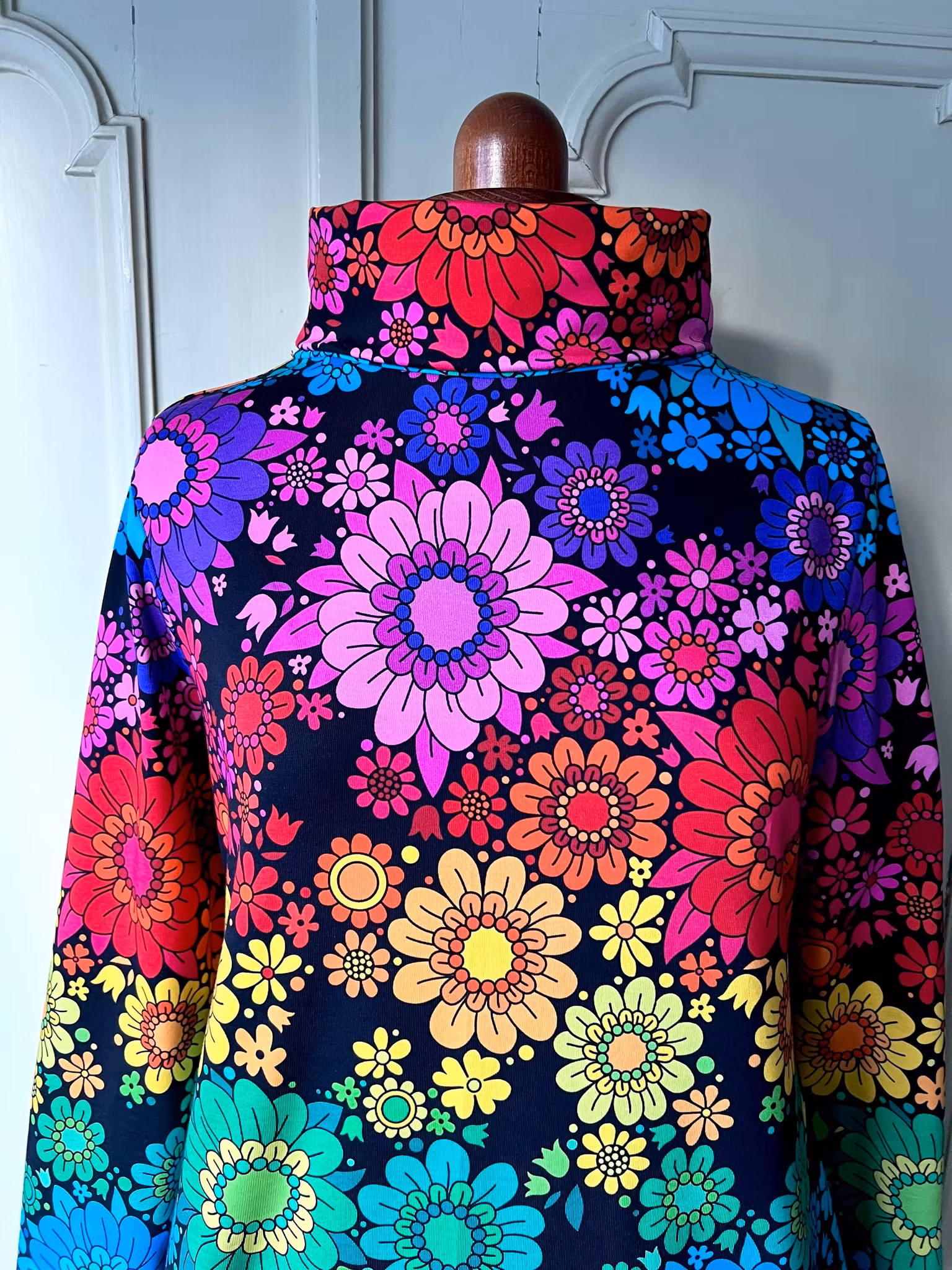 Klänning i A-linjemodell sydd i bomullsjersey, med hög krage som kan dubbelvikas. Sitter mer figurnära över bysten för att sedan få vidd över stussen. Kragen värmer skönt runt halsen utan att sitta åt. Hellång ärm.