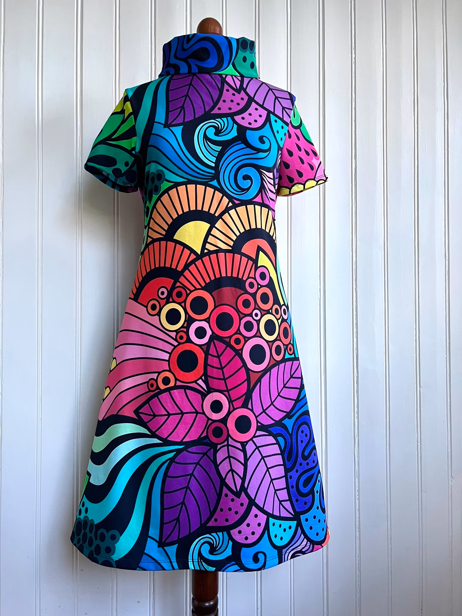 Klänning i A-linjemodell med hög krage som kan dubbelvikas. Sitter mer figurnära över bysten för att sedan få vidd över stussen. Kragen värmer skönt runt halsen utan att sitta åt. Mjuk skön jersey i 95 % bomull och 5 % elastan.