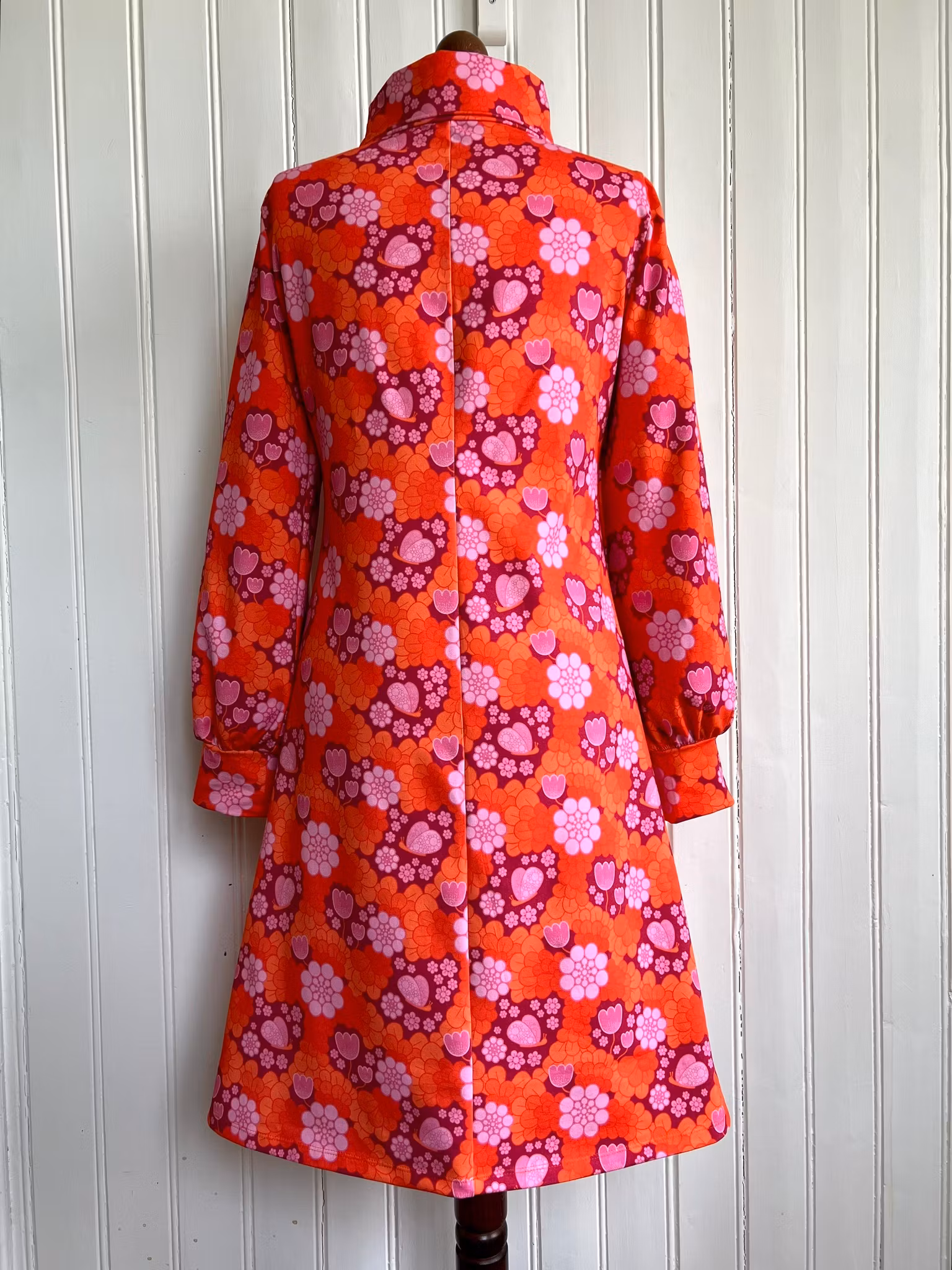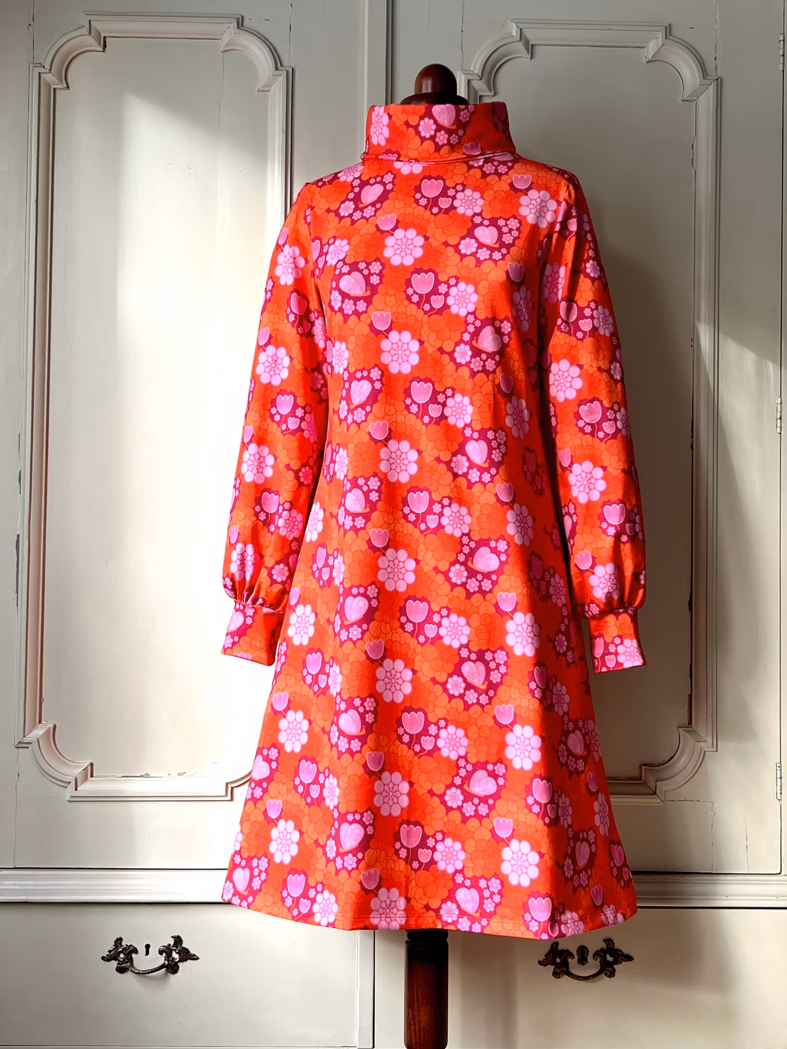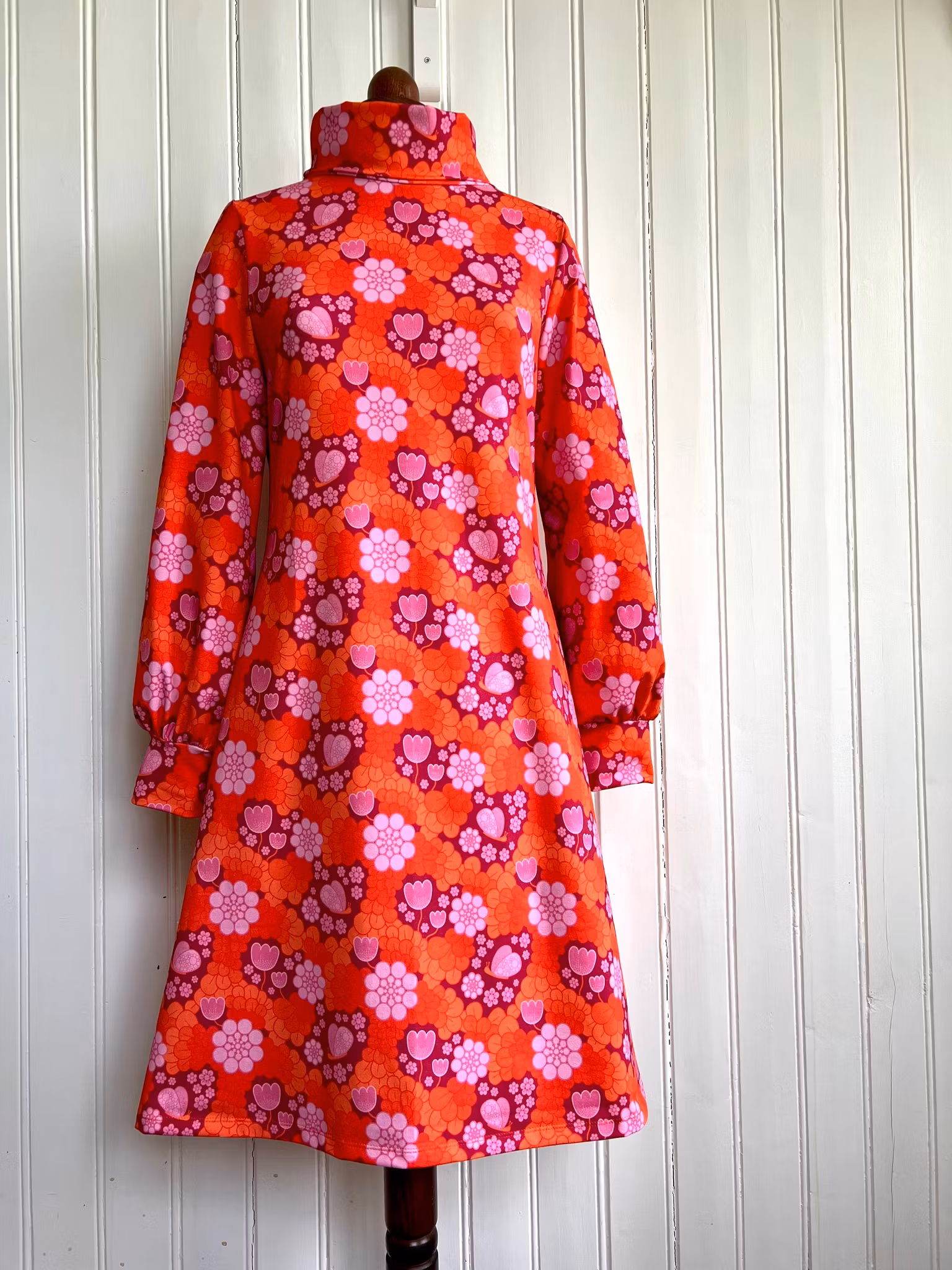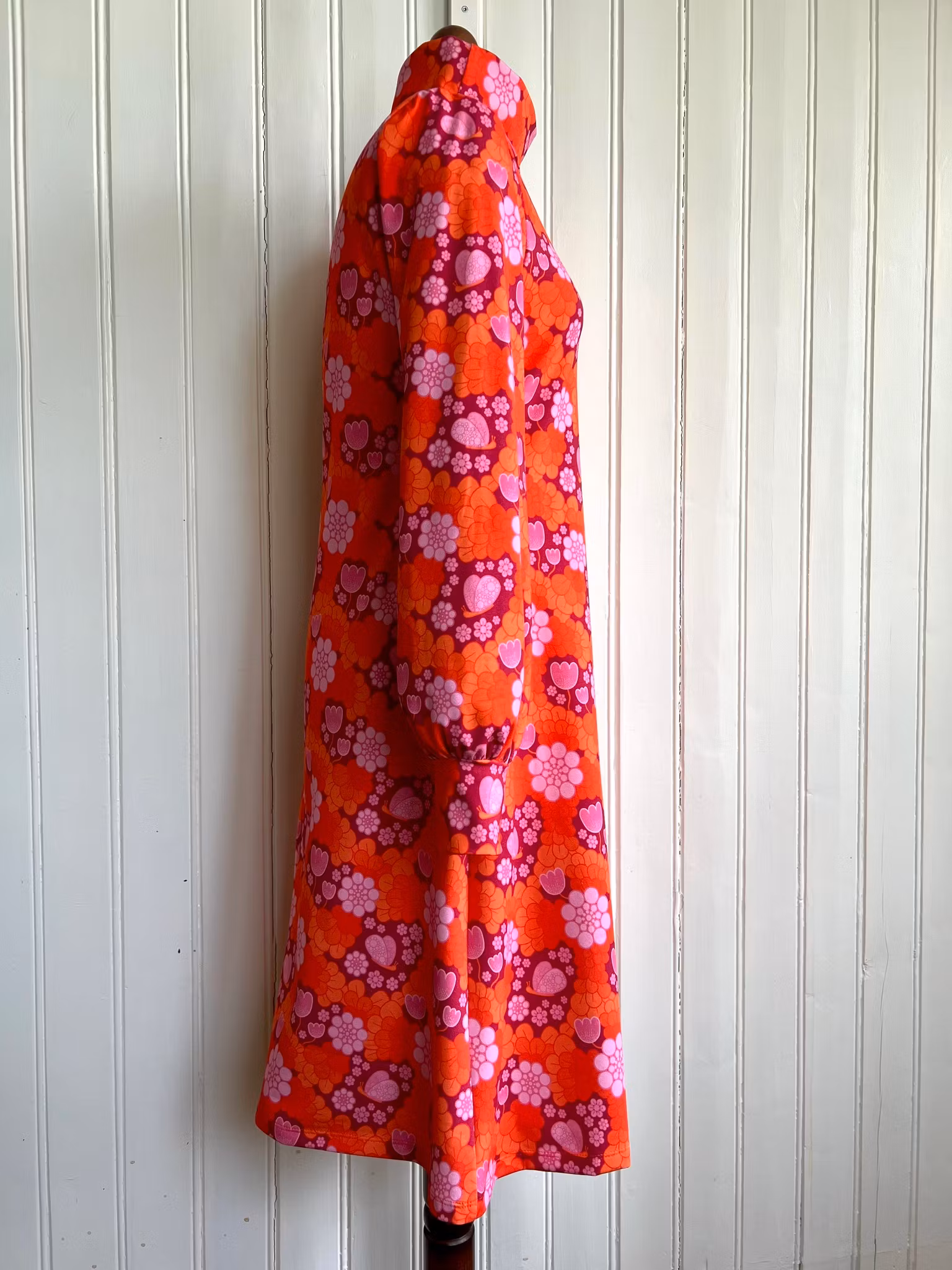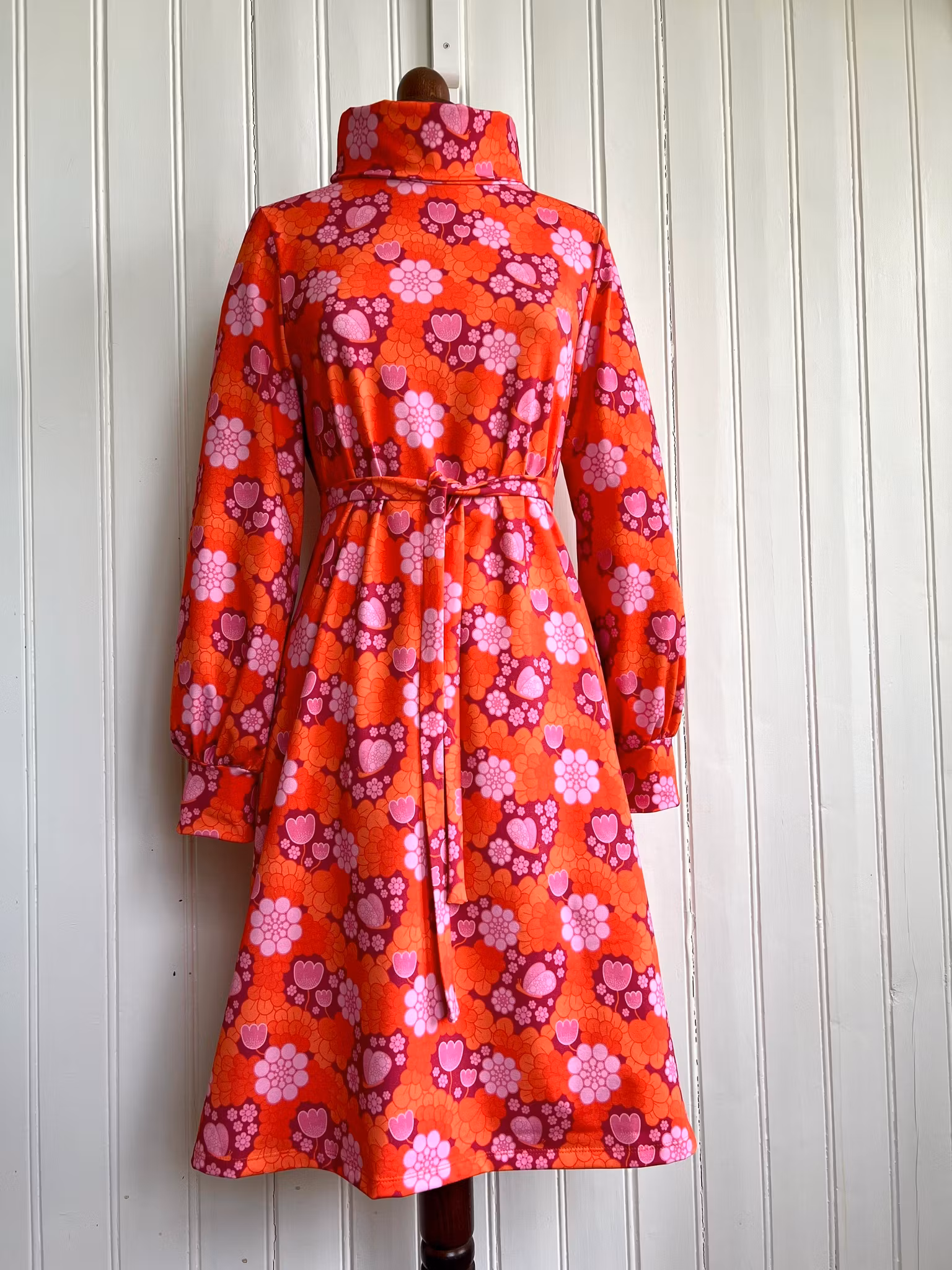 Klänning i A-linjemodell sydd i mjuk härlig bomullsjersey, med hög krage som kan dubbelvikas. Sitter mer figurnära över bysten för att sedan få vidd över stussen. Klänningen har en lång ärm med lite vidd nertill, som avslutas med en mudd i samma tyg. Tillhörande skärp i samma tyg.