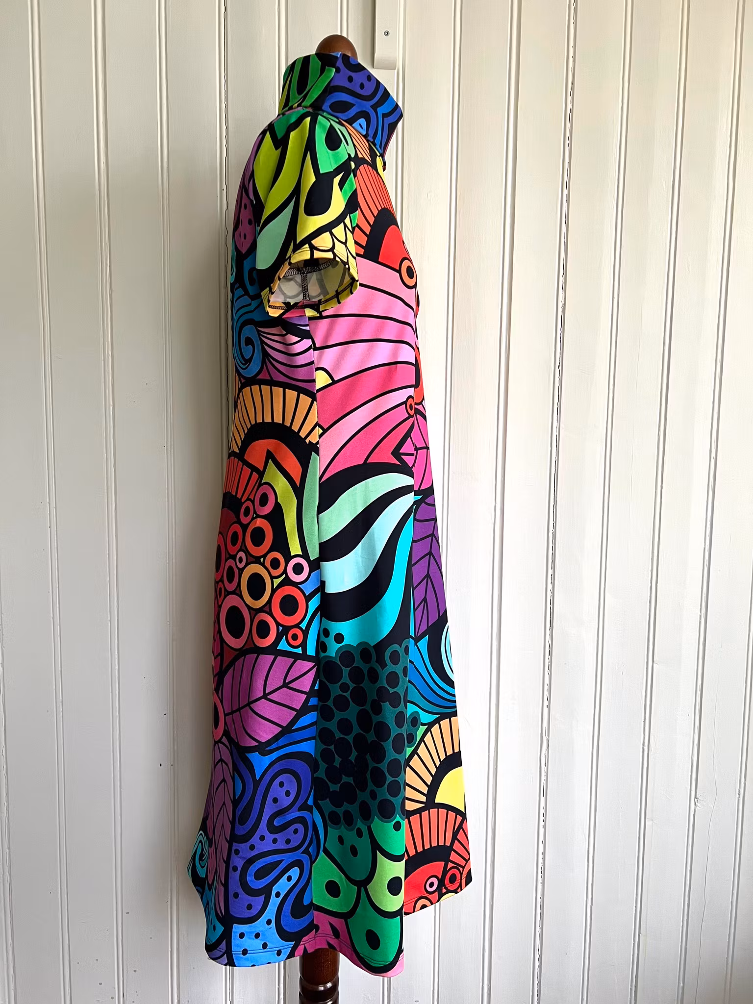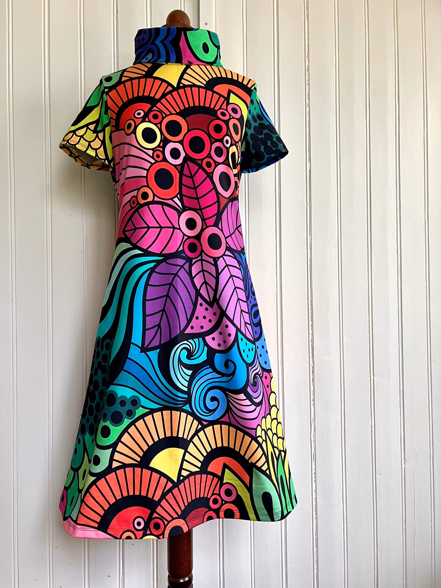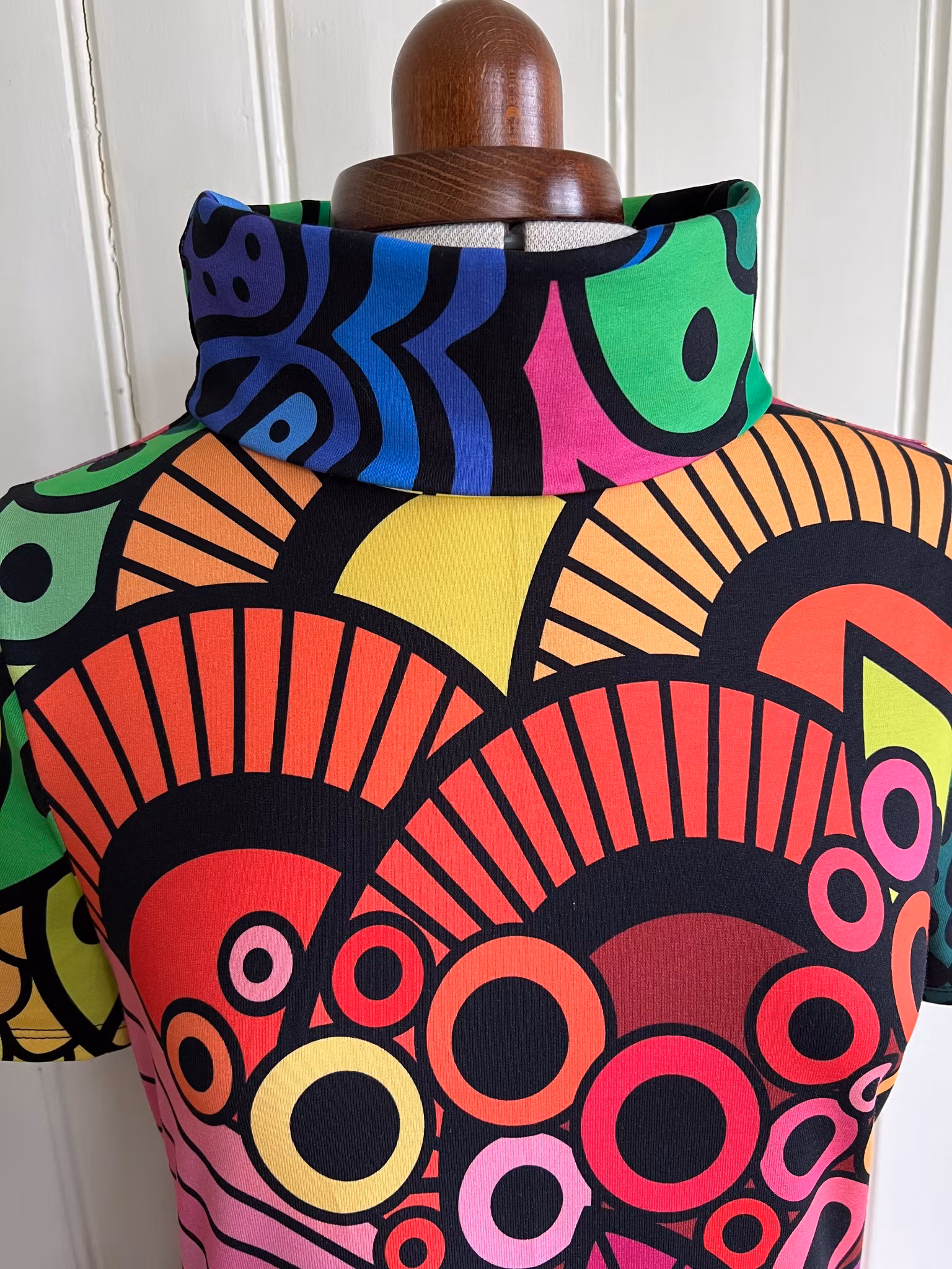 Klänning i A-linjemodell sydd i bomullsjersey, med hög krage som kan dubbelvikas. Sitter mer figurnära över bysten för att sedan få vidd över stussen. Kragen värmer skönt runt halsen utan att sitta åt. Tillhörande skärp i samma tyg.
