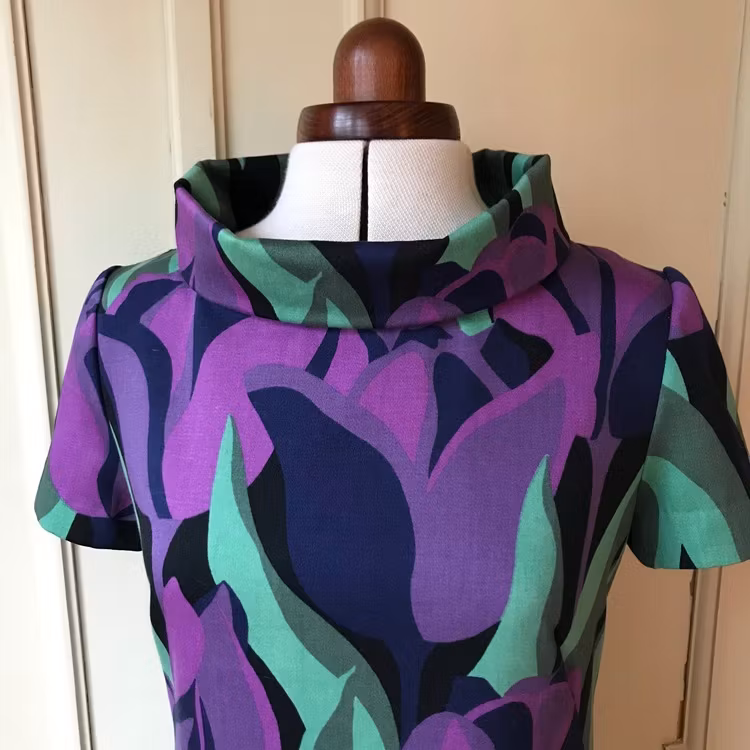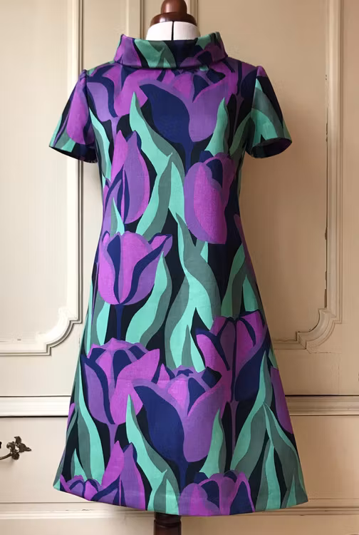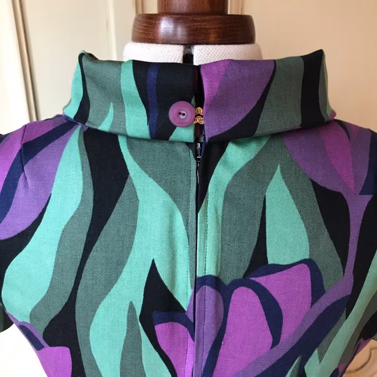 Klänning i svagt A-linjeformad modell med lite djupare bystinsnitt för mer figurnära linje. Hög mjuk krage som vikas ner och draperas på olika sätt. Den har en knappbak i kragen samt en lång dragkedja. Klänningen är sydd av ett äldre återbrukat tyg i fint skick. Materialet är mjuk fin bomullssatin med vacker lyster. Klänningen har dolda handsydda fållar på insidan av kragen, i ärm samt i klänningsslut.