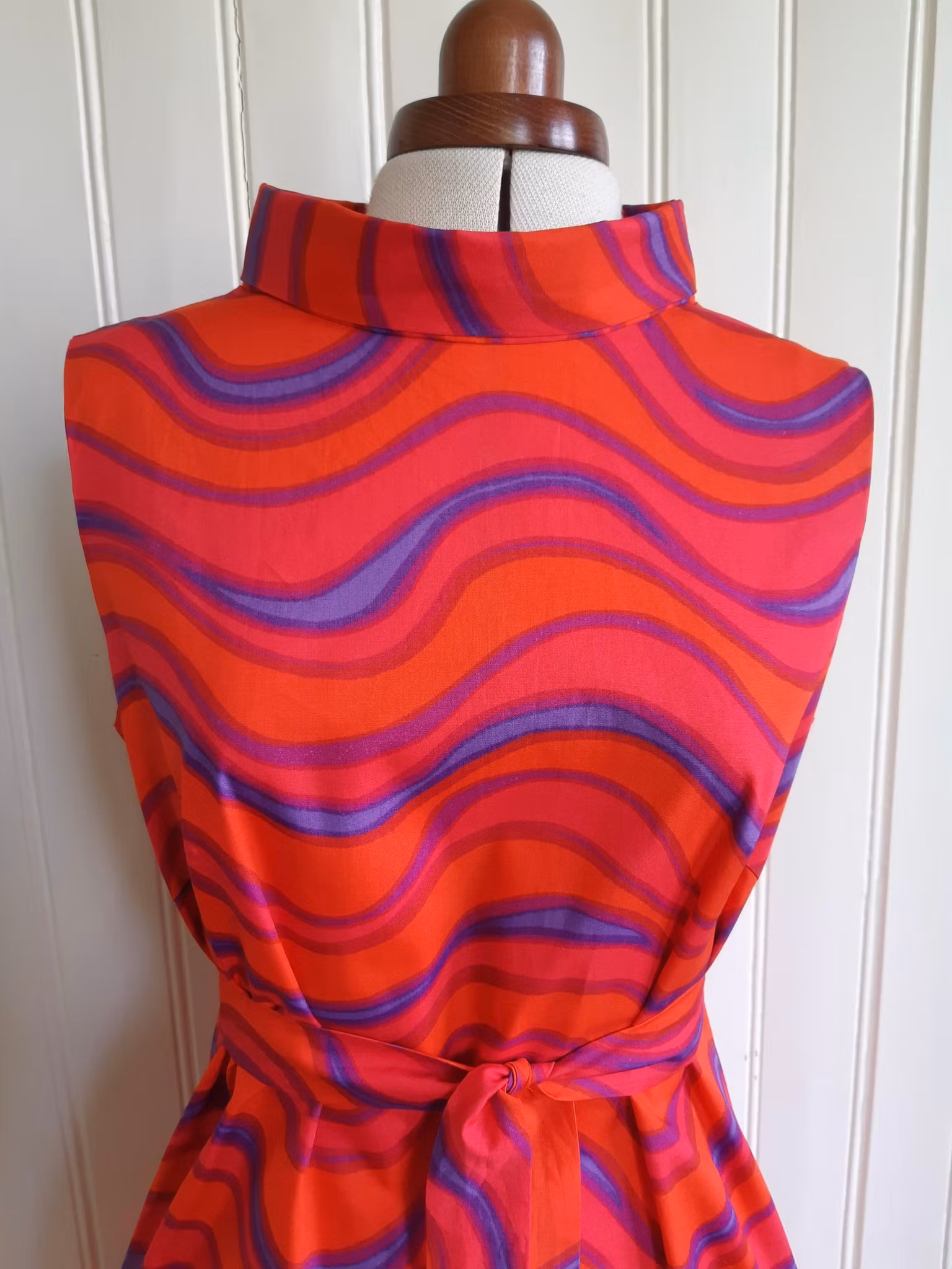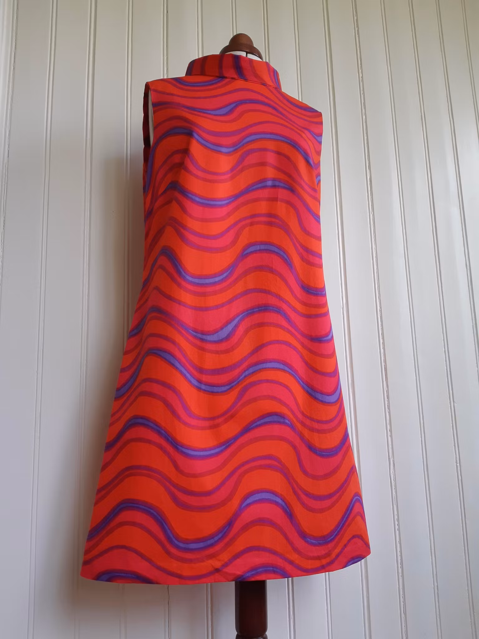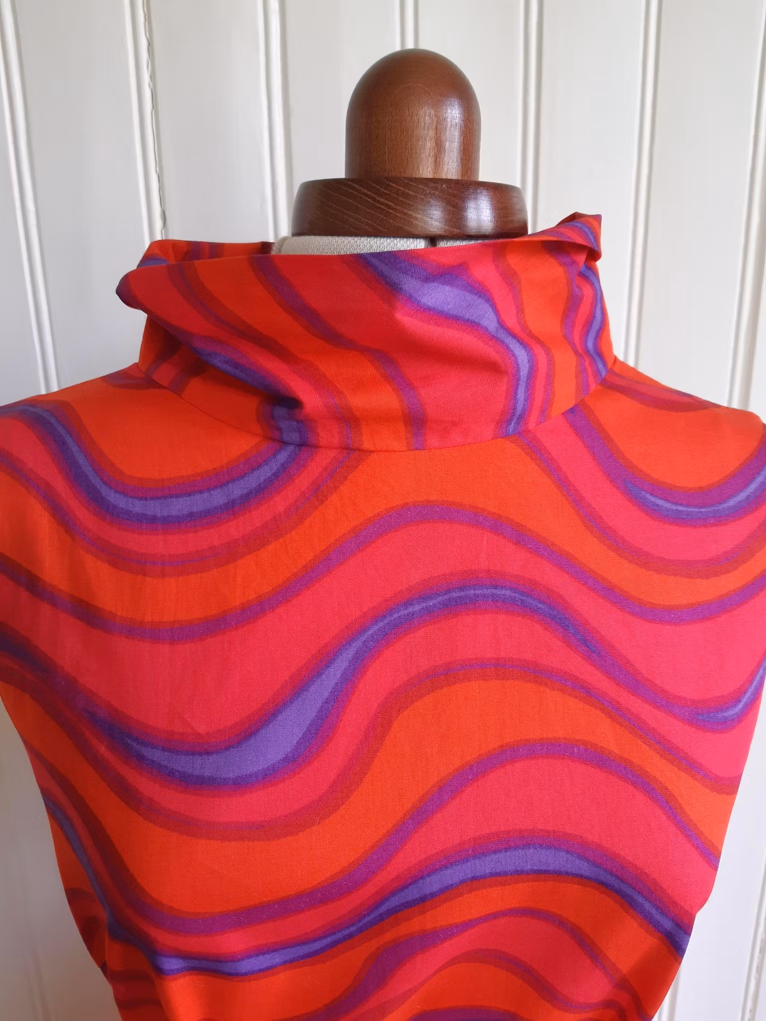 Klänningen är sydd i ett äkta retrotyg från 1960- eller 70-talet, i tunn tätvävd bomull, typ poplin. Tyget är tidigare oanvänt men upptvättat före sömnad. Klänningen bör därför inte krympa vid tvätt.