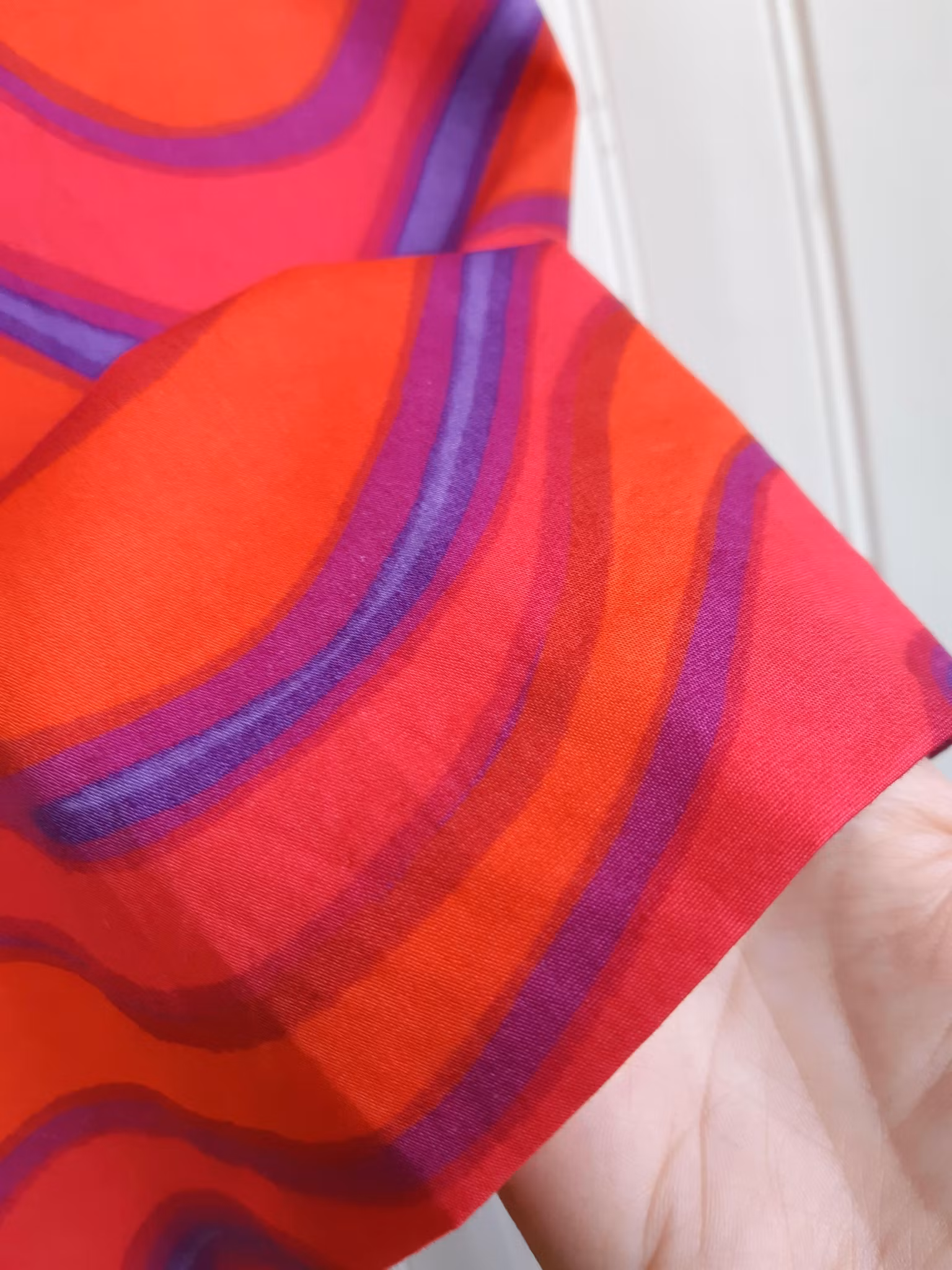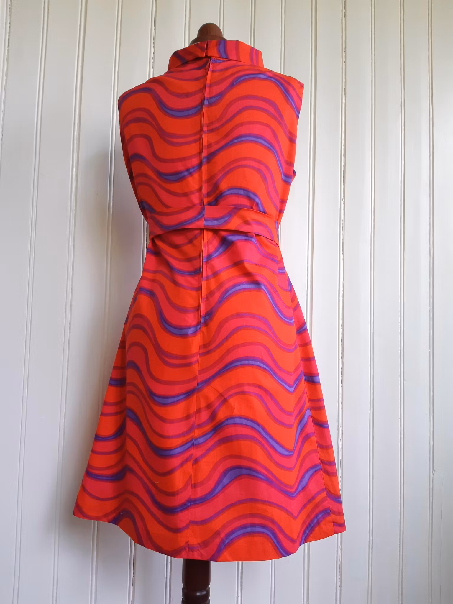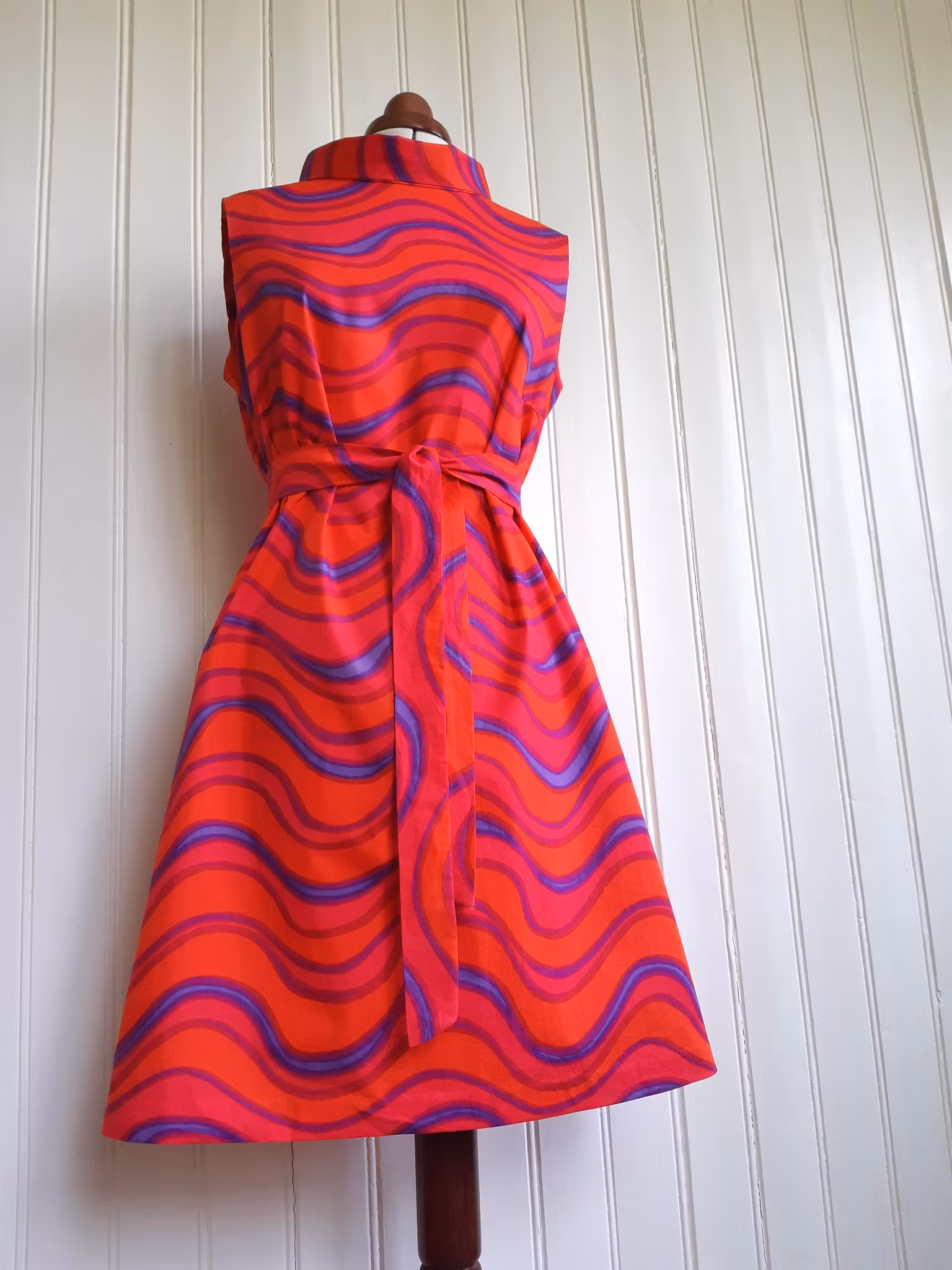 Klänningen är sydd i ett äkta retrotyg från 1960- eller 70-talet, i tunn tätvävd bomull, typ poplin. Tyget är tidigare oanvänt men upptvättat före sömnad. Klänningen bör därför inte krympa vid tvätt.