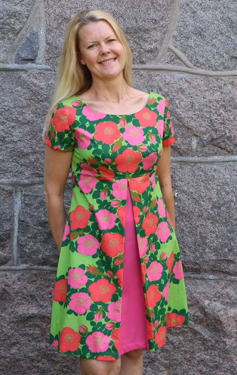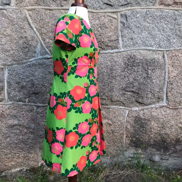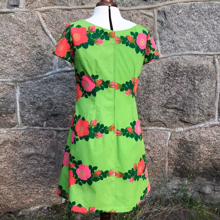 Klänning med djupare halsringning, avskuren under bysten och med ett motveck fram med matchande tyg infällt. Den har dold dragkedja bak och kort ärm. Klänningen är sydd av ett före detta gardintyg i tunnare bomull från 1960- eller 70-talet, i mycket fint skick. Tyget i motvecket är också återbrukat och i bomull, eventuellt med ett litet inslag av polyester. Klänningen har dolda handsydda sömmar i ärmar och nertill.