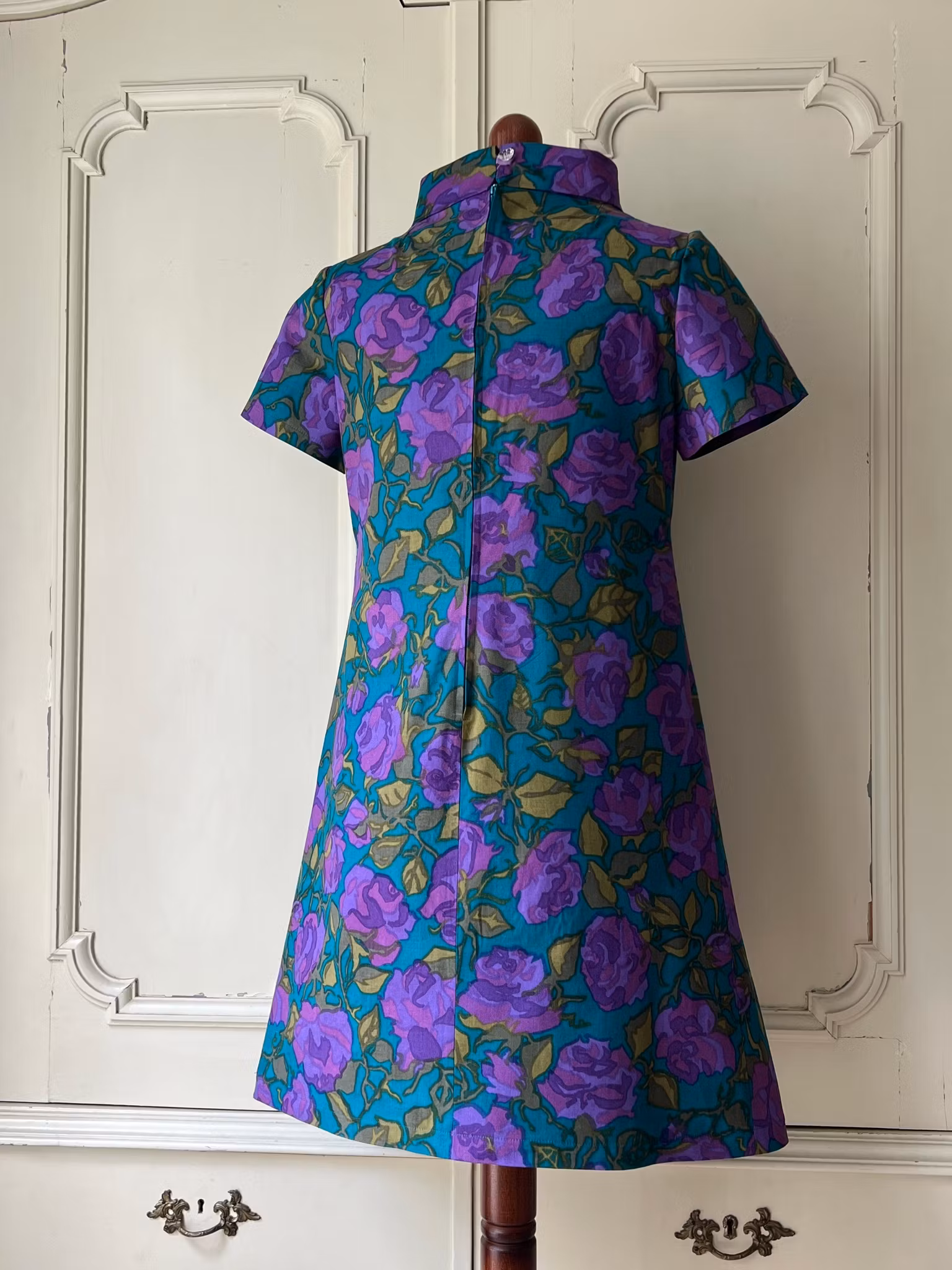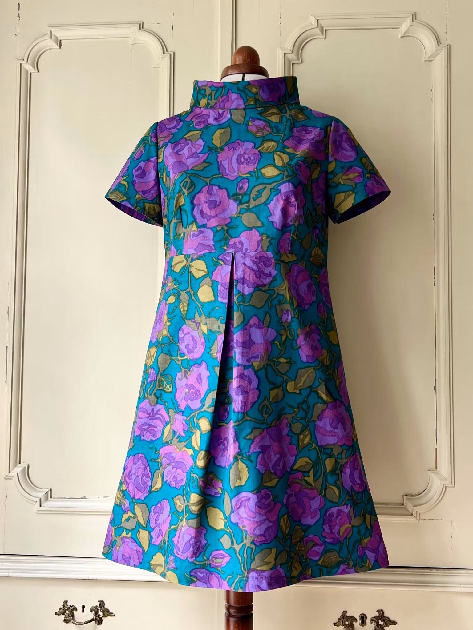 Klänning sydd i A-linjemodell i vävd bomull, avskuren under bysten och med ett fint motveck mitt fram. Klänningen har också en lite vidare ståkrage som dubbelviks och har en liten knapp bak som håller ihop den. Lång dragkedja bak.