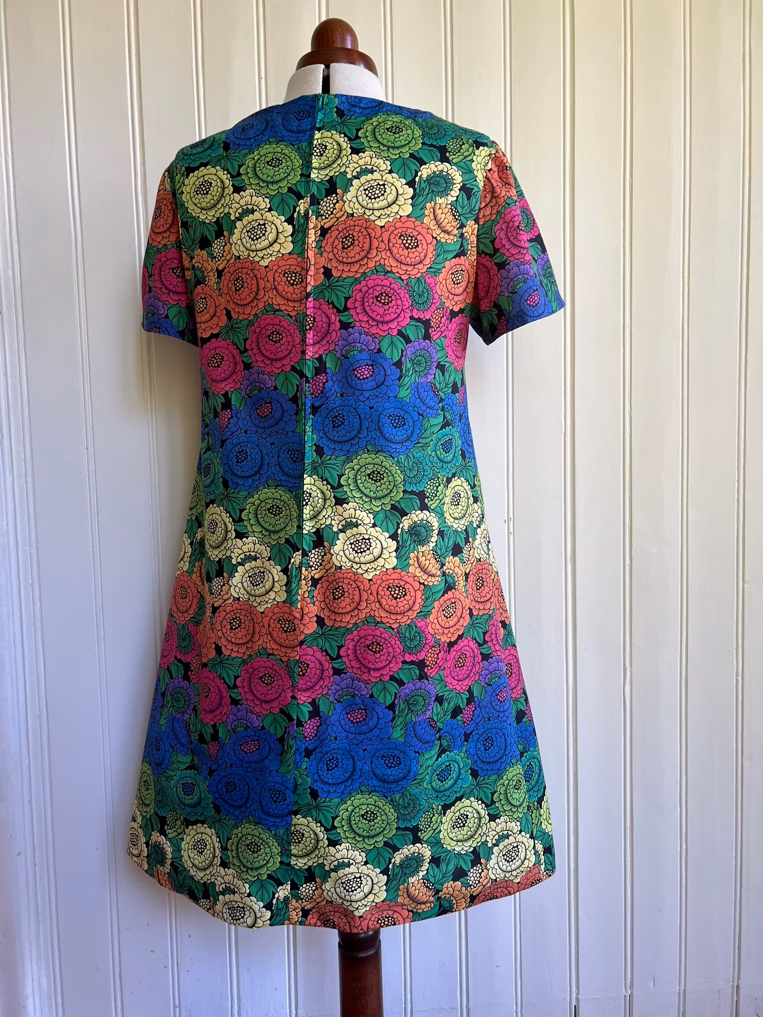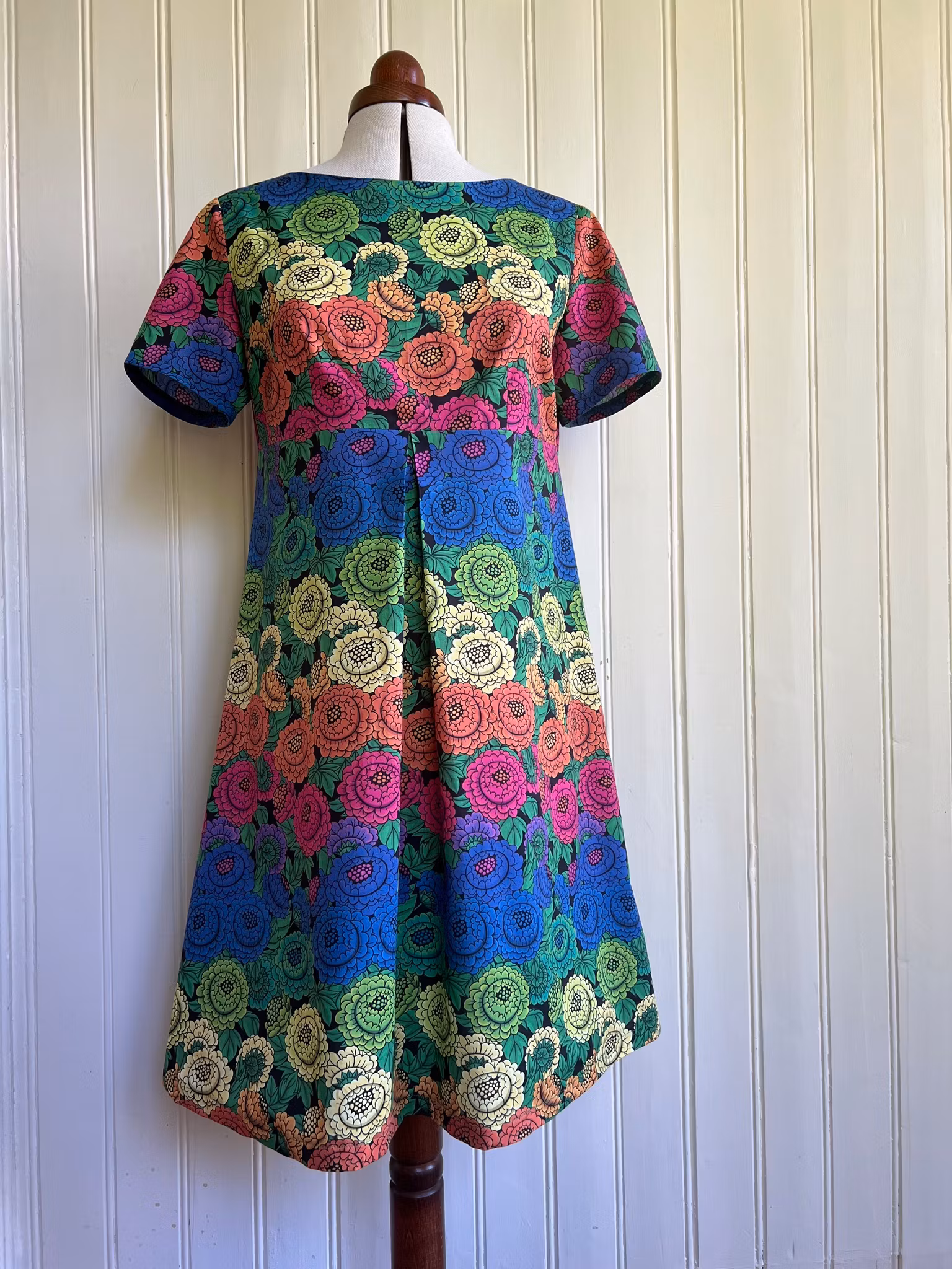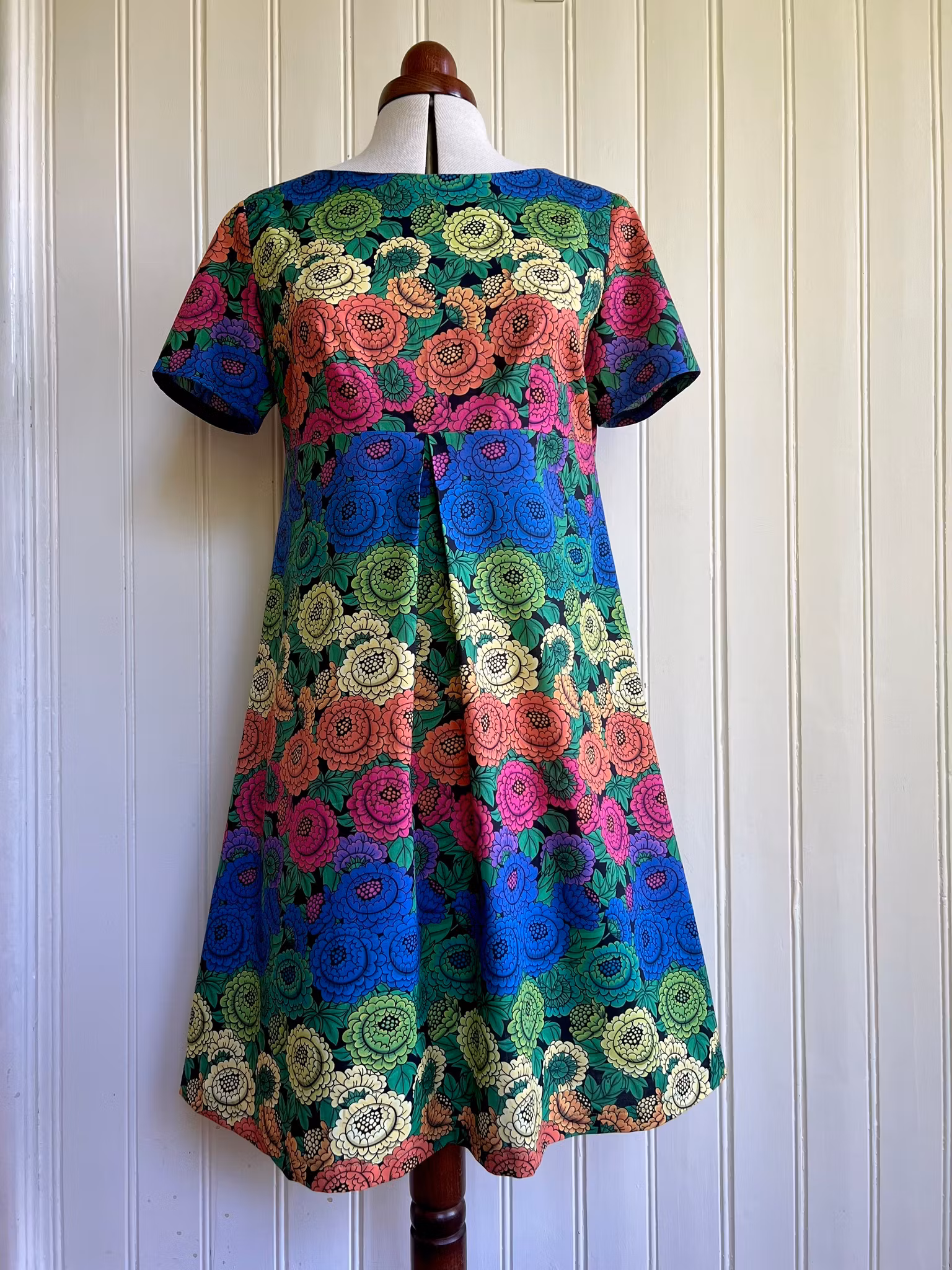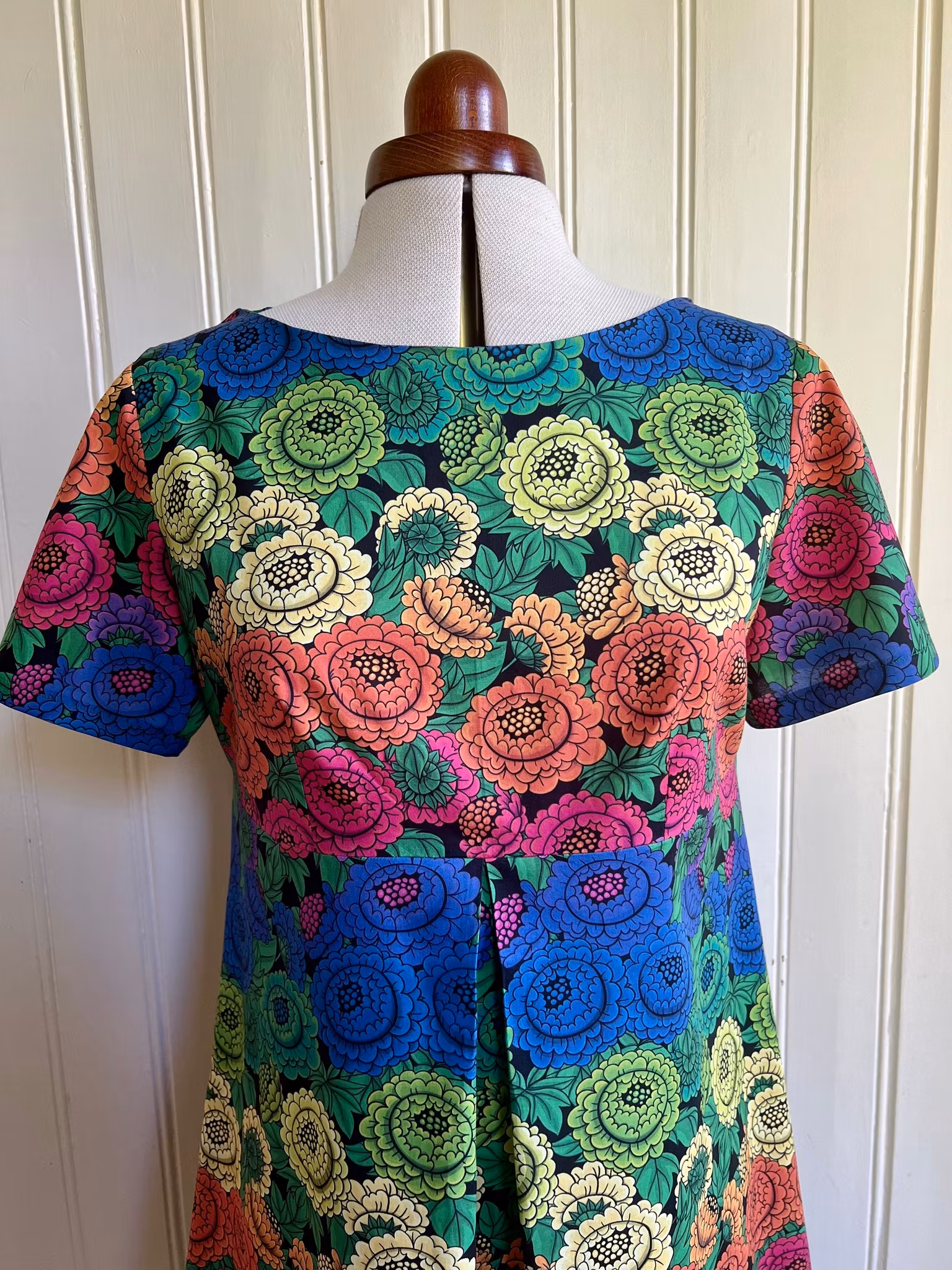 Klänning i vävt bomullstyg i A-linjemodell, avskuren under bysten samt med motveck mitt fram. Båtringning i halsen och med kort ärm. Lång dragkedja i ryggen.