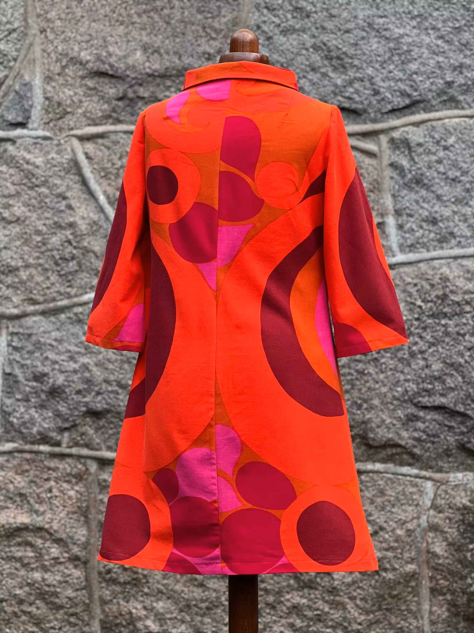 Klänning i A-linjemodell sydd i ett äkta retrotyg från 1960- eller 70-talet, i vävd bomull.