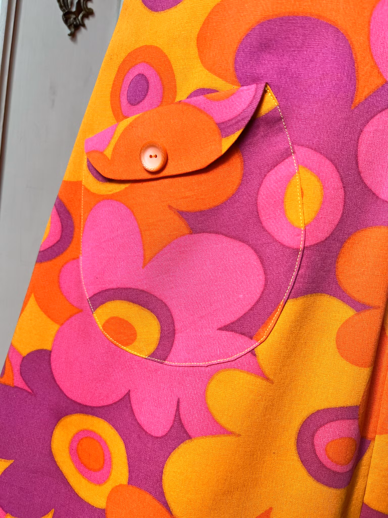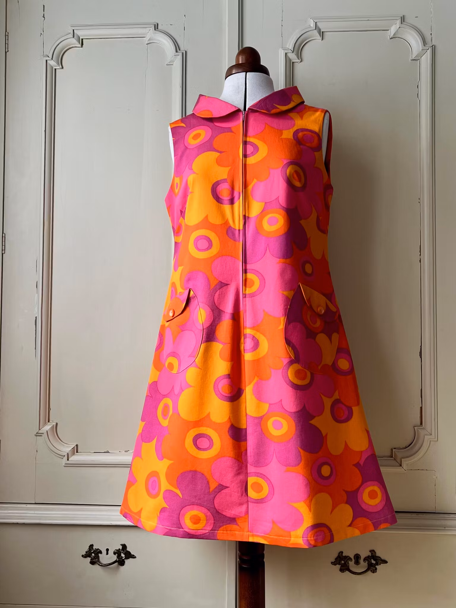 Klänningen har en fin rundad krage och lång dragkedja fram. Den har också tidstypiska runda, snedställda fickor fram.