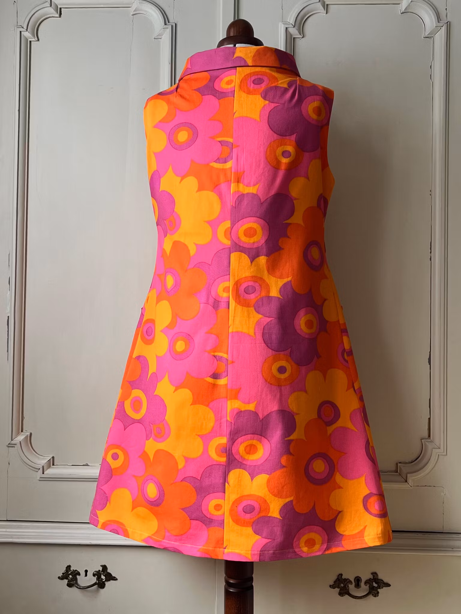 Klänning sydd i A-linjemodell i ett äkta retrotyg från 1960-talet i karamelliga toner, vävd bomull.