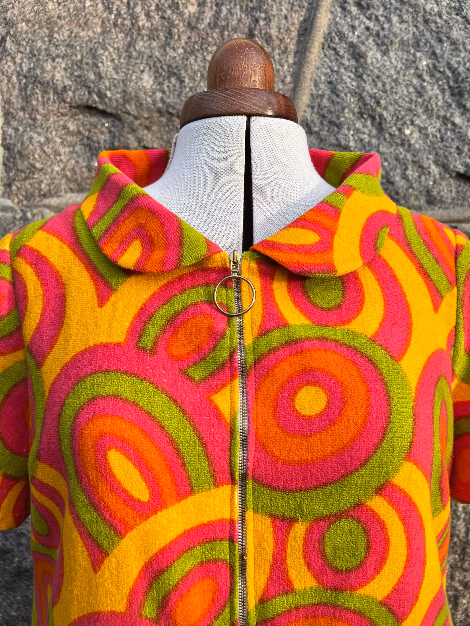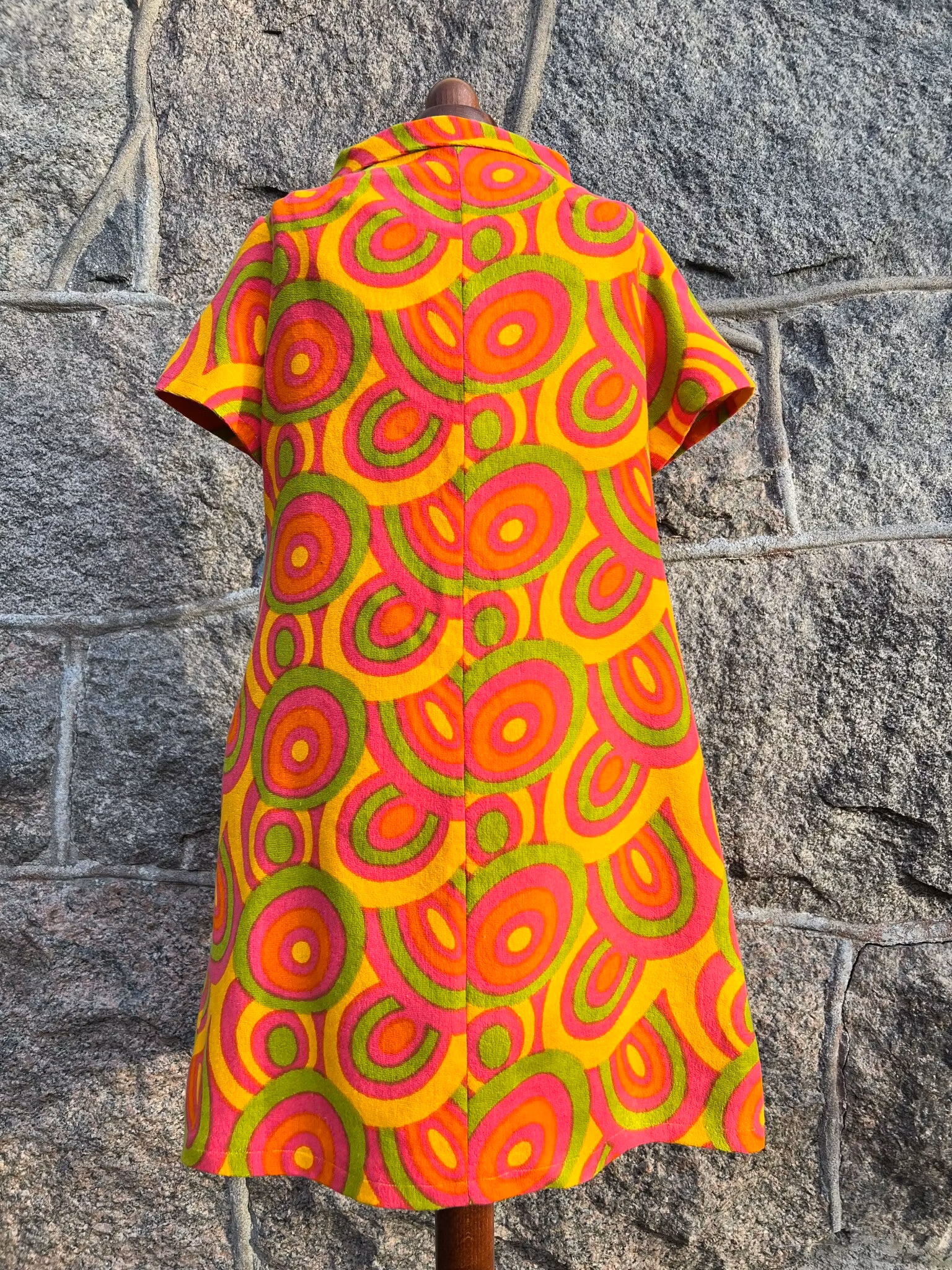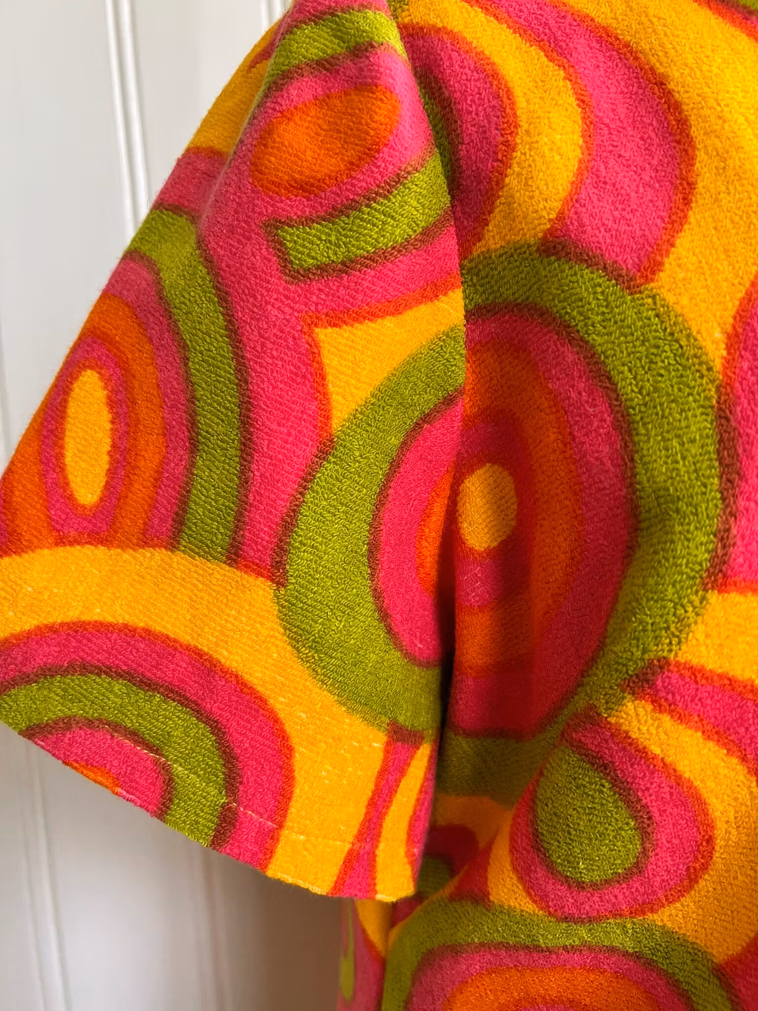 Klänning i A-linjemodell sydd i ett äkta retrotyg, troligtvis från 1960-talet, i vävd bomullsfrotté.