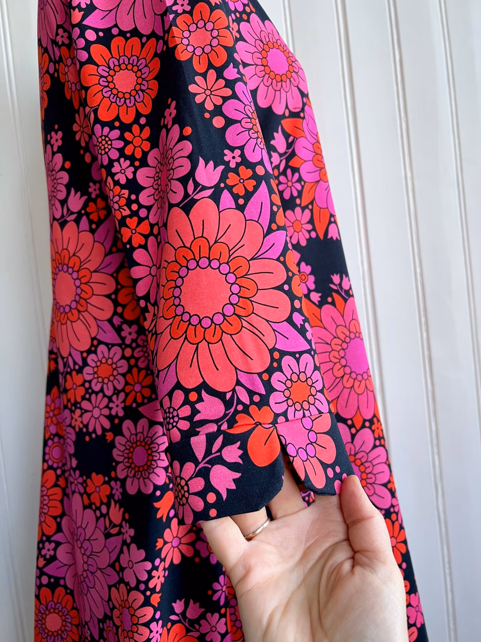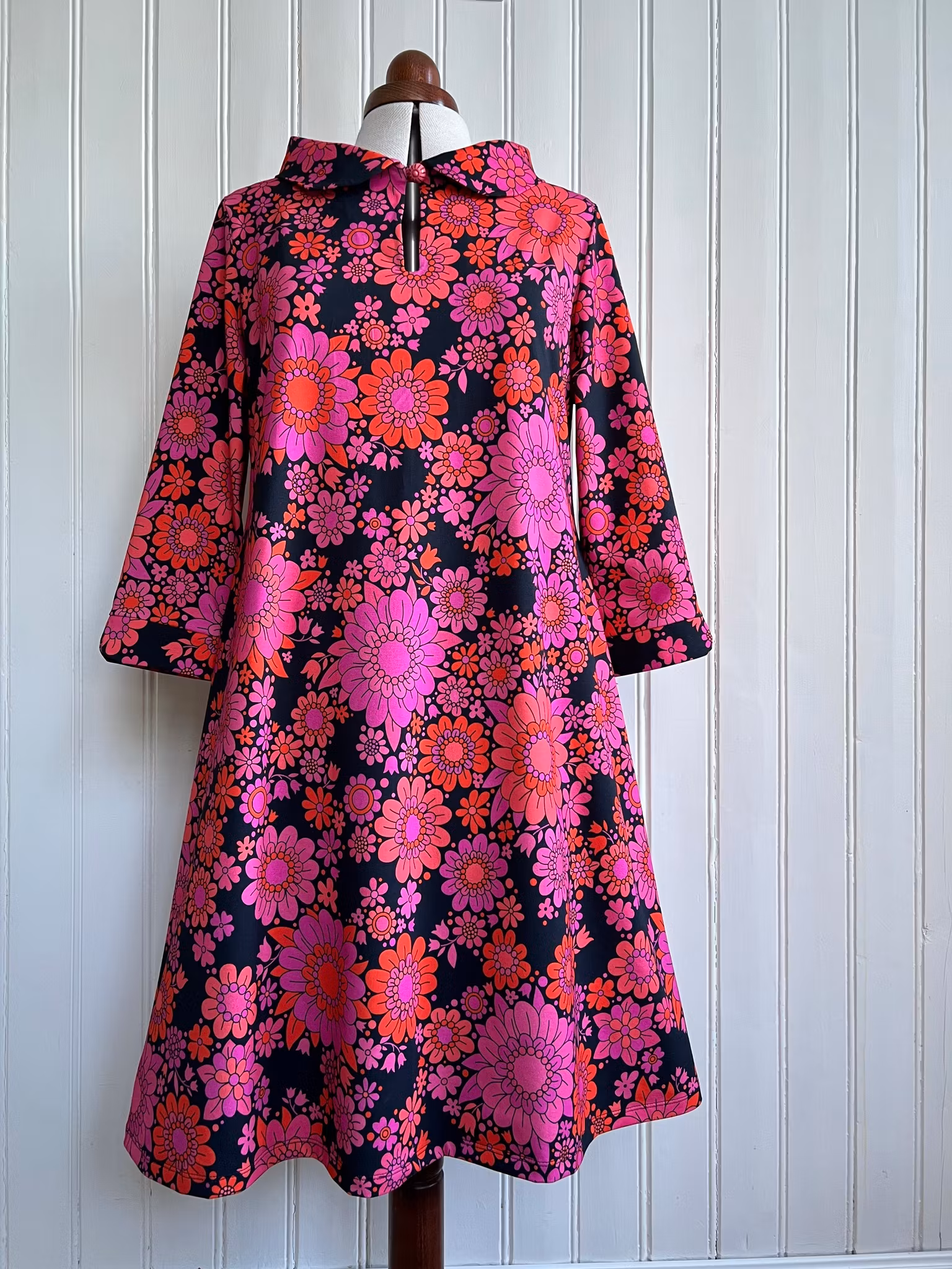 Klänning sydd i A-linjemodell sydd i mjuk skön bomullsjersey, med mycket vidd i kjolen. Fin rundad krage som hålls ihop med en knapp och med ett litet sprund under. 3/4-dels lång ärm med rundad delning som avslut.