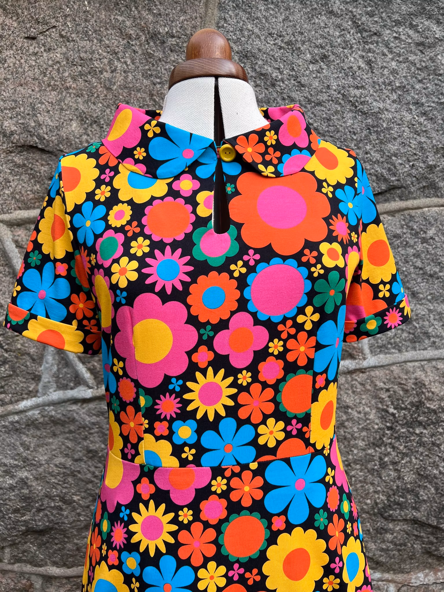 Tygets mönster är designat av Shalmiak och heter Bloom Pop. Material 95 % bomull och 5 % elastan.