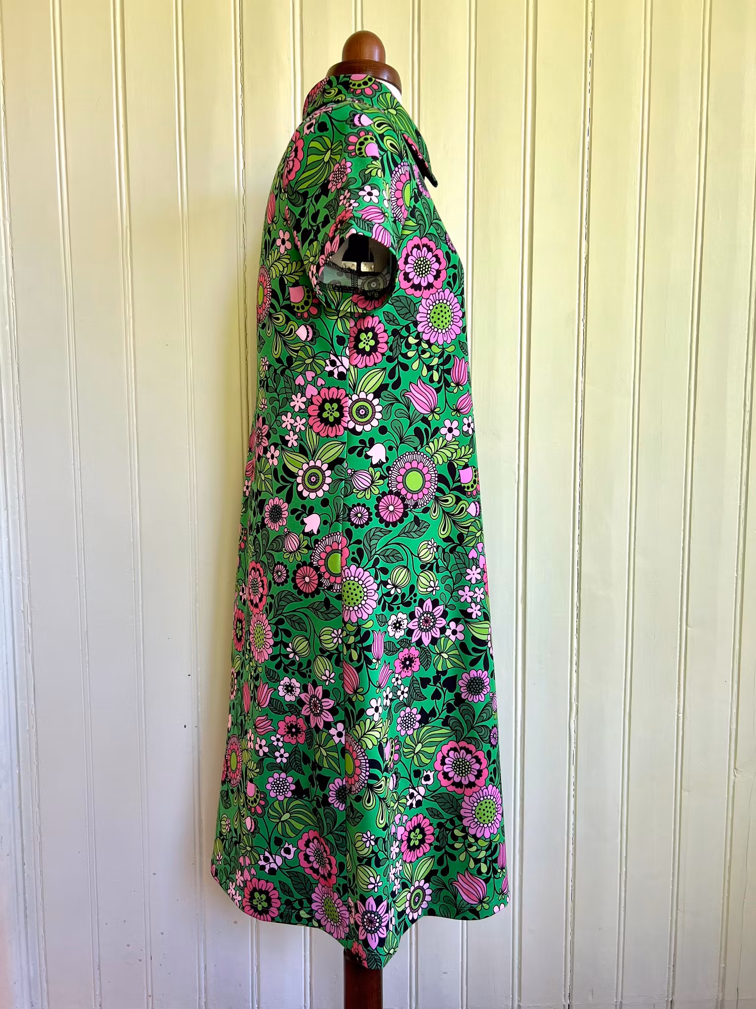 Klänning sydd i mjuk härlig bomullsjersey, i A-linjemodell. Den har fin rundad krage och ringningen hålls ihop med en knapp upptill.