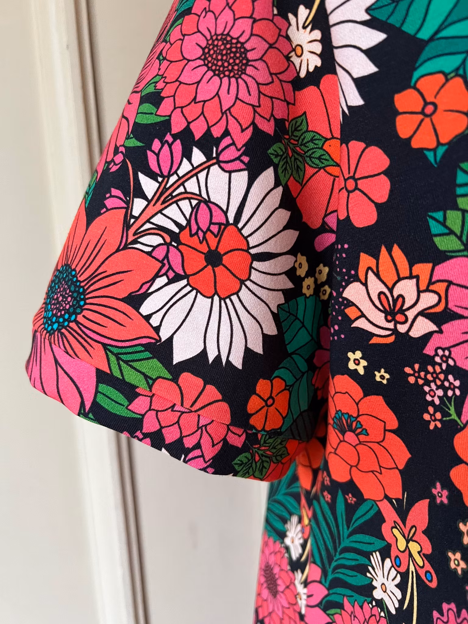 Tyget är designat av Taika Tori för Vintage in my heart. Materialet är bomullsjersey med stretch, 95 % bomull, 5 % elastan. Tvättråd fintvätt 40 grader, torktumlas ej. Krympmån 4 %.