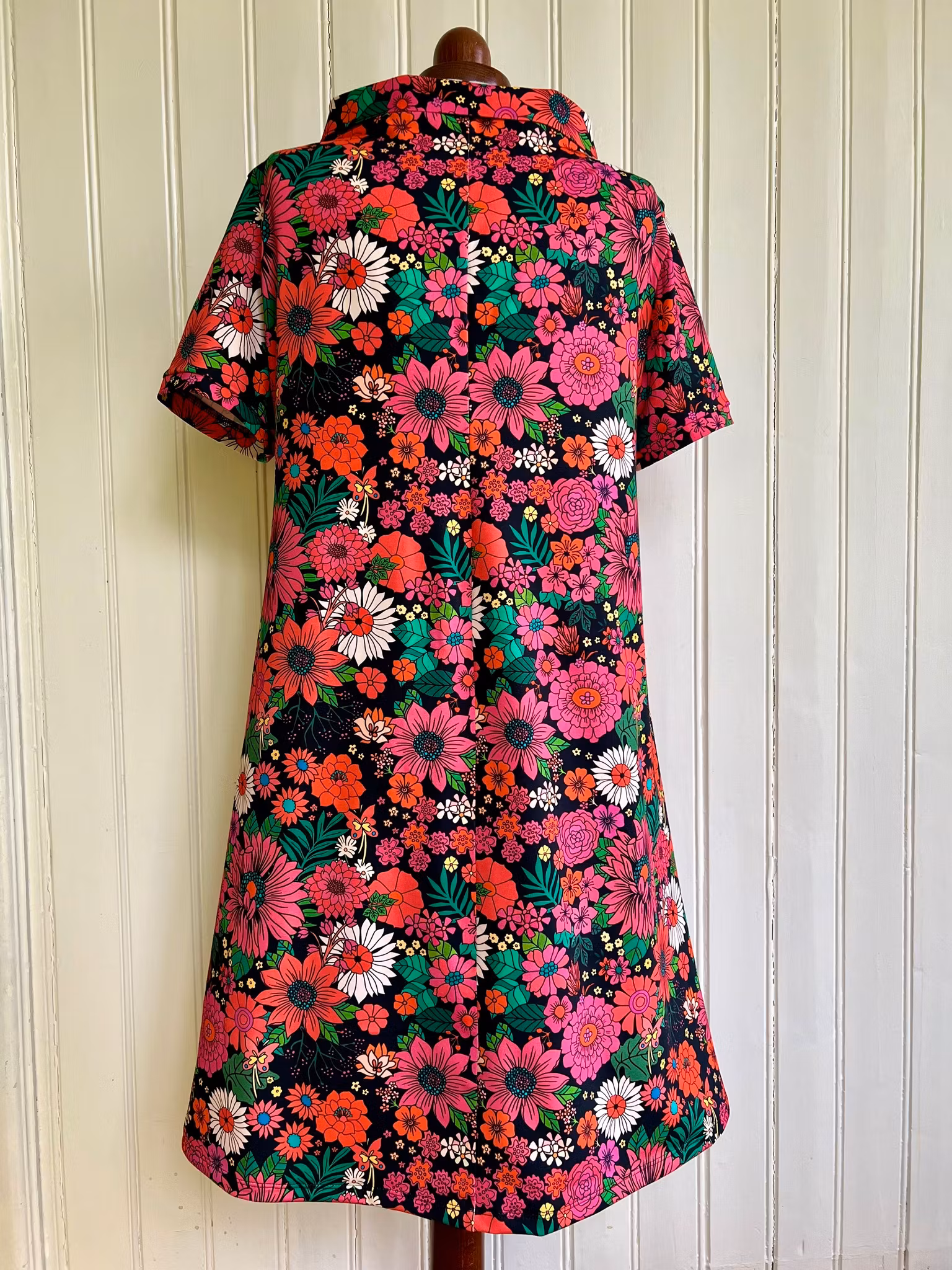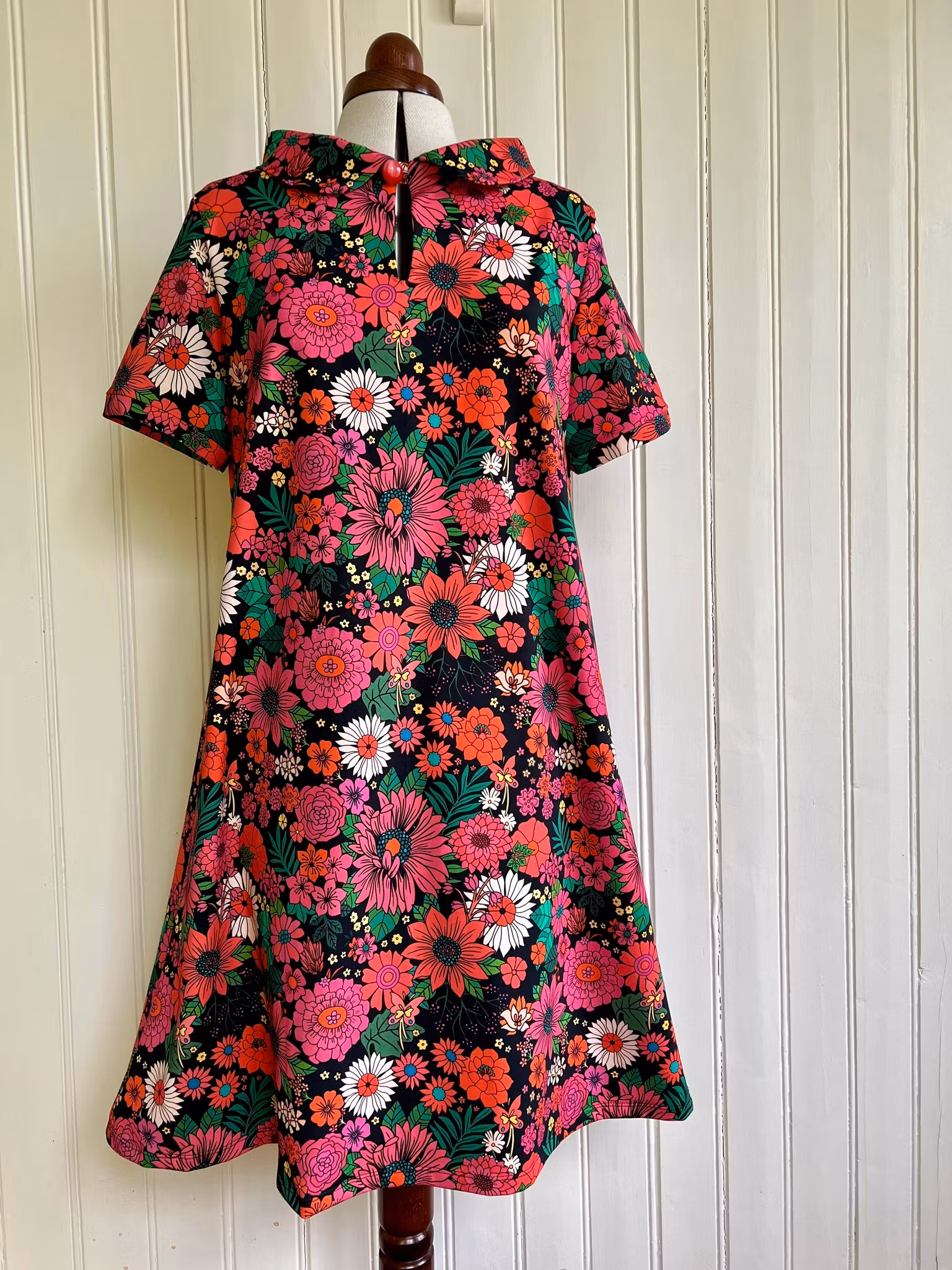Klänning i A-linjemodell sydd i mjuk och härlig bomullsjersey. Klänningen har en rundad krage och en knapp framtill som håller ihop ringningen och utgör en fin detalj. Den har kort ärm.